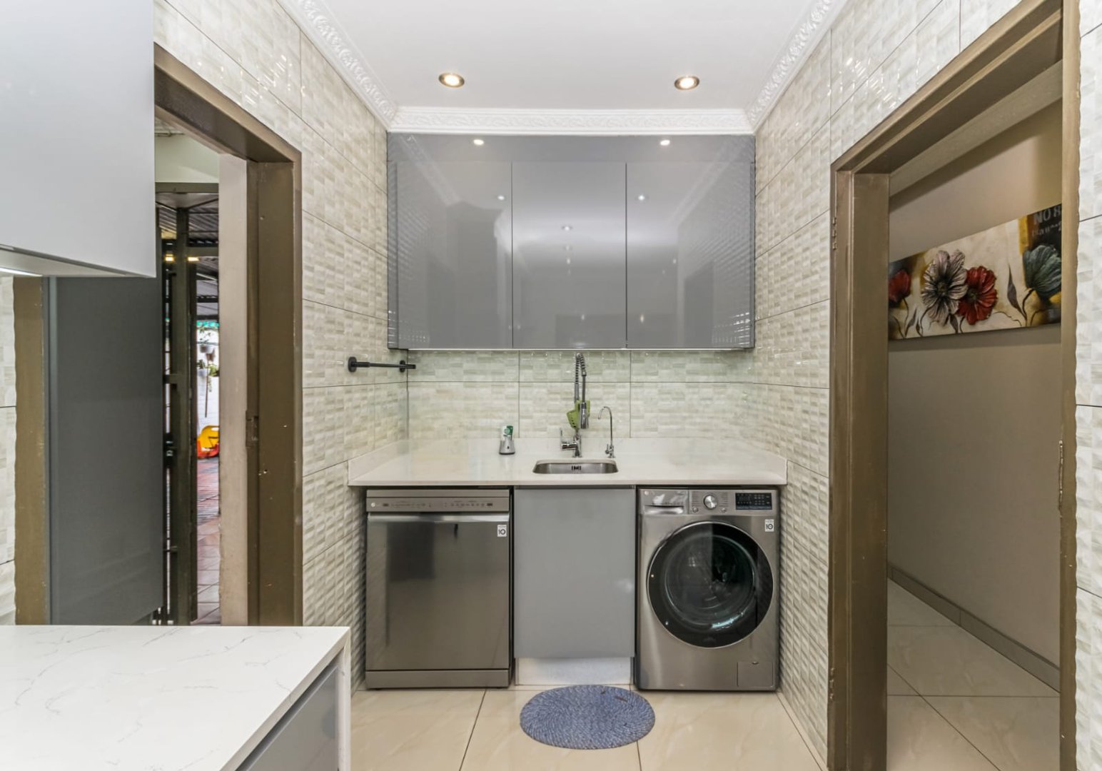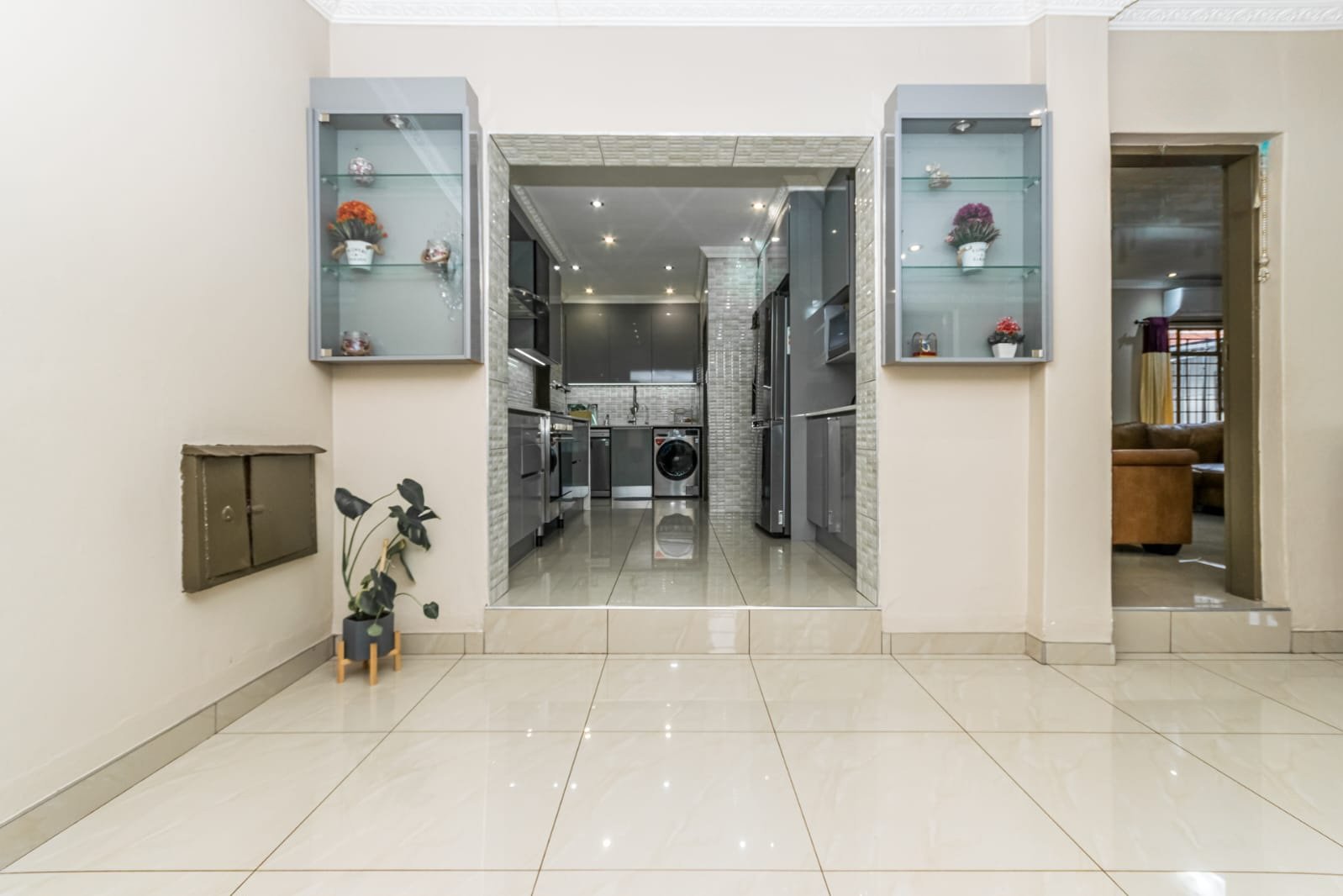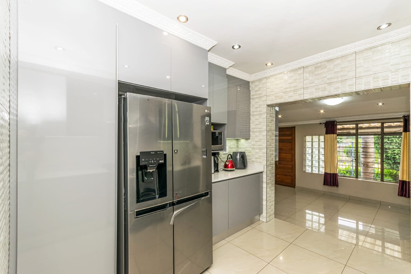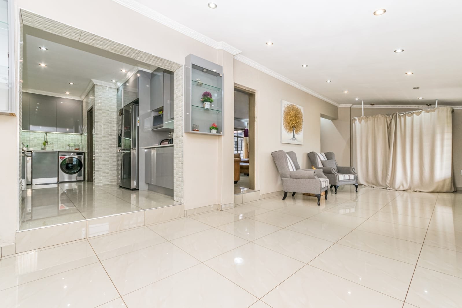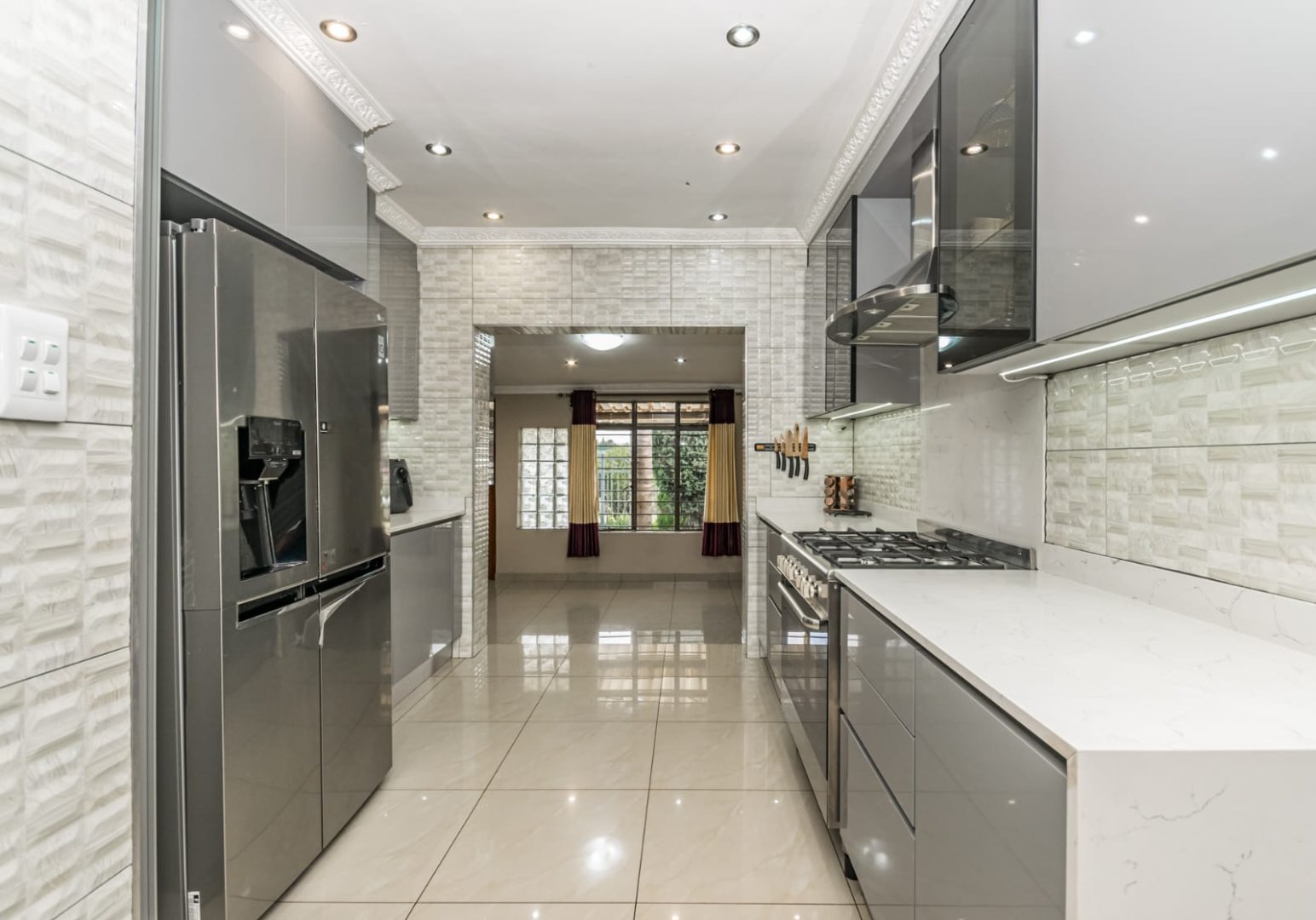 Open plan living area a flowing layout that combines the lounge and dining areas, all beautifully tiled for easy maintenance and a modern aesthetic. Designer kitchen equipped with stunning Caesarstone countertops, a gas stove, modern appliance fittings, and an abundance of built-in cupboards, including elegant glass-front cabinets.