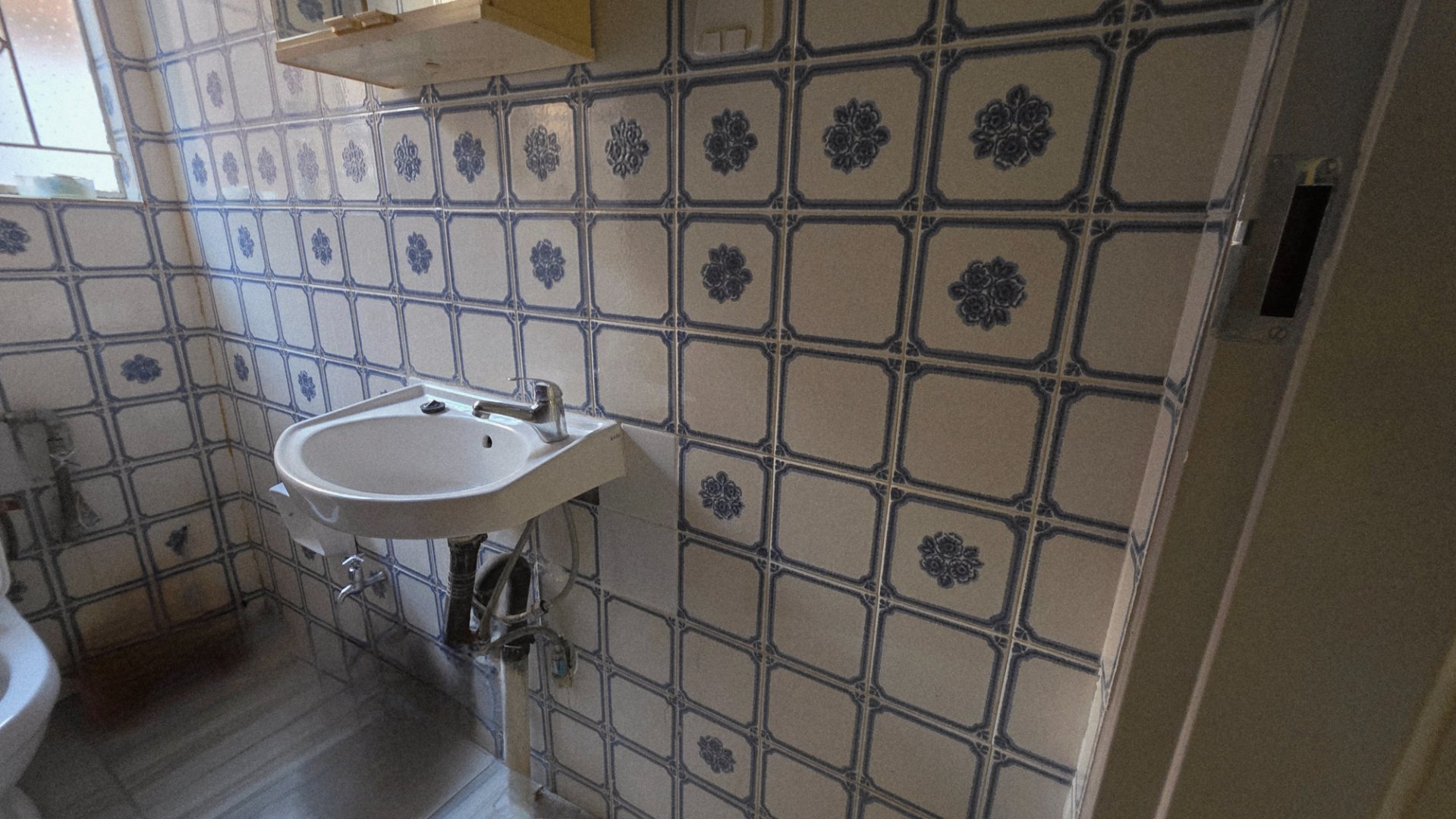 Tiled kitchen with built-in cupboards, stove & basin, with door to the backyard.