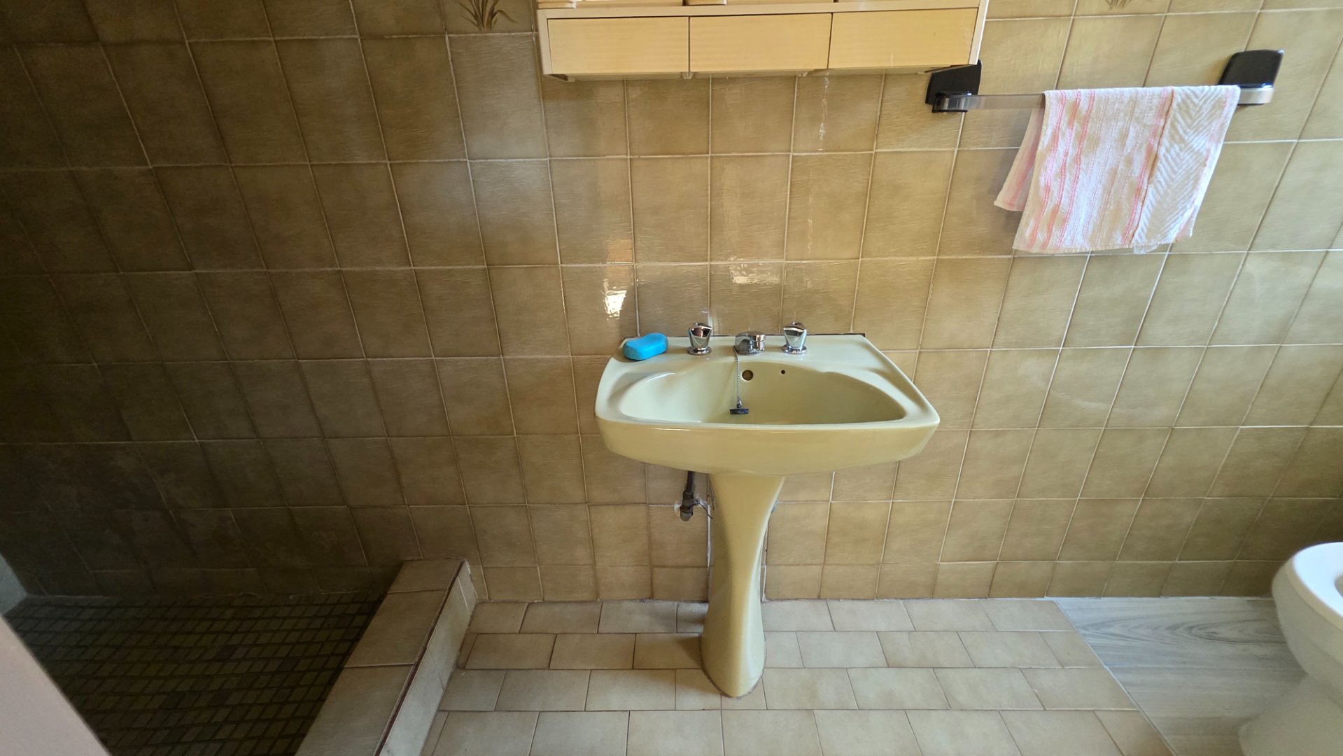 Tiled kitchen with built-in cupboards, scullery & pantry.