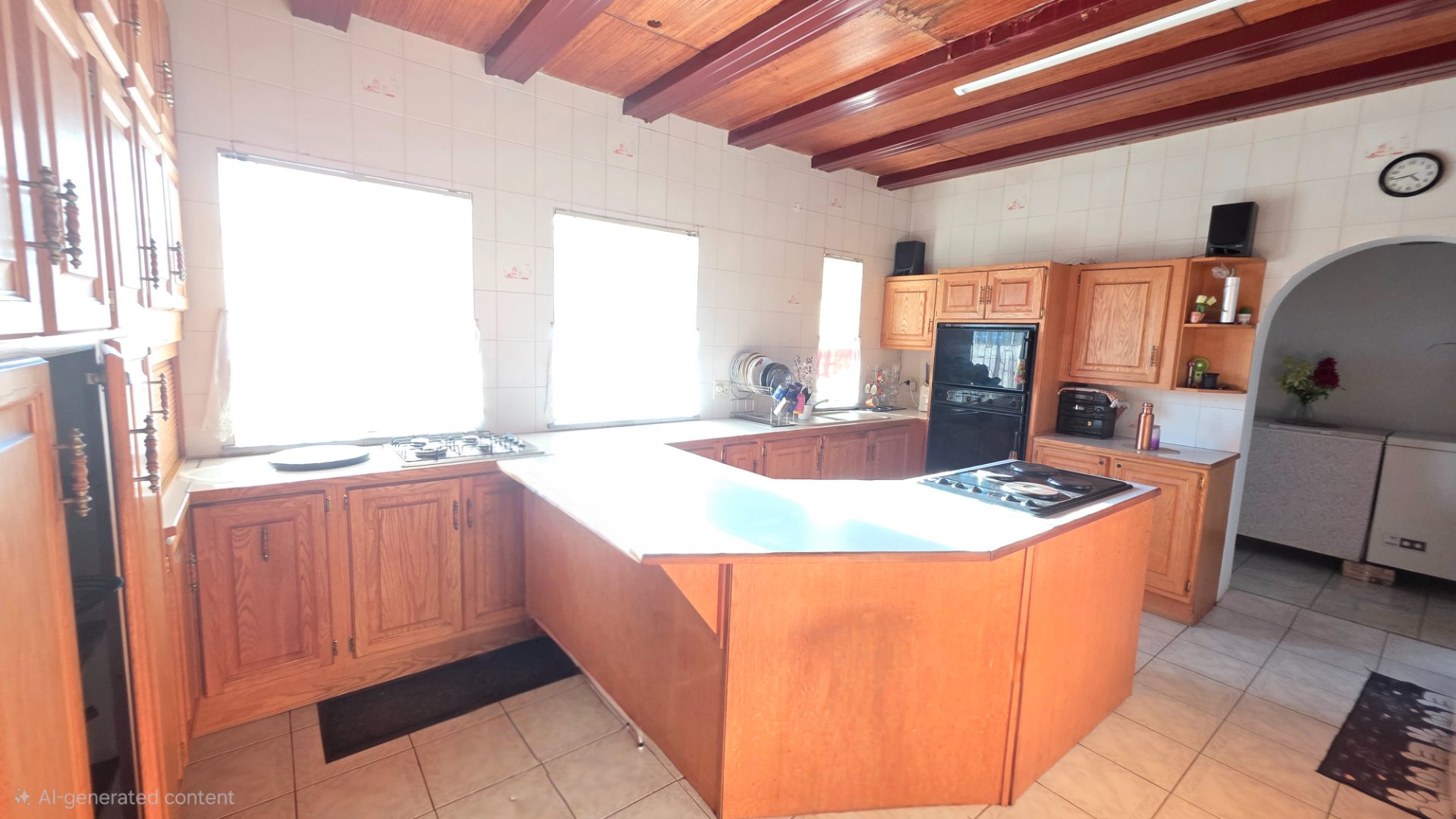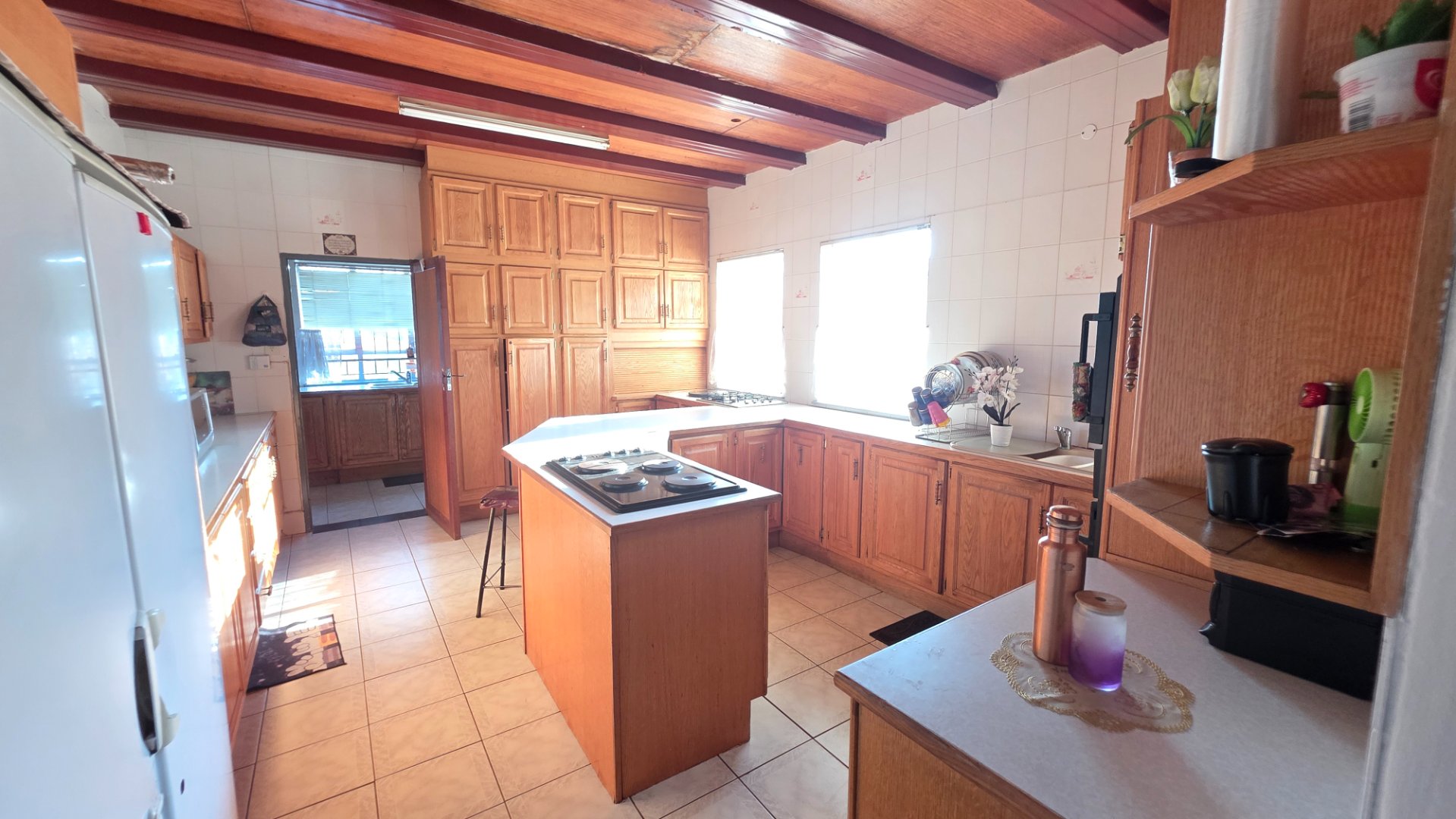 Kitchen fitted with built-in cupboards, solid workspace, gas and electric stove, double oven, and a scullery for added convenience.