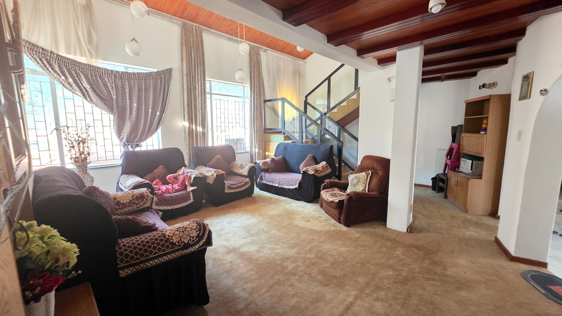 Main House ,open plan lounge with high ceilings and cozy carpeting, creating a warm and inviting atmosphere.