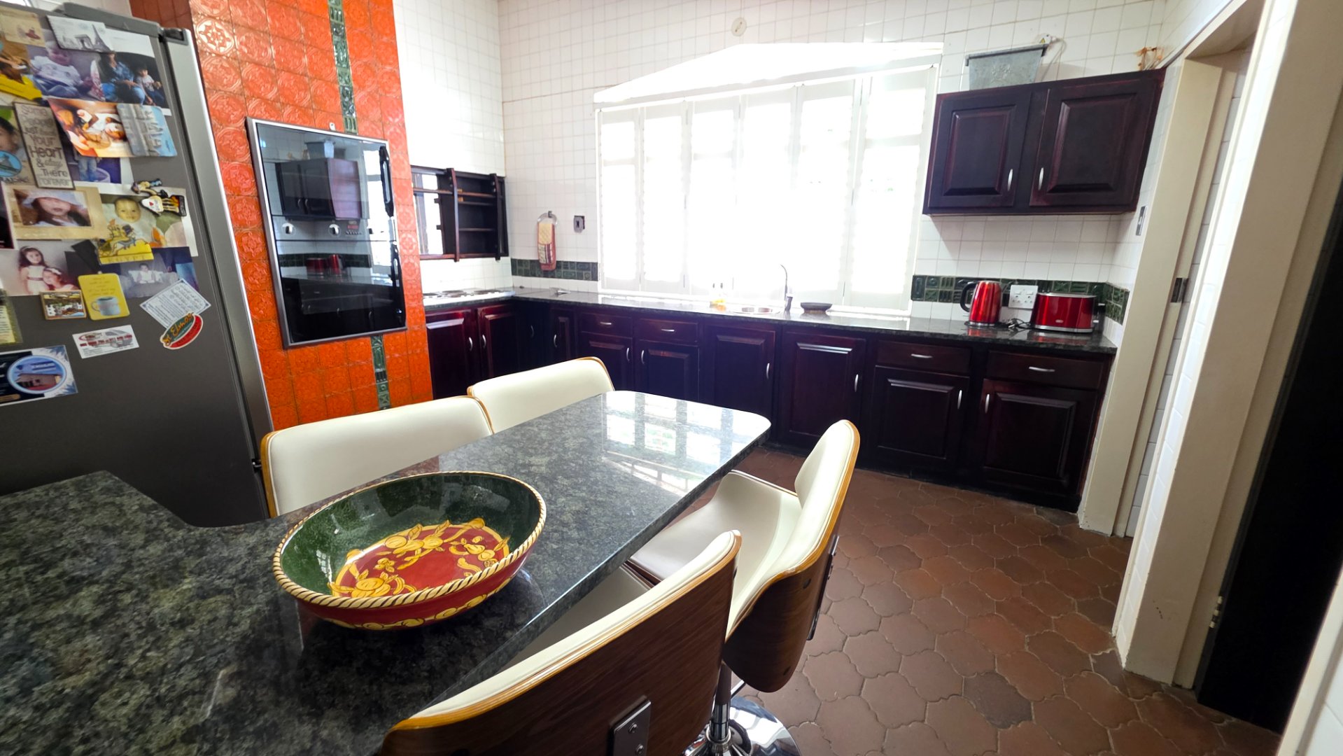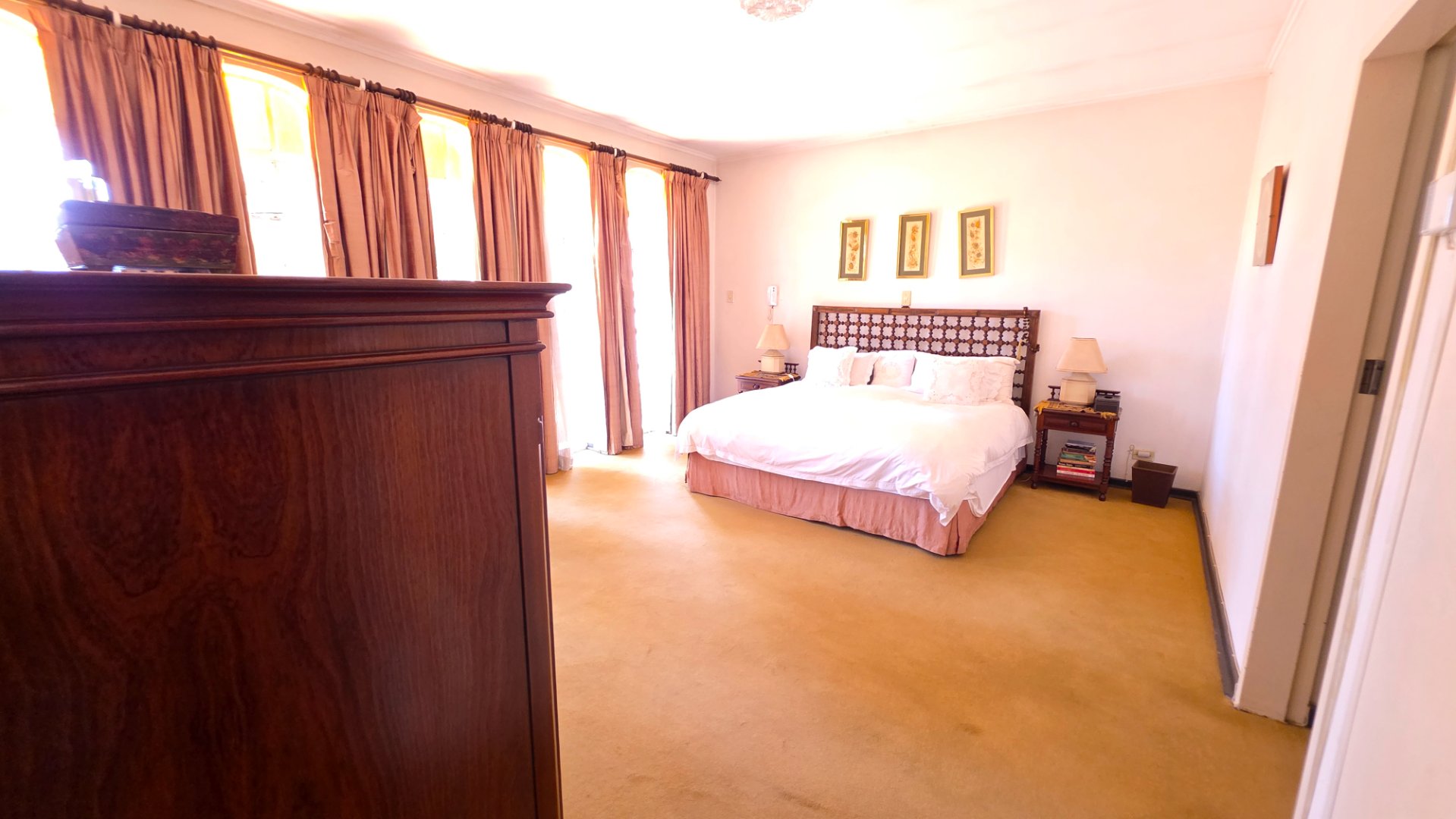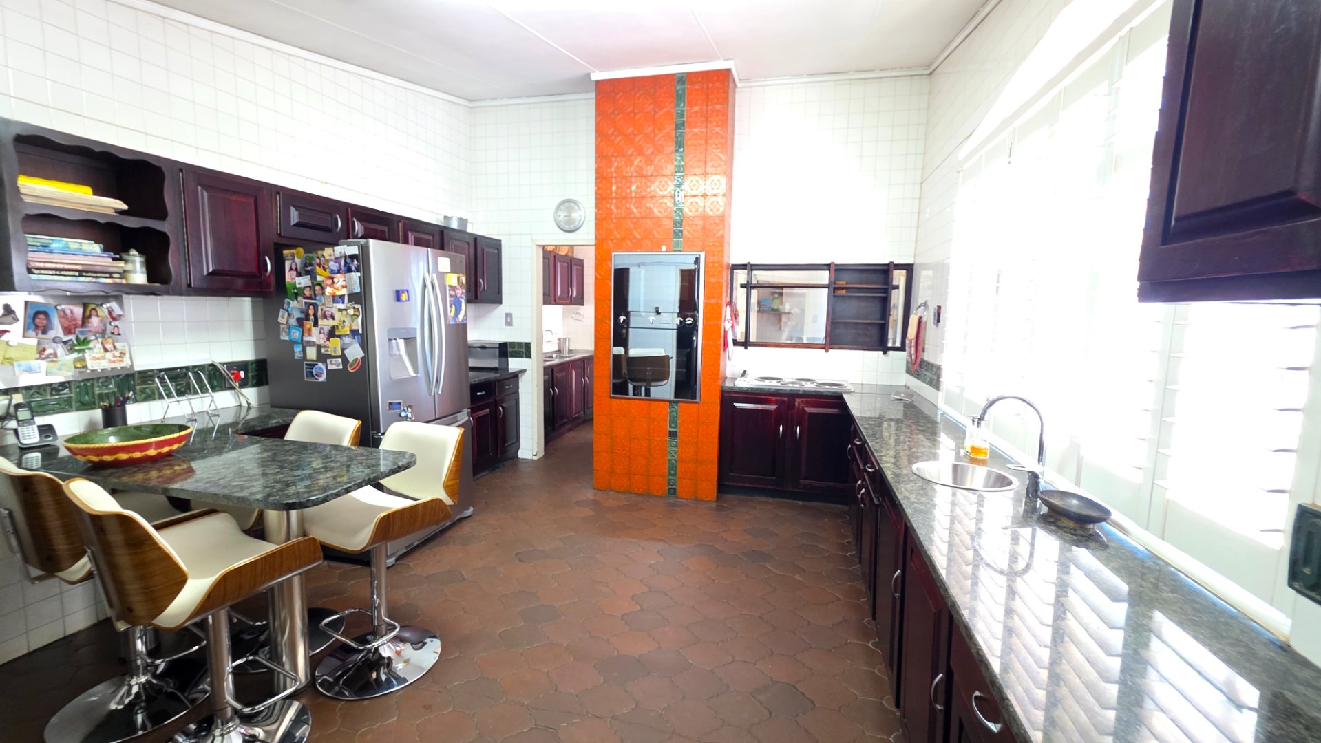 The home has three living areas including an entrance lounge a TV lounge with a divider door leading to the backyard and a dining room with a marble basin. There is also a study and a breakfast area with a built in table. The kitchen is fully fitted with granite tops a double electric oven an electric stove a pantry and a scullery laundry area.