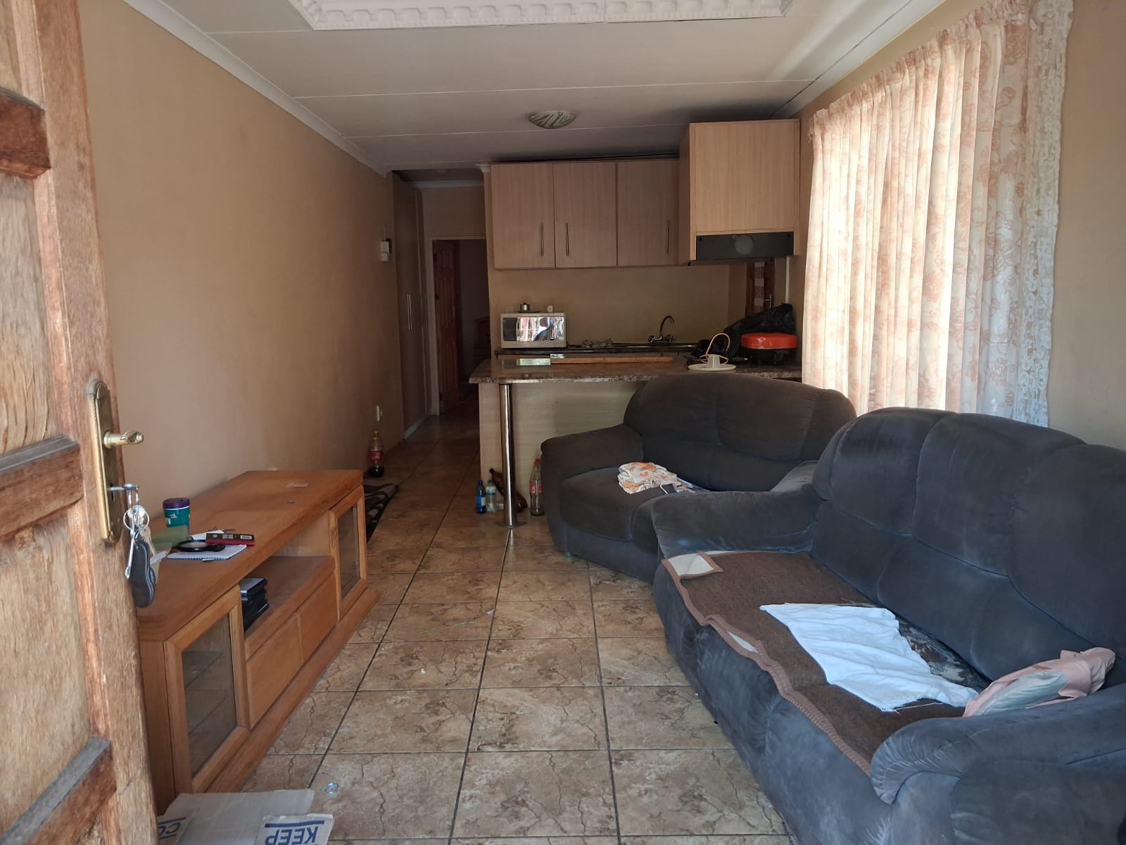 Open-plan lounge and kitchen with cupboard space