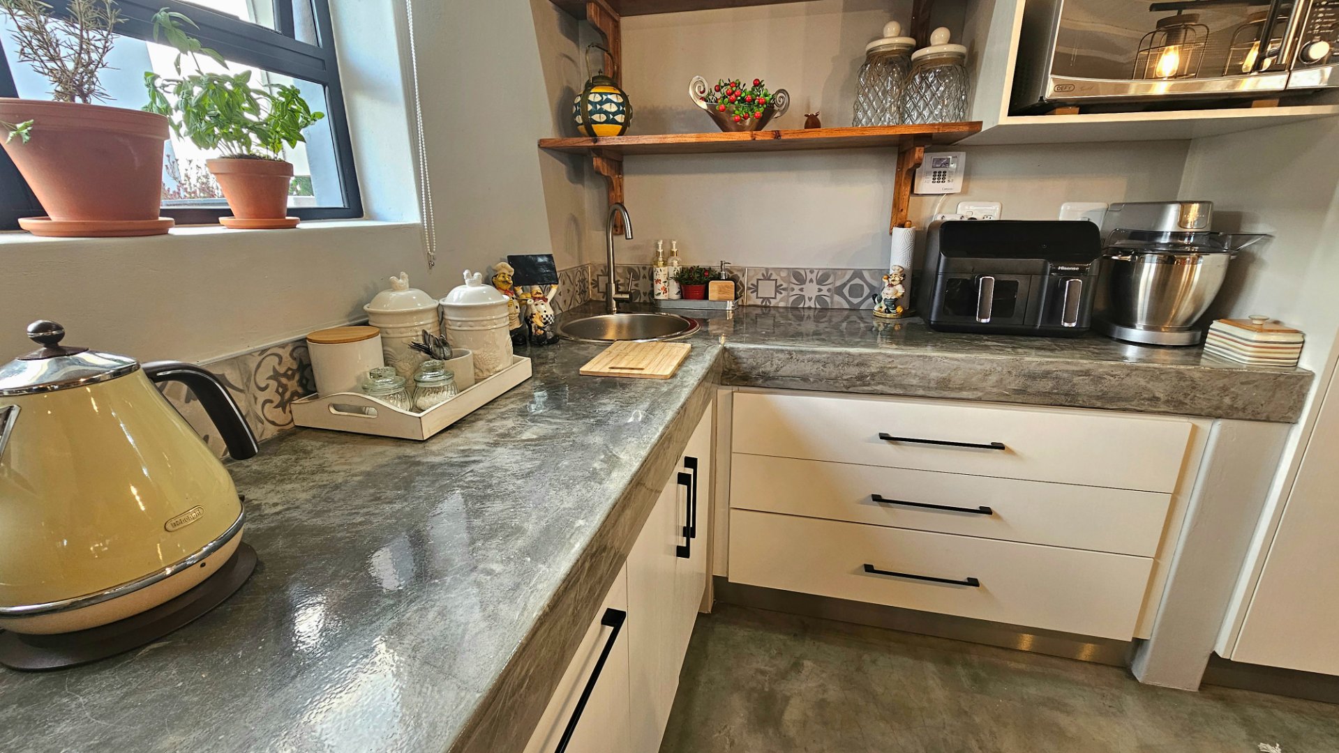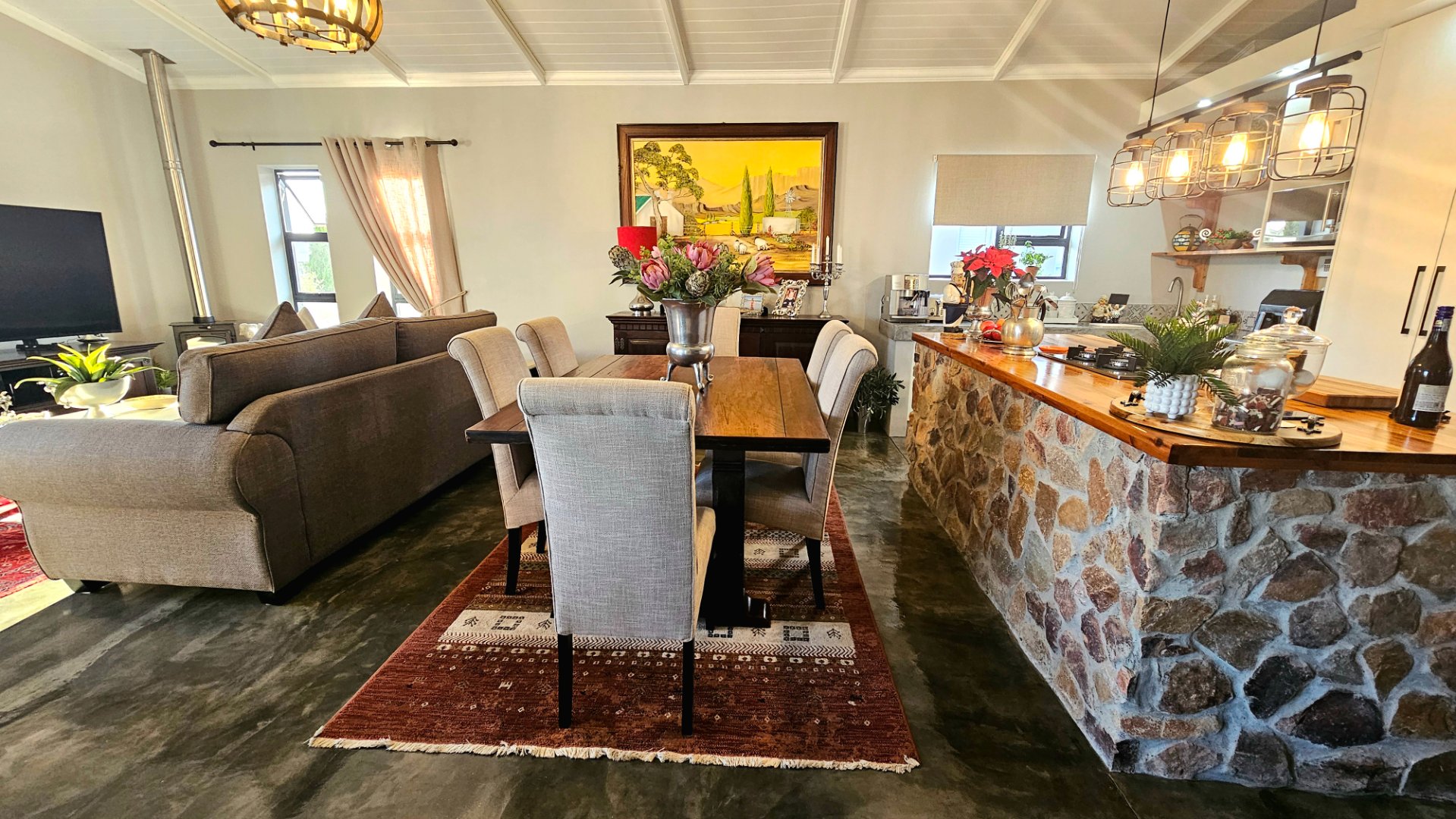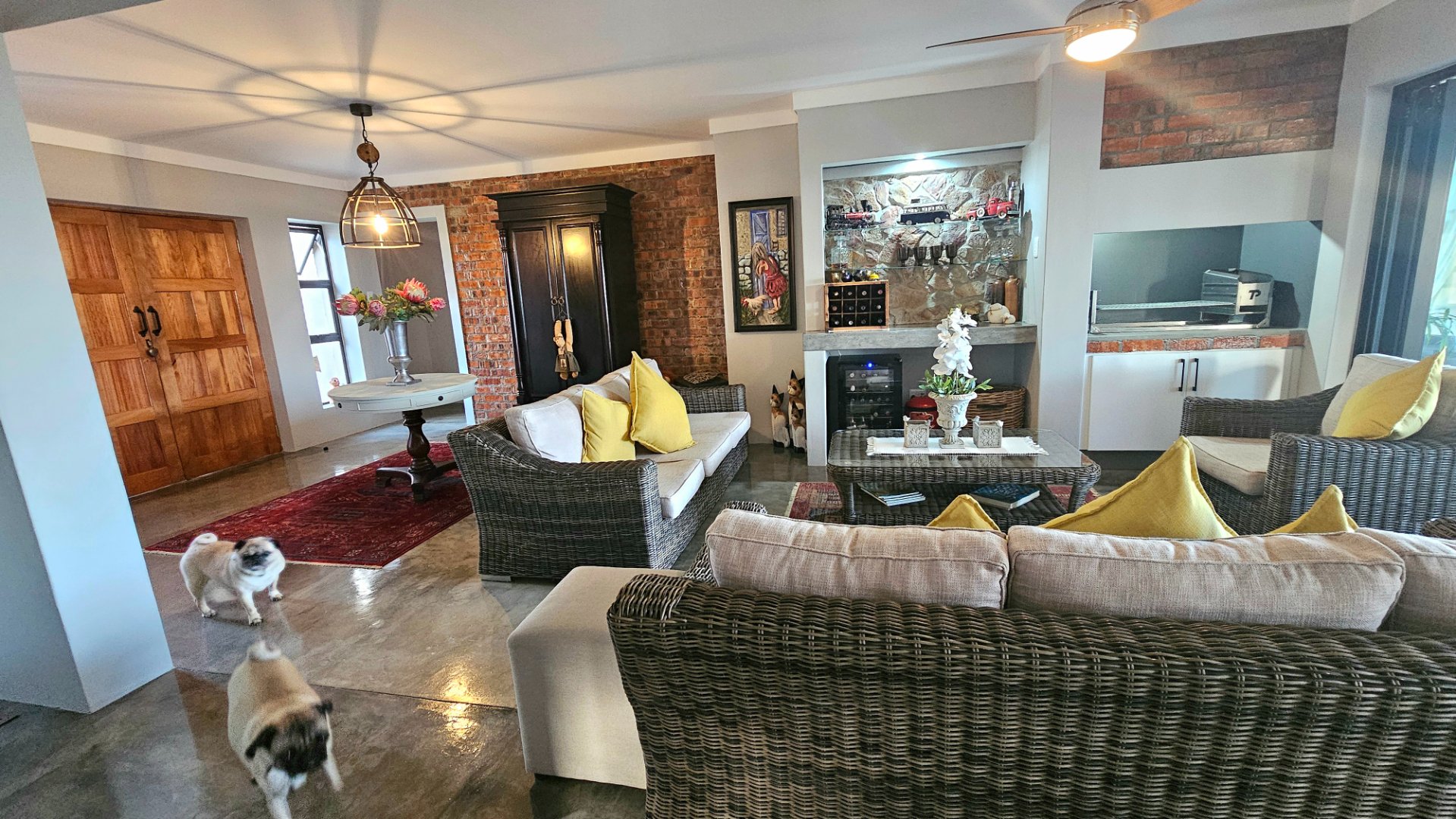 Step inside through the striking stone-clad entrance with a pergola, and you’ll find an open-plan layout that flows effortlessly between the kitchen, dining, family and braai rooms. The kitchen is a standout feature, featuring black wood countertops, stone accents, and rustic brick-built cupboards. A warm and inviting fireplace adds a touch of charm to the family room, while the covered patio invites relaxed moments with loved ones.