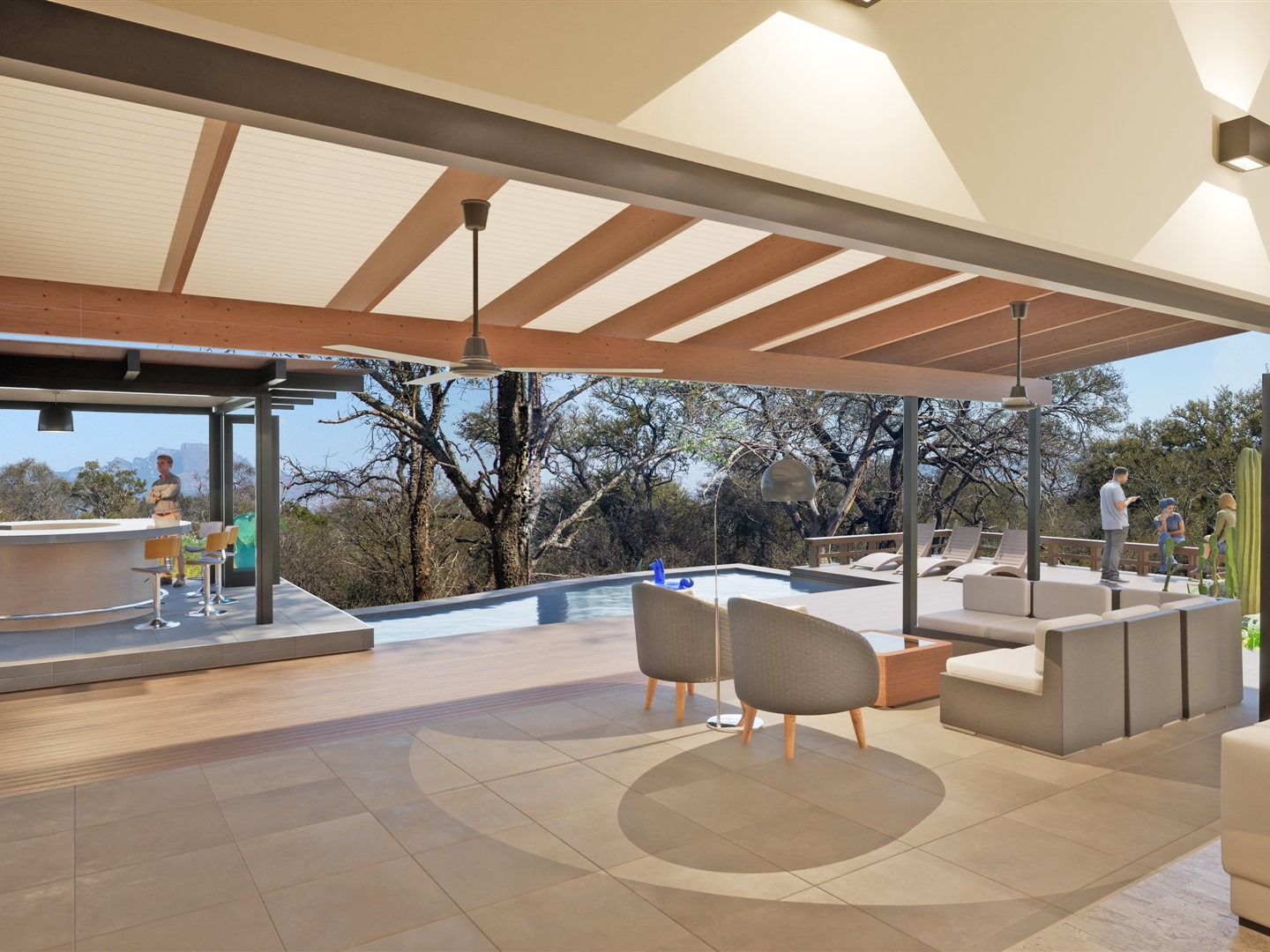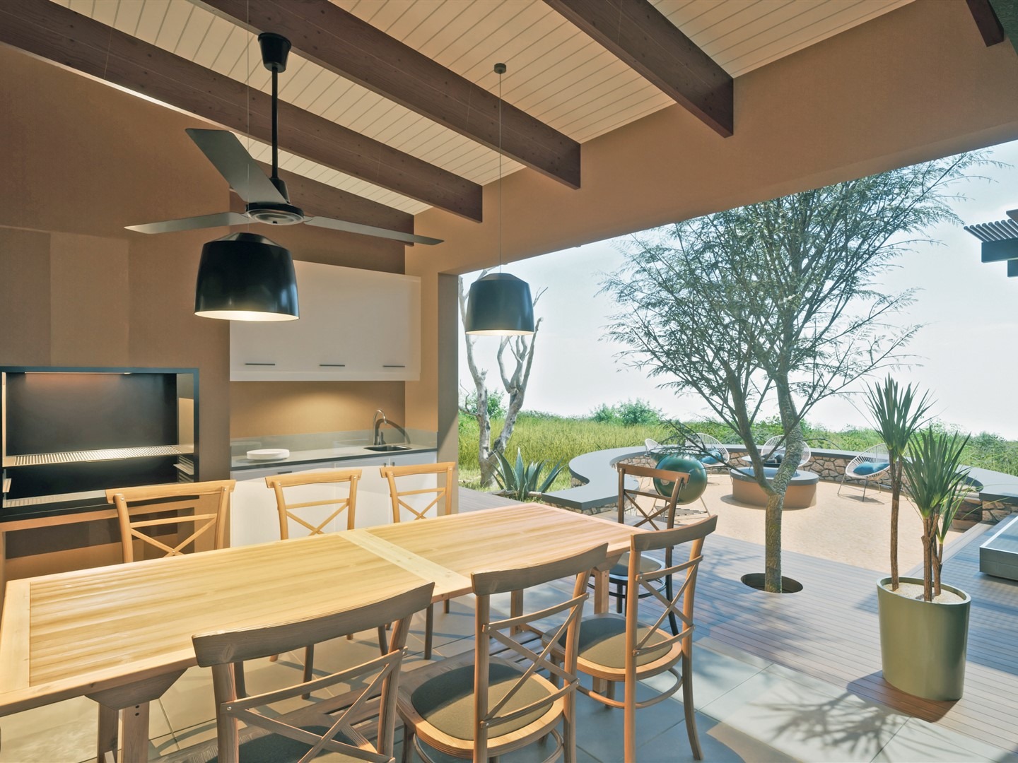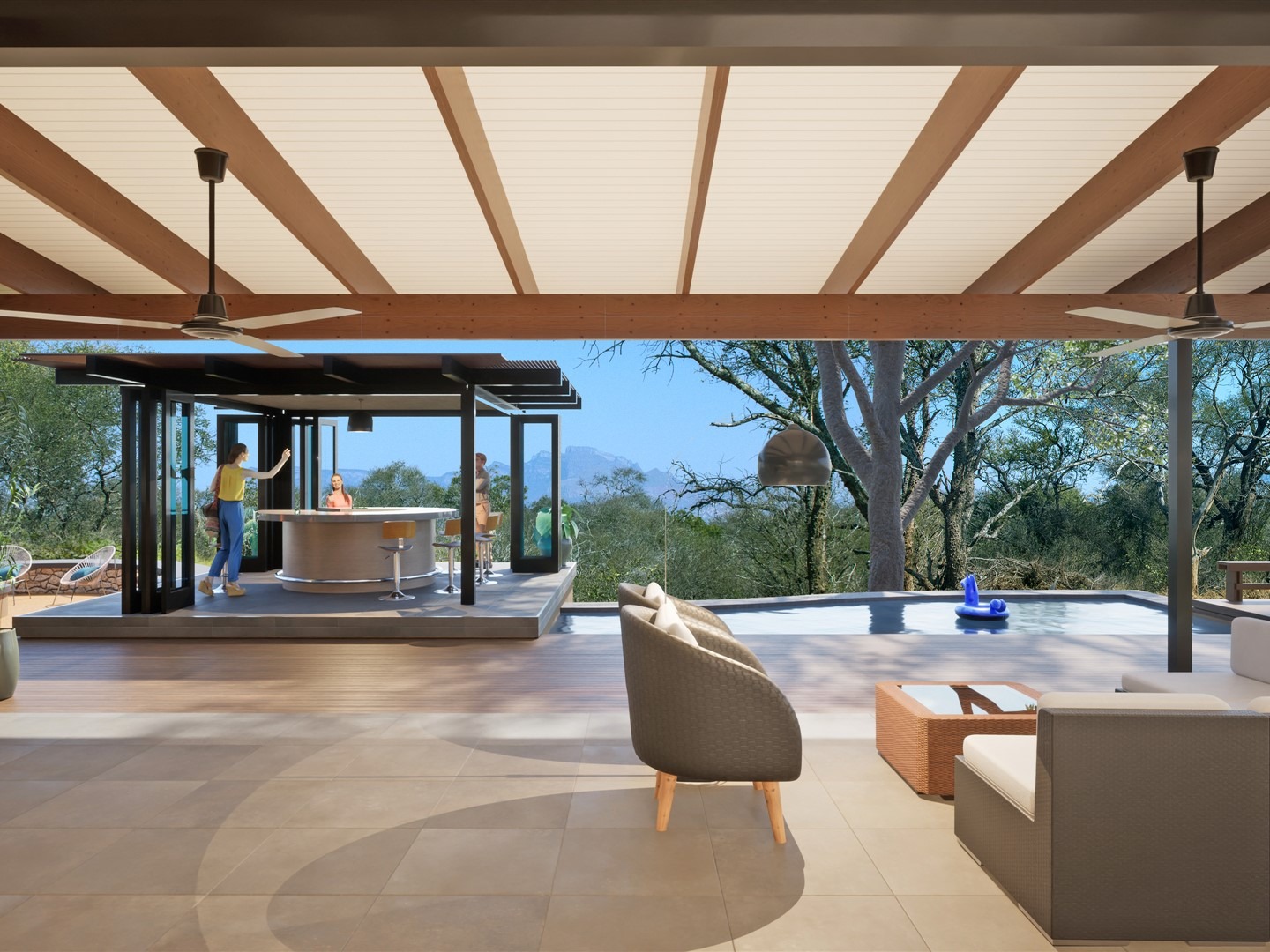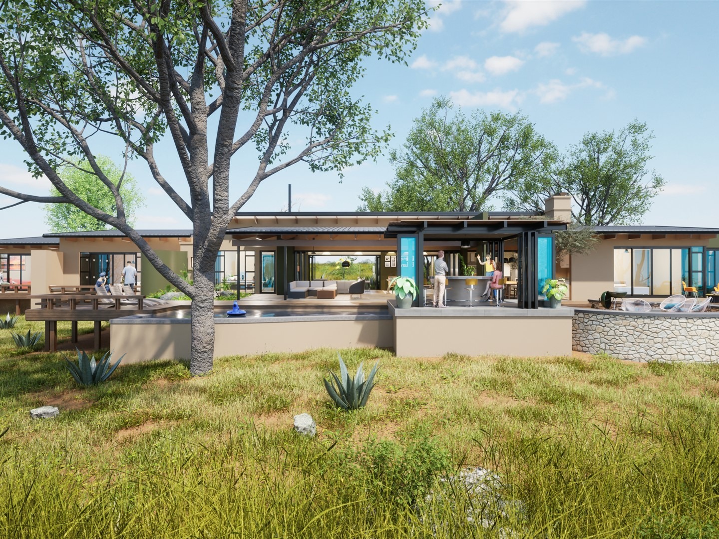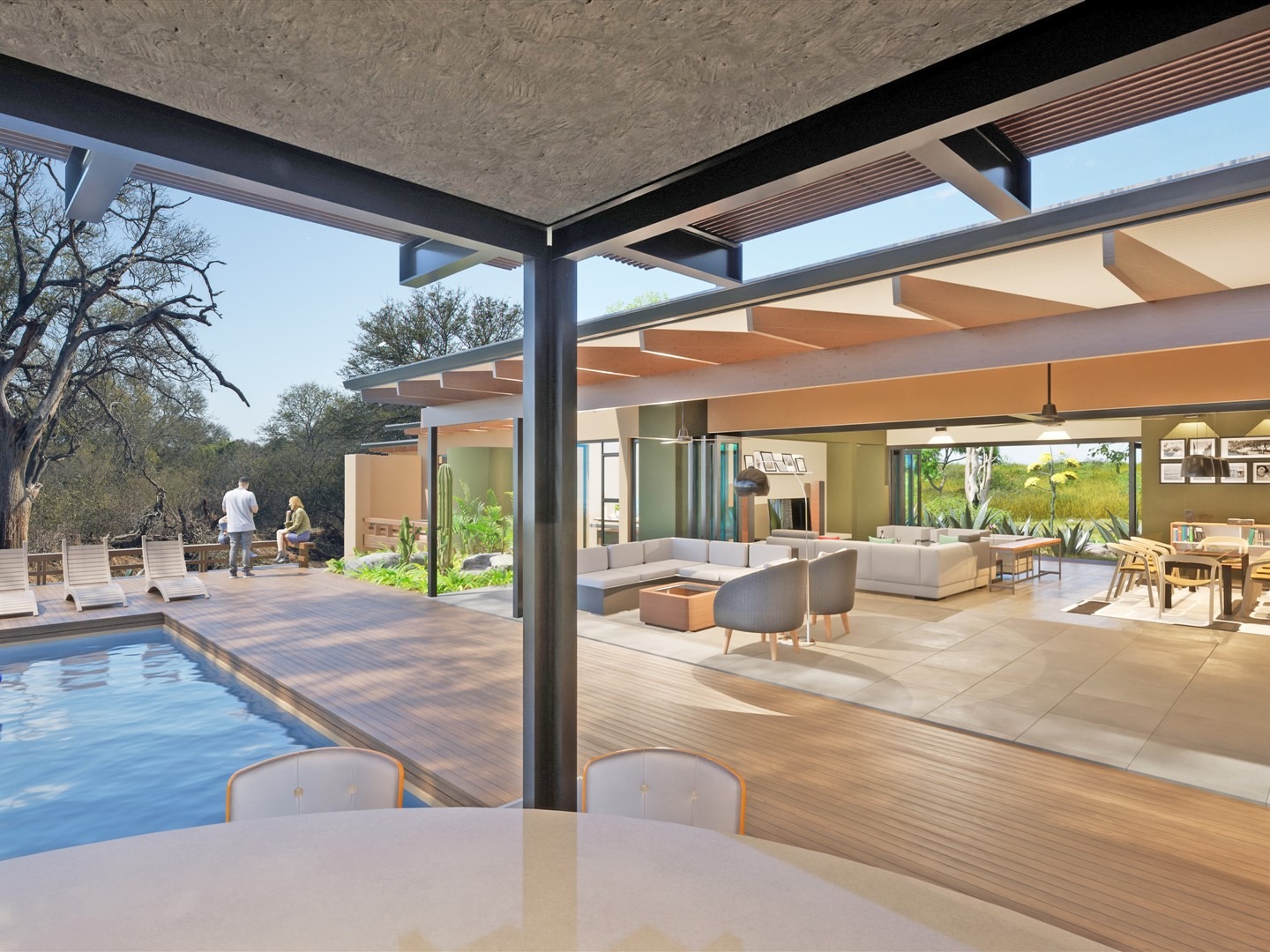 The outdoor entertaining area includes a covered braai patio, wooden sun-deck, sparkling pool, undercover poolside-bar and an open boma area.
