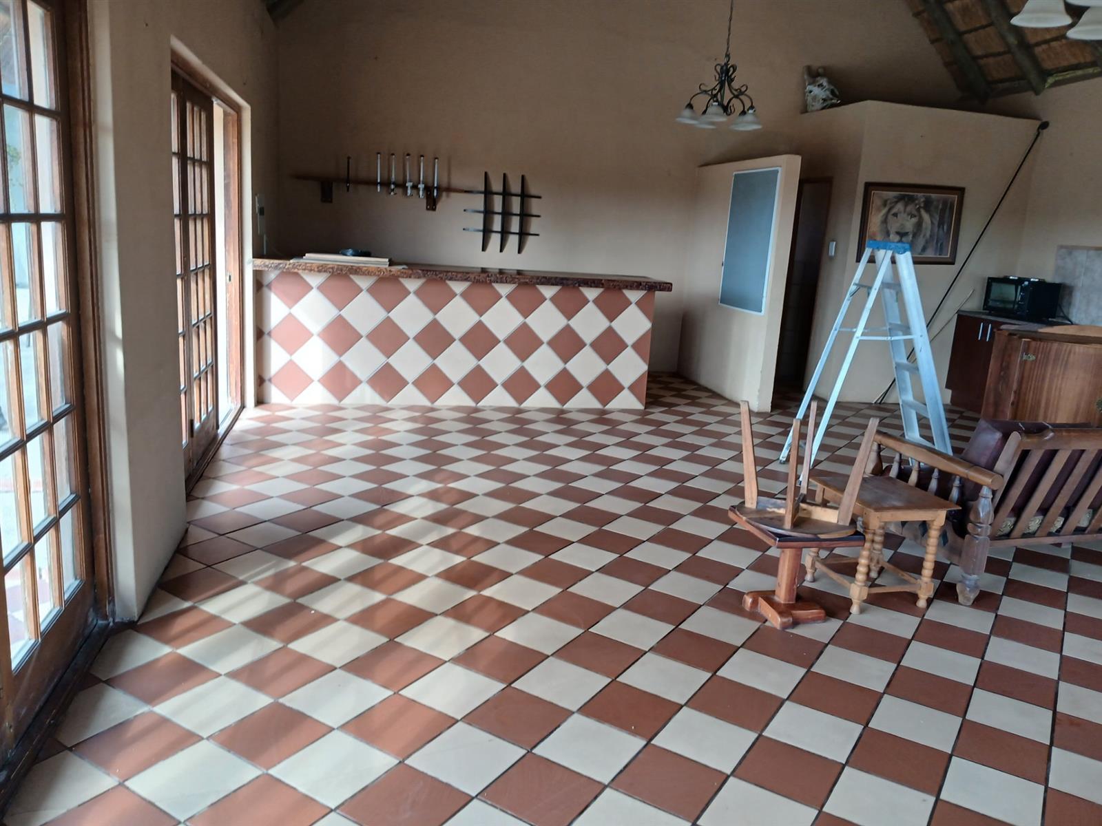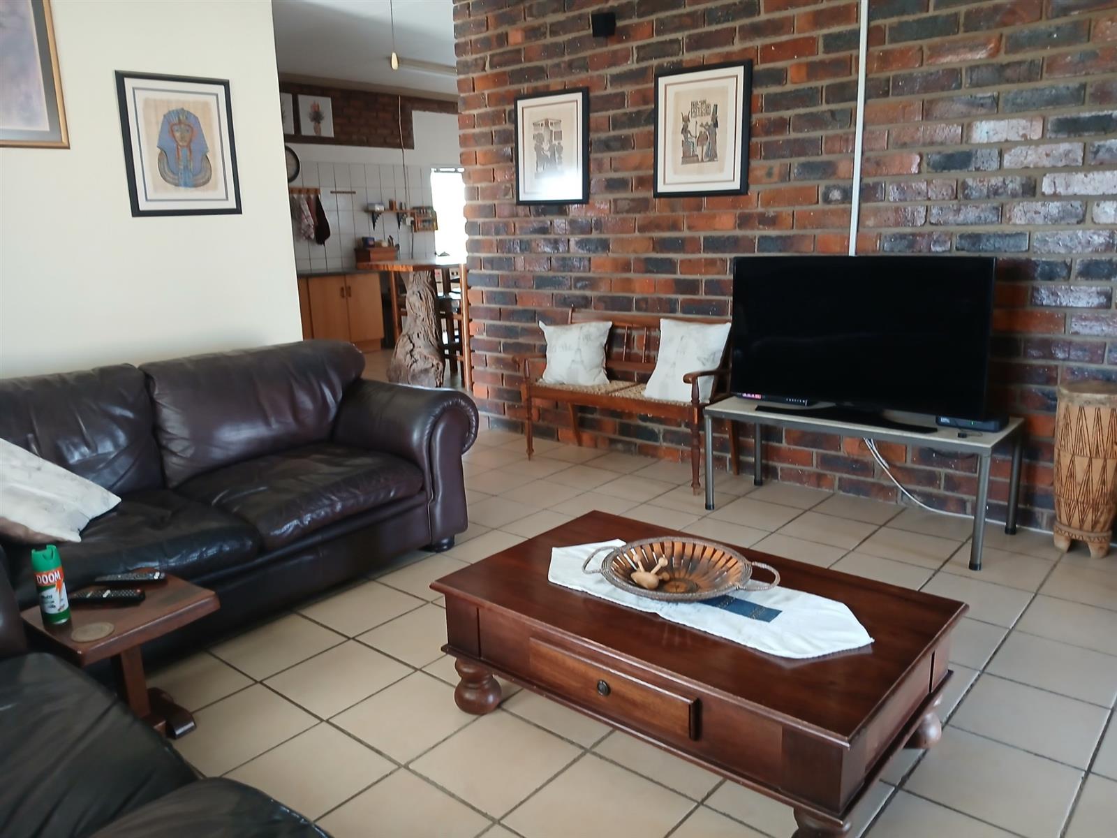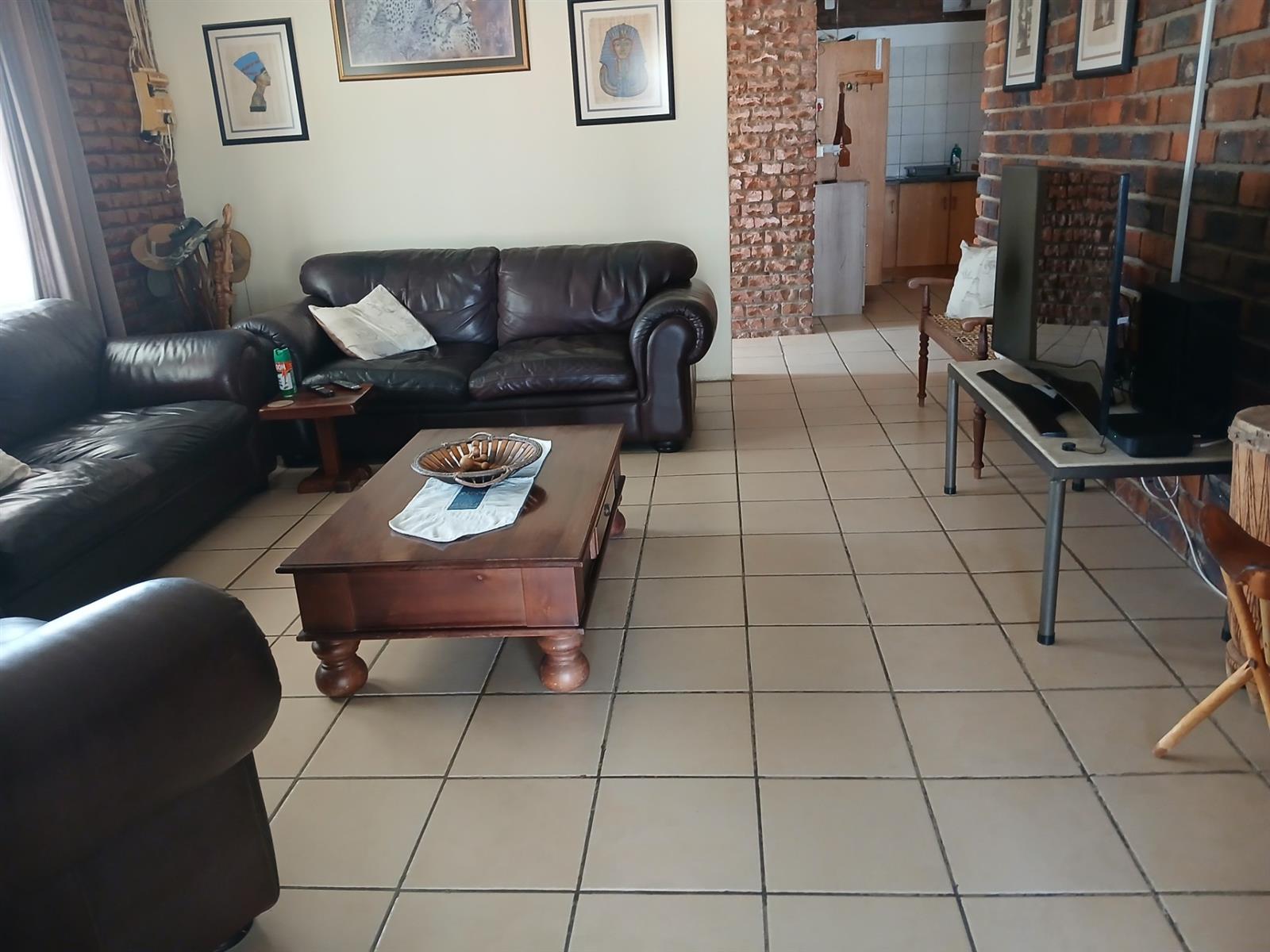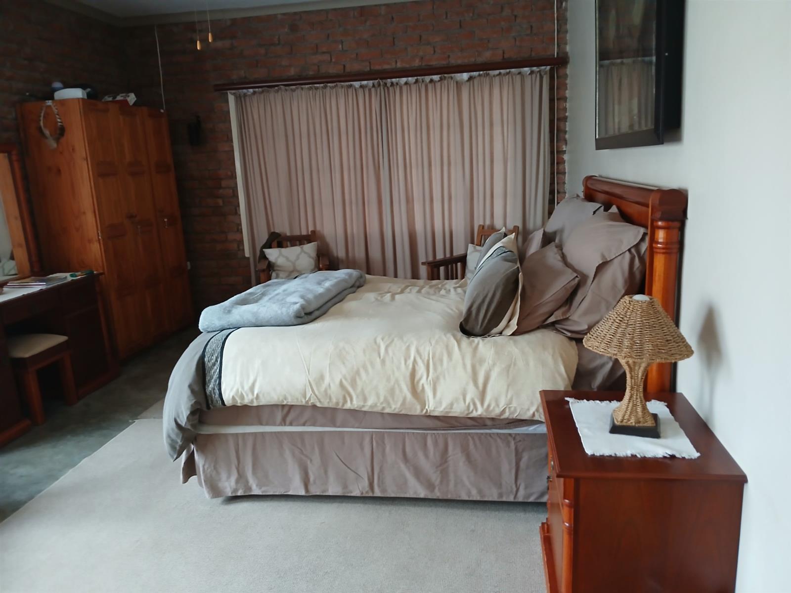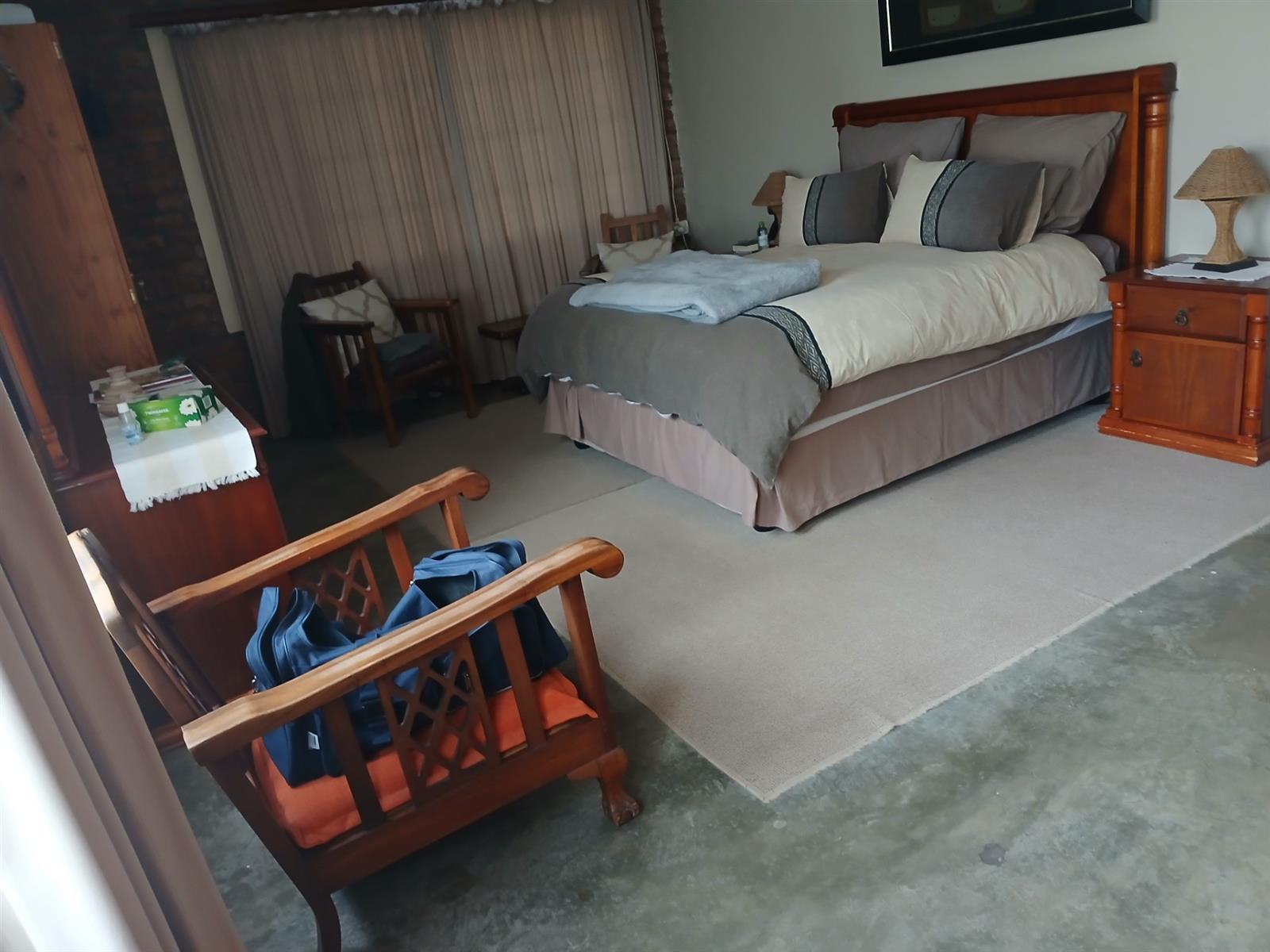 A one bedroom flatlet with huge entertainment area, a bar, kitchen, living area, and bathroom.