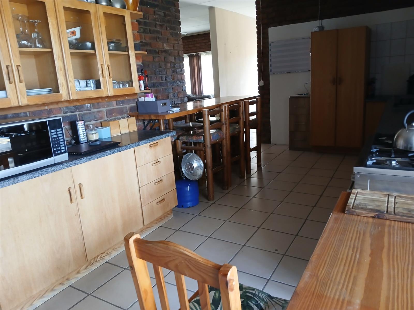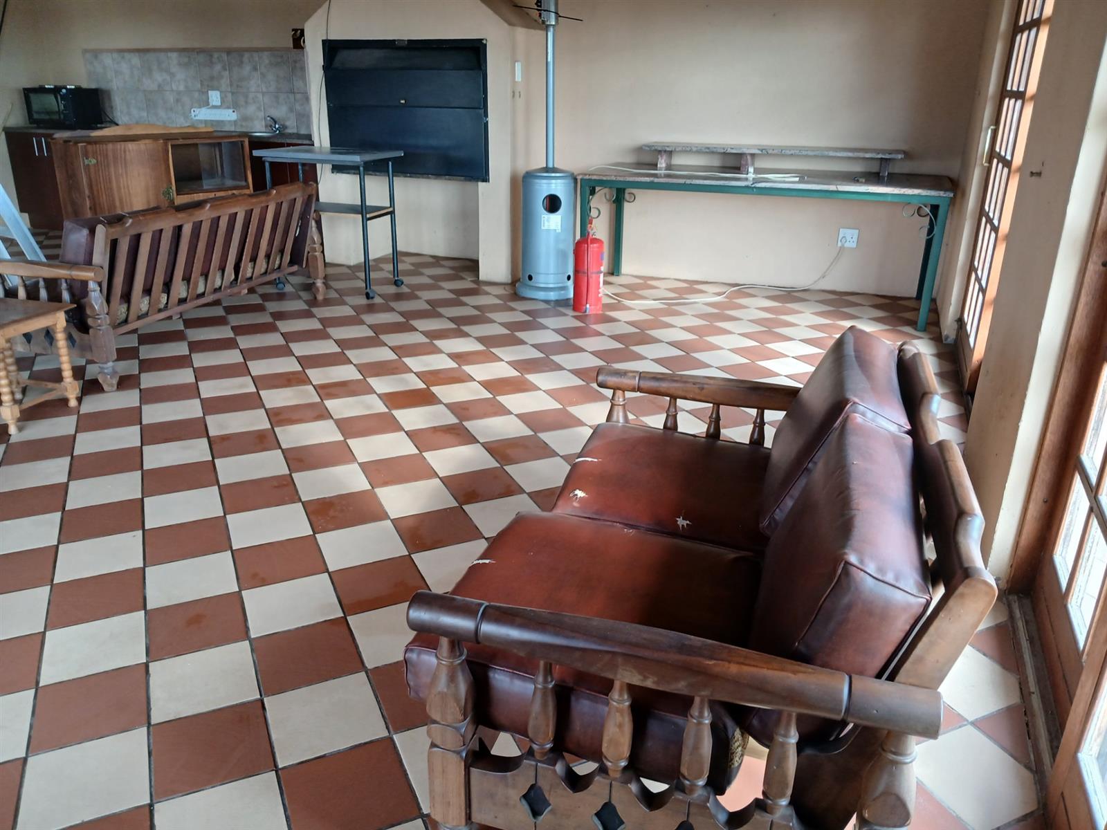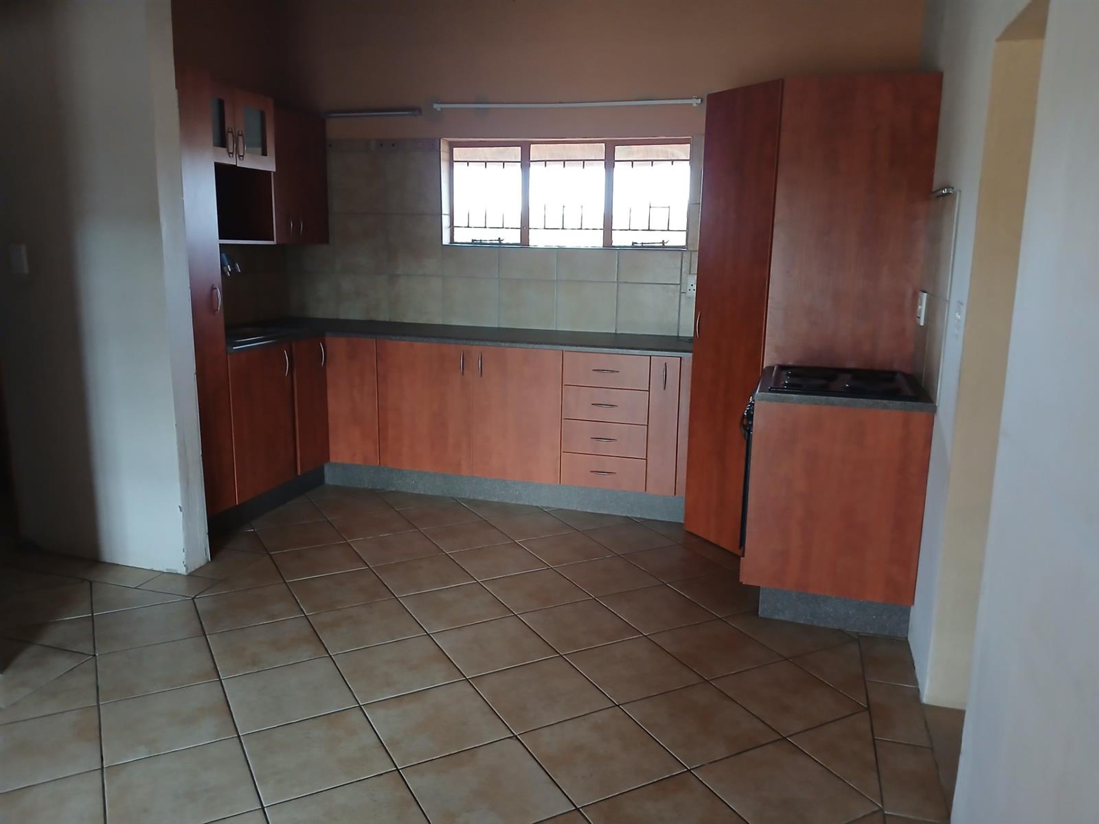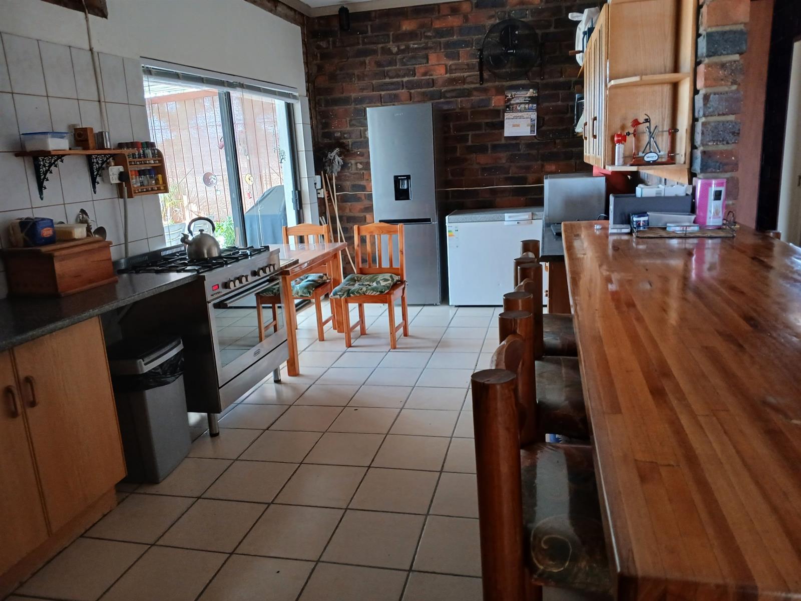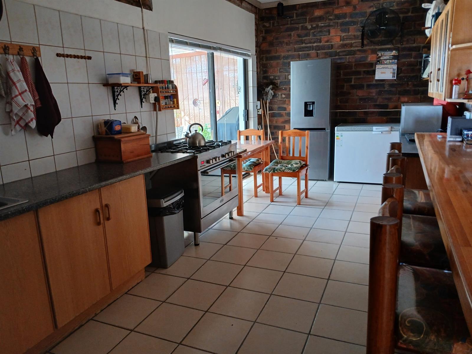 A one bedroom flatlet with huge entertainment area, a bar, kitchen, living area, and bathroom.