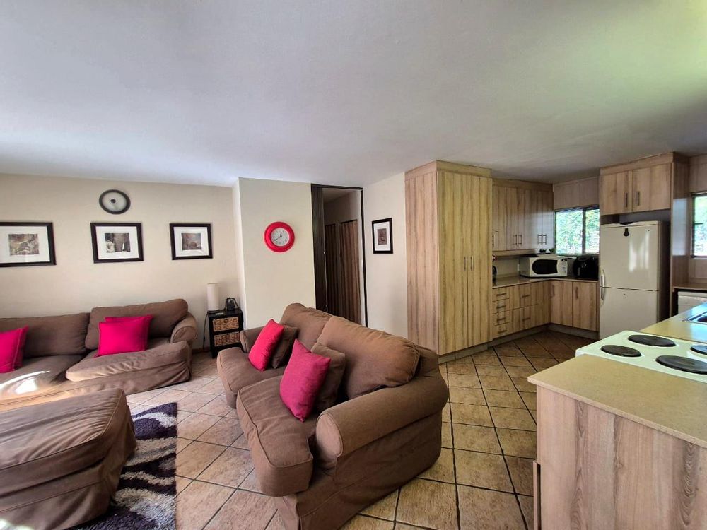 Enter through the covered patio into a spacious dining room that perfectly connects to the kitchen, patio, and boma braai area—ideal for family gatherings and entertaining. The open-plan kitchen and lounge are equipped with ample cupboards and thoughtfully designed spaces. A sliding door from the lounge opens to a patio, flooding the area with natural sunlight. The lounge area is also equipped with an air conditioner for added comfort.