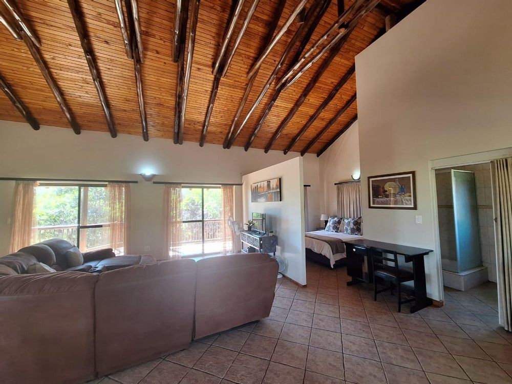 The upper level boasts an expansive, double-volume space with exposed beams, creating an airy and open environment. The open-plan lounge, dining room, and kitchenette are perfect for hosting guests or enjoying quiet evenings. Glass sliding doors on two sides lead to patios with breathtaking farm views—ideal for al fresco dining or a relaxing braai with the built-in braai.