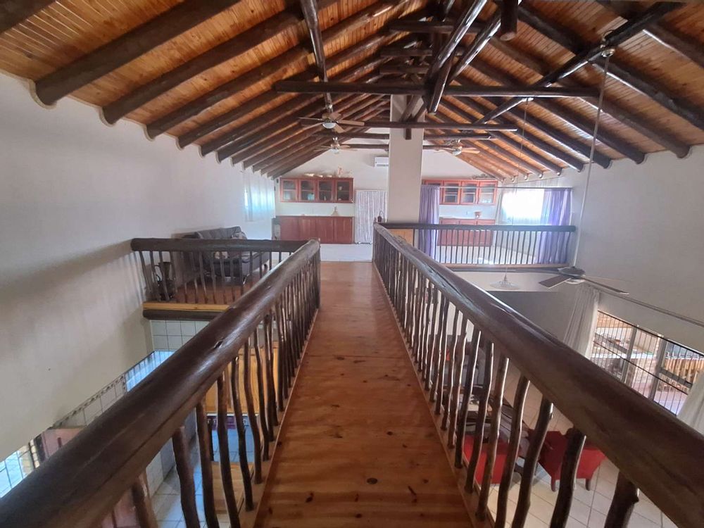 Upon entering the home, you are greeted by a stunning open-plan lounge and dining room. The double-volume ceilings adorned with exposed beams create an airy and inviting atmosphere. The space seamlessly extends onto a large veranda, complete with a built-in braai and jacuzzi, overlooking your lush, green garden with mature shade trees. It’s an ideal setting for entertaining guests or enjoying tranquil evenings with family.