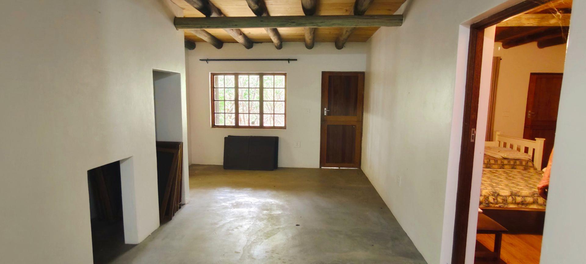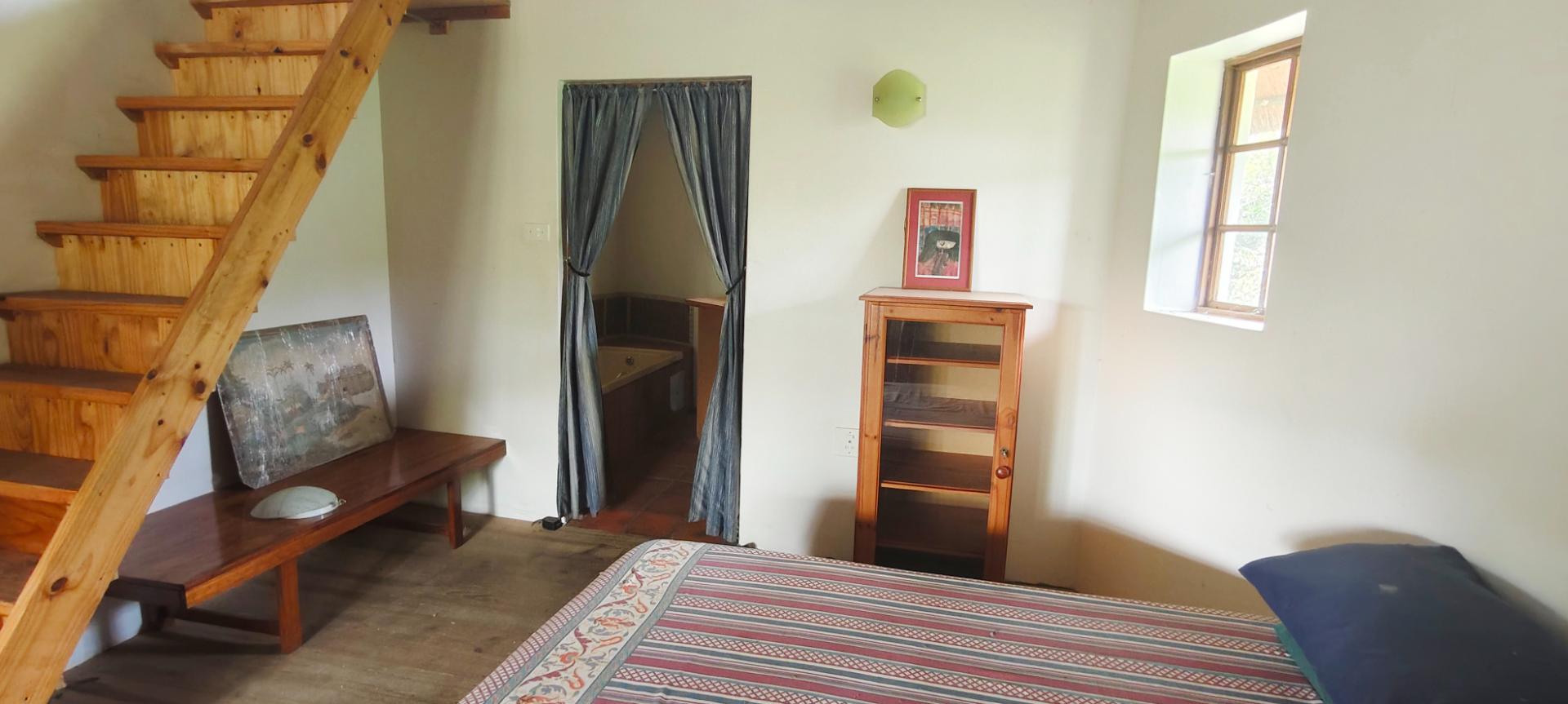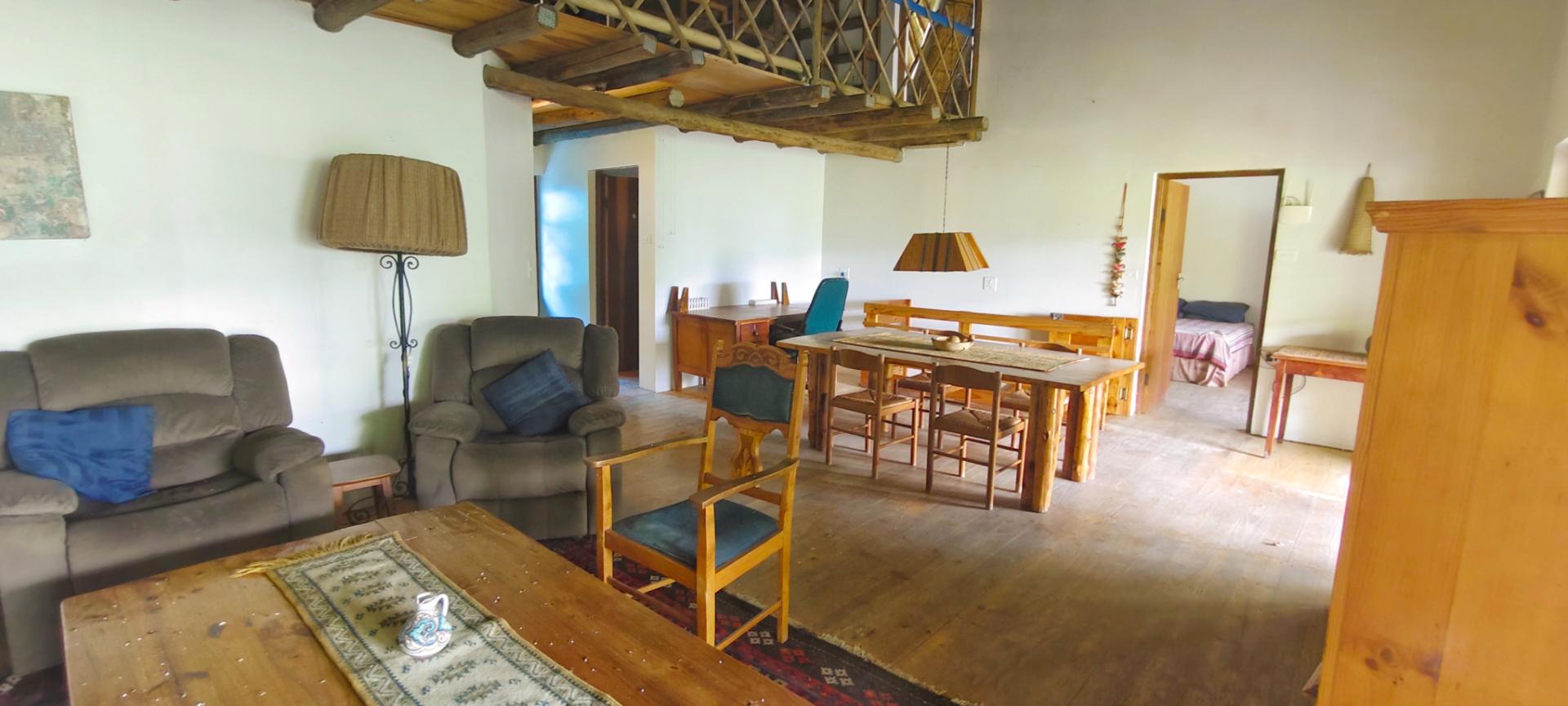 Step into a spacious open-plan lounge and dining area, boasting double volume ceilings and expansive doors that open onto a wrap-around wooden deck. From here, enjoy stunning views of the Boshoff mountains. The main level also features an en-suite bedroom with a glass door leading onto the deck, along with a cozy kitchen and dining area and a convenient guest bathroom.