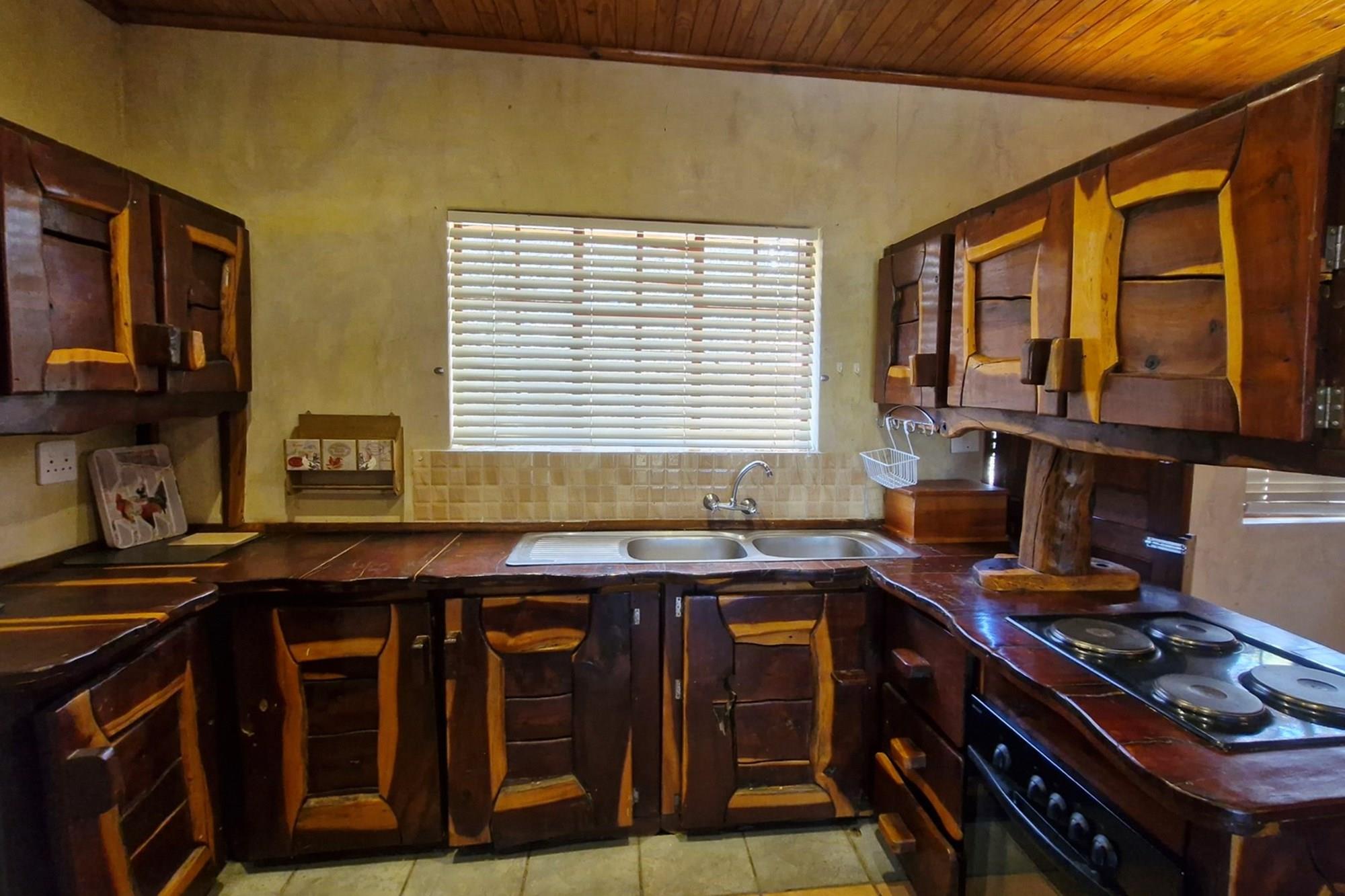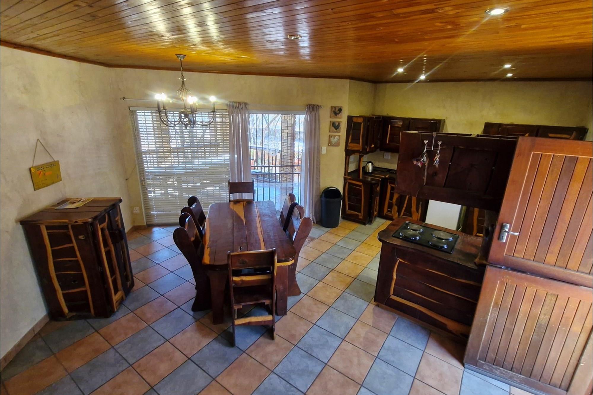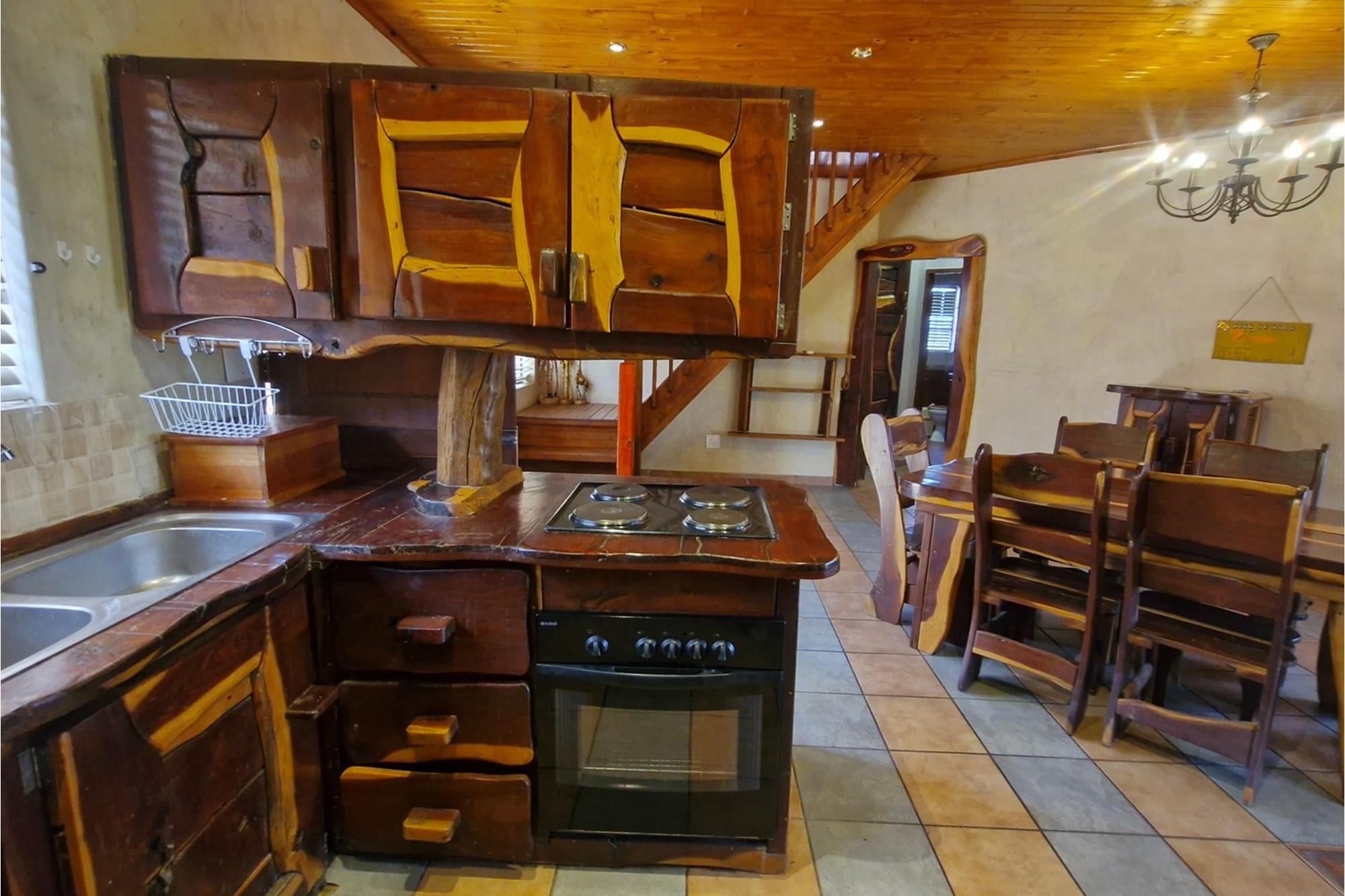 This well-appointed open plan, solid wood kitchen with electric stove/oven flows to the dining area that opens with sliding glass doors onto an underroof stoep.