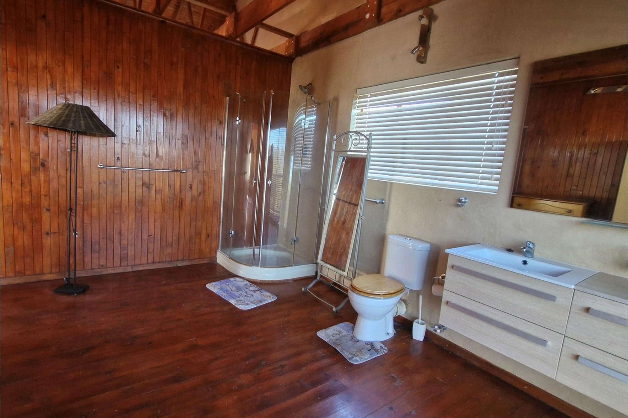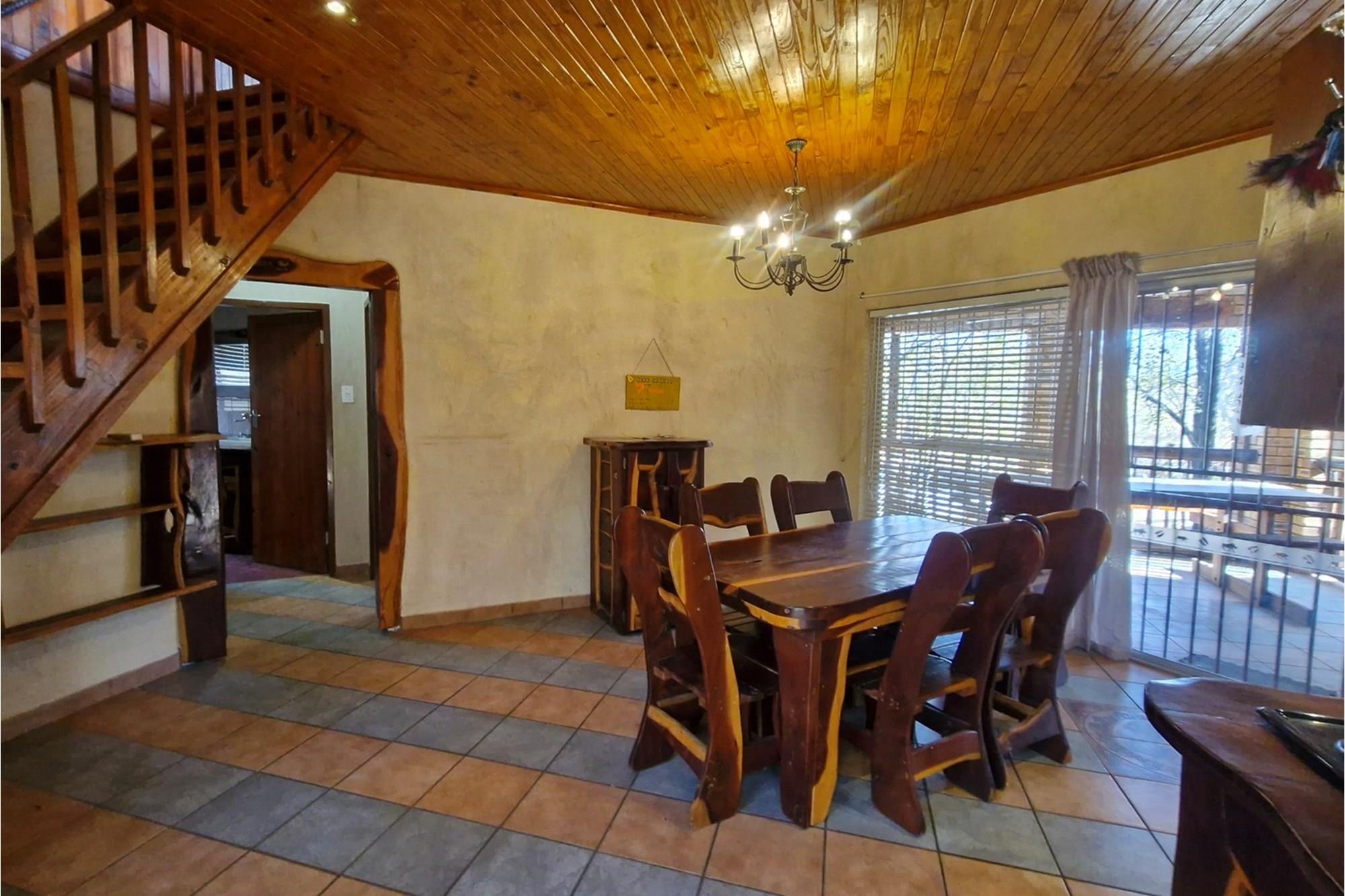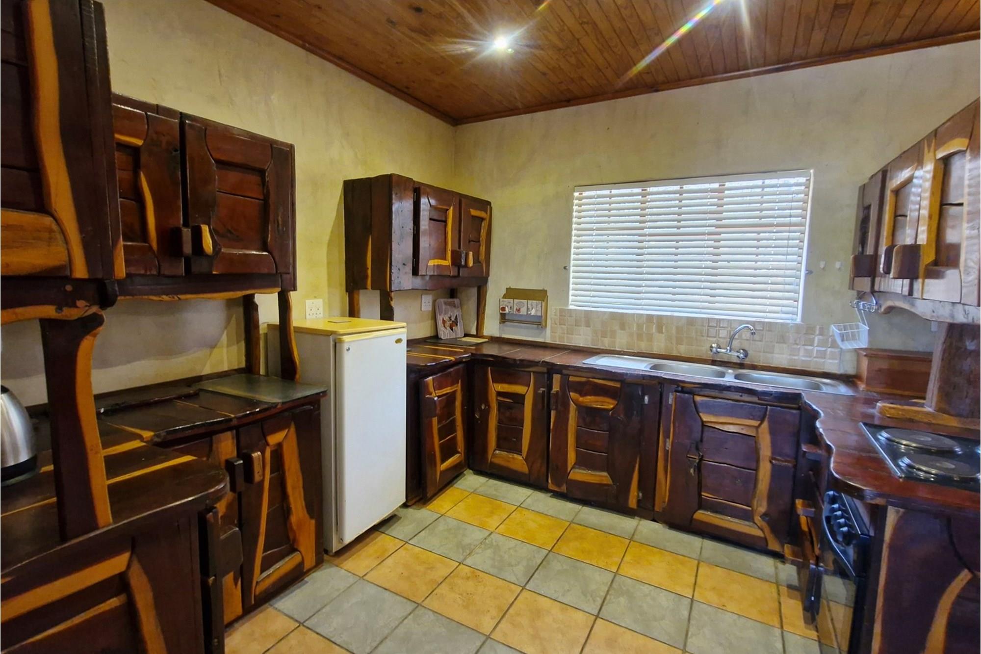 This well-appointed open plan, solid wood kitchen with electric stove/oven flows to the dining area that opens with sliding glass doors onto an underroof stoep.