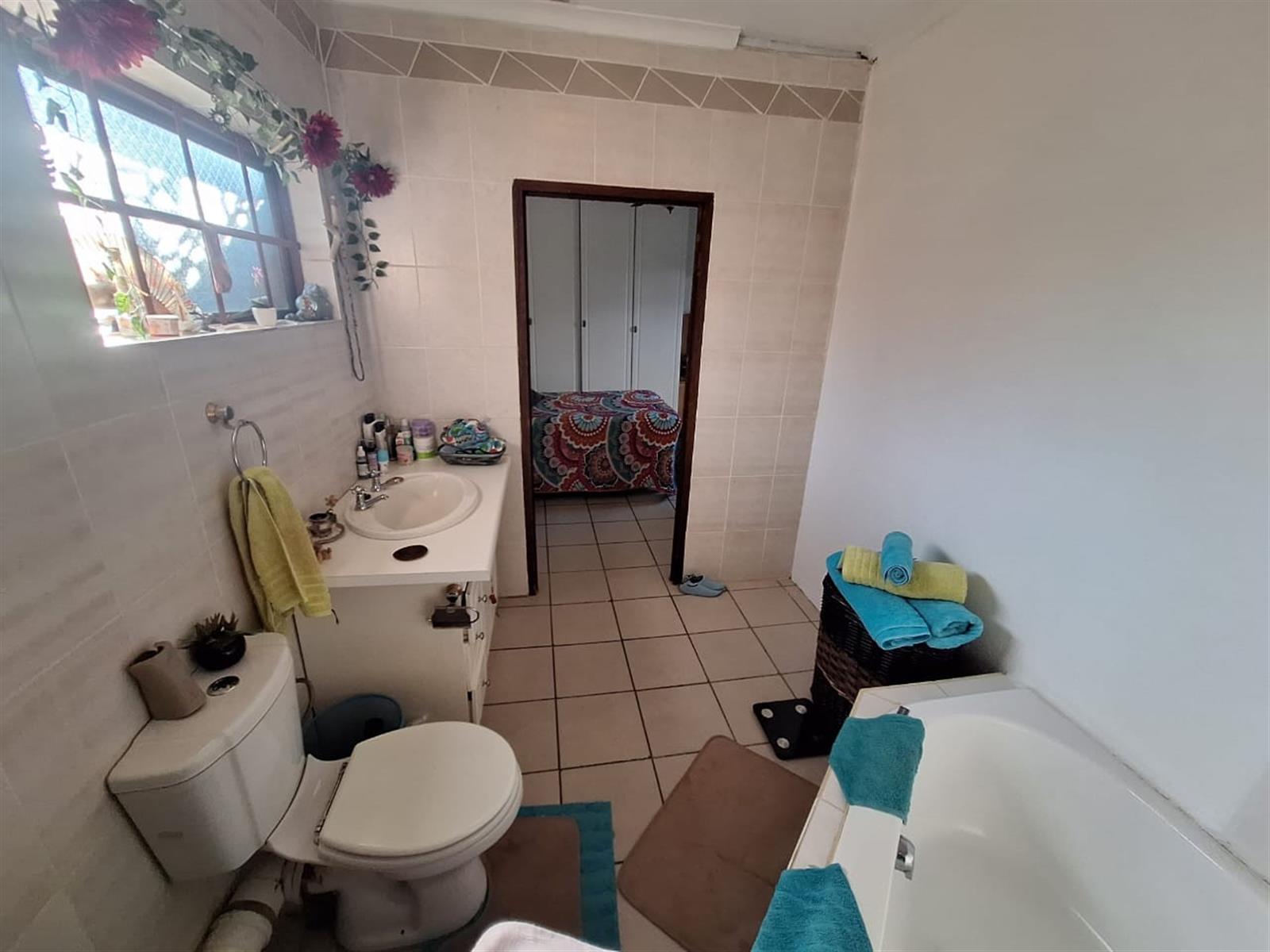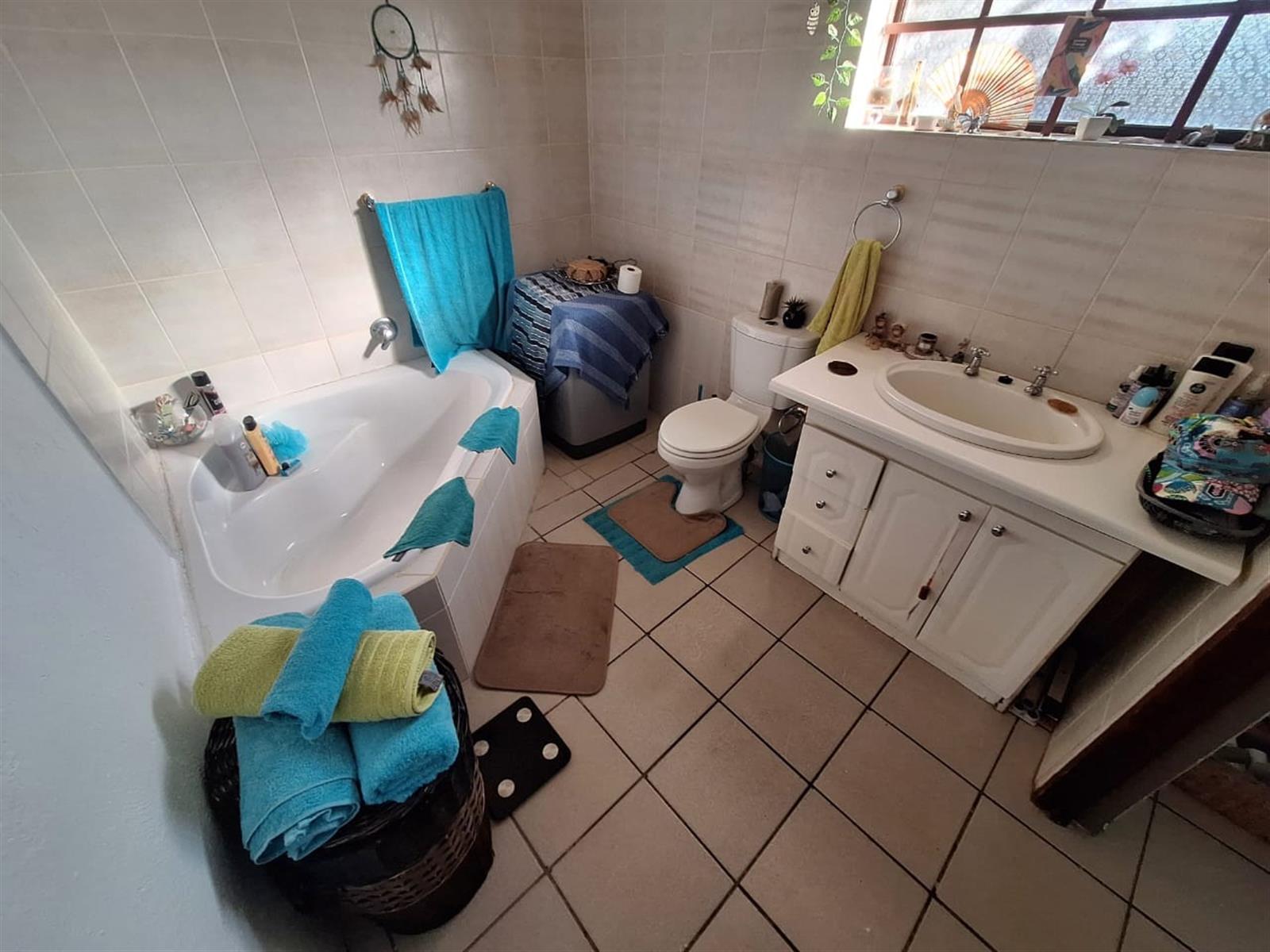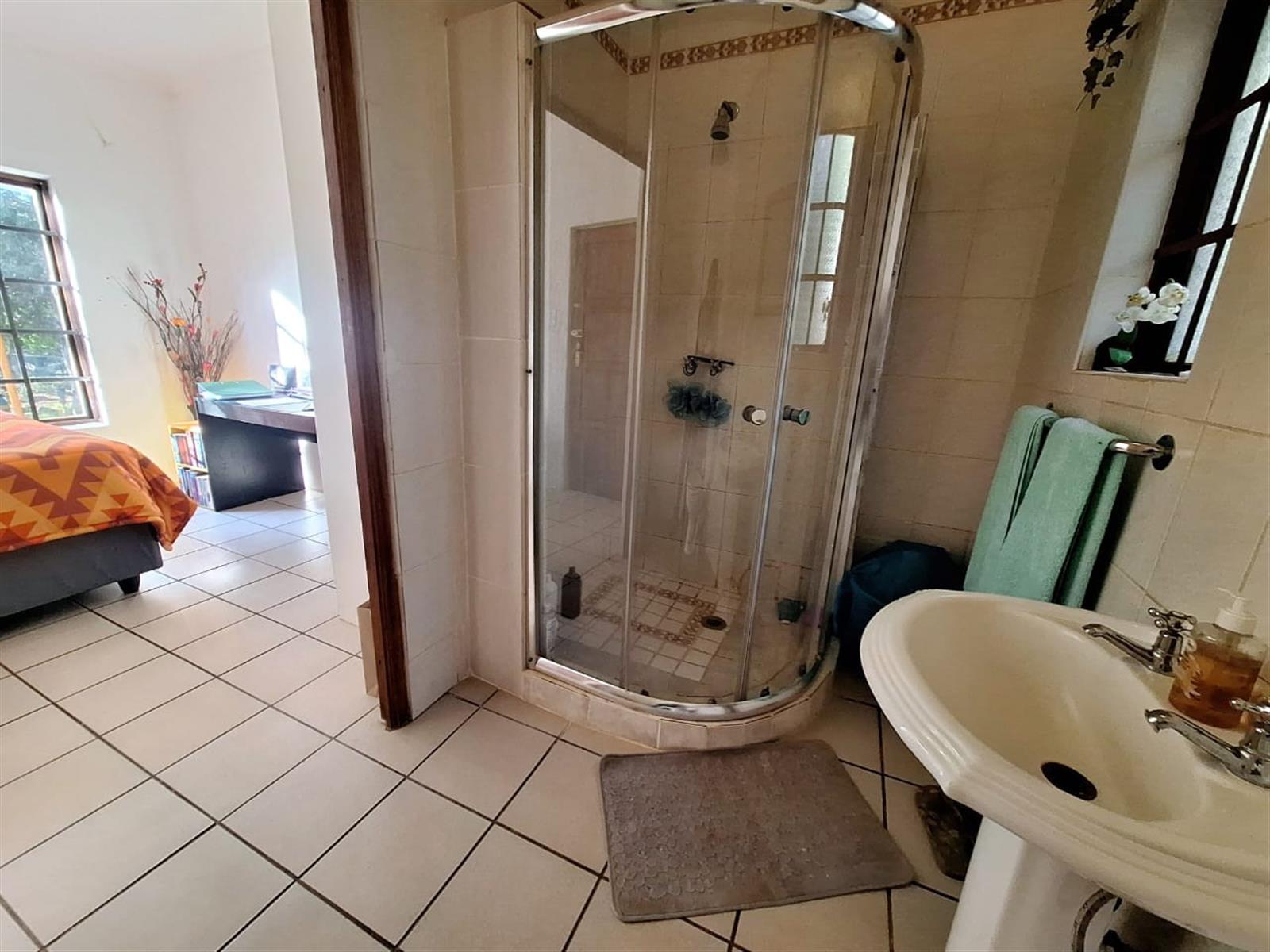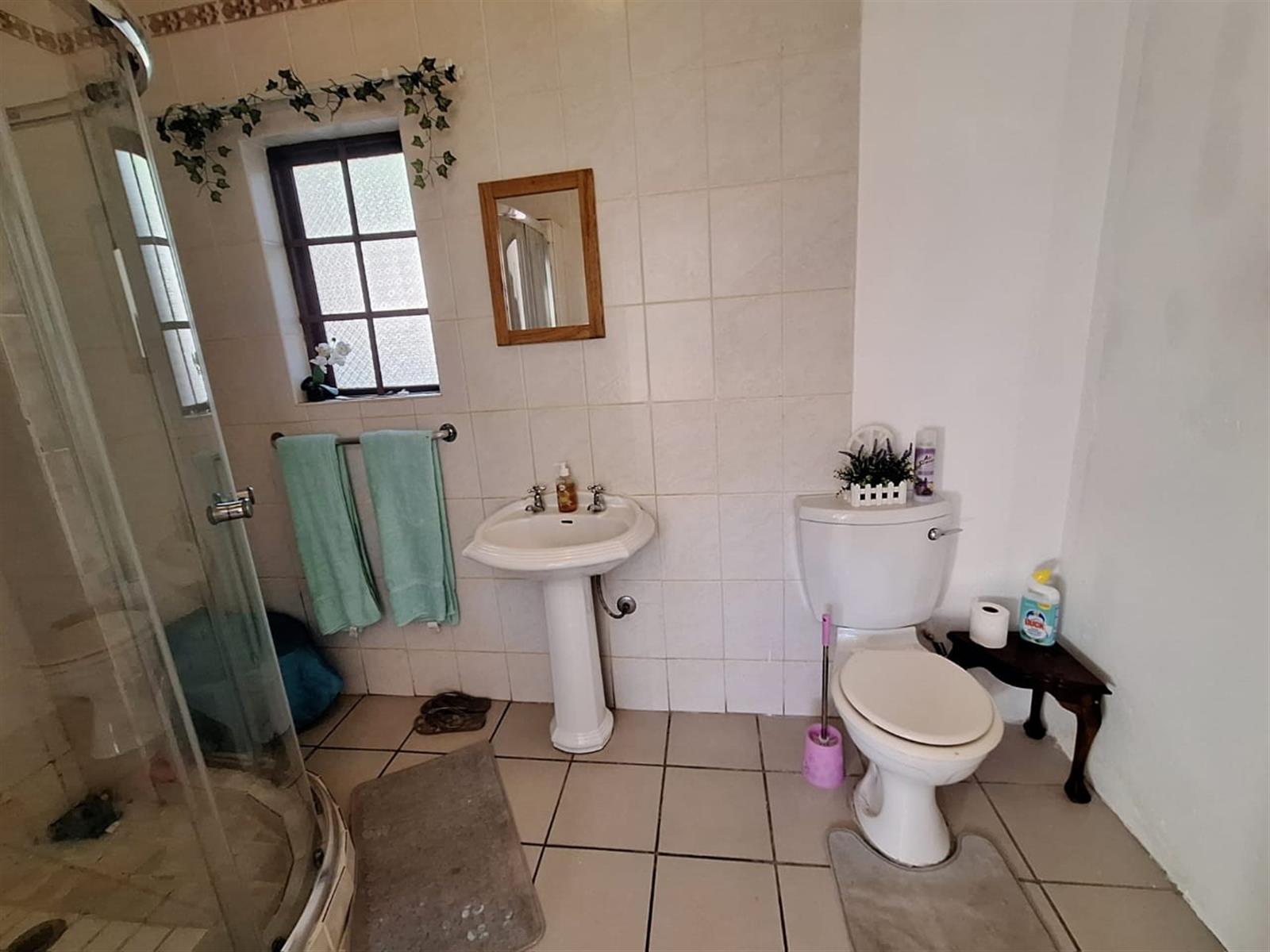 The main bedroom is a serene escape, complete with large windows overlooking the lush, well-kept garden. It features an en-suite bathroom with a bath, toilet, and basin, as well as built-in cupboards and additional space for a washing machine.
