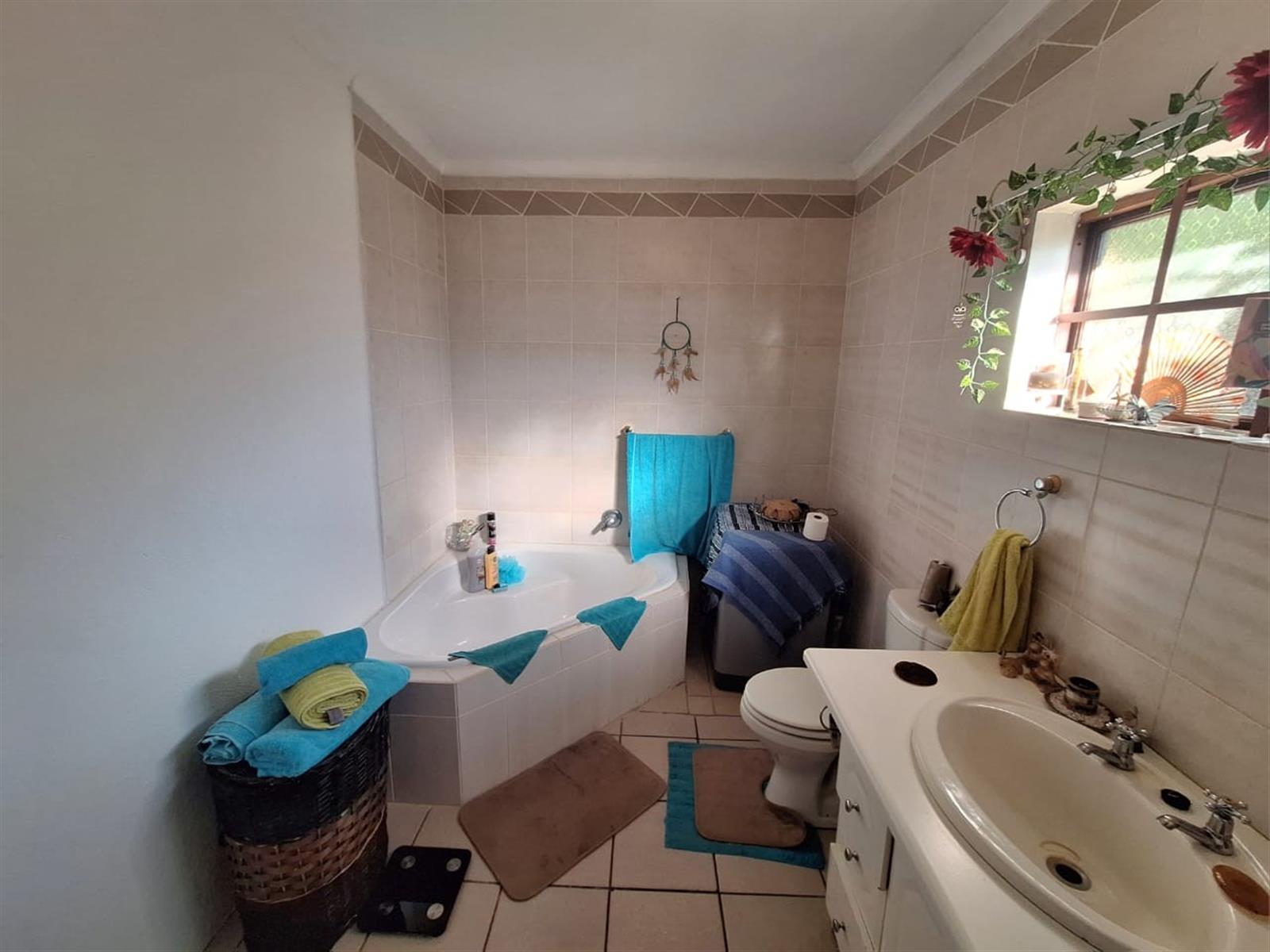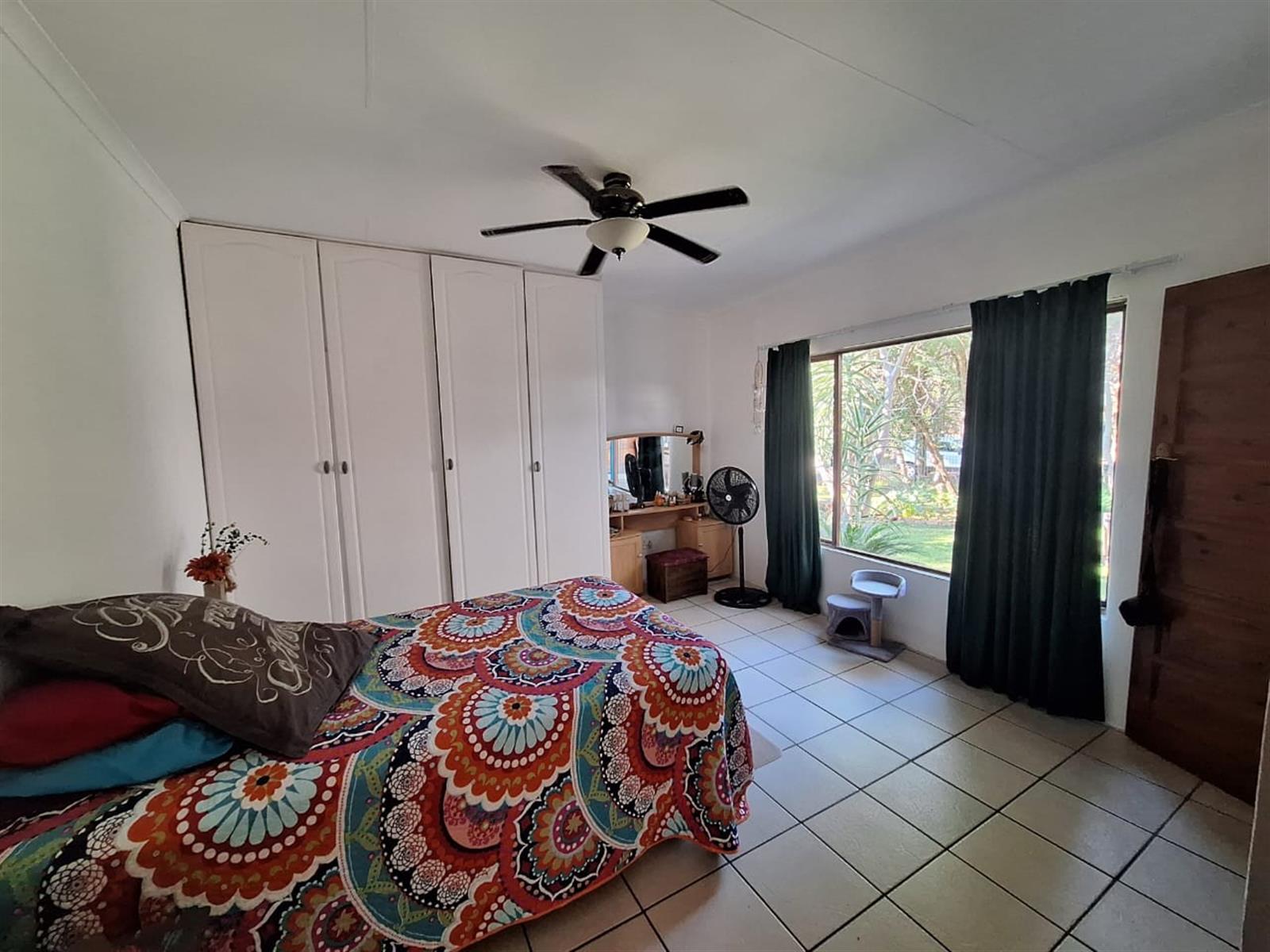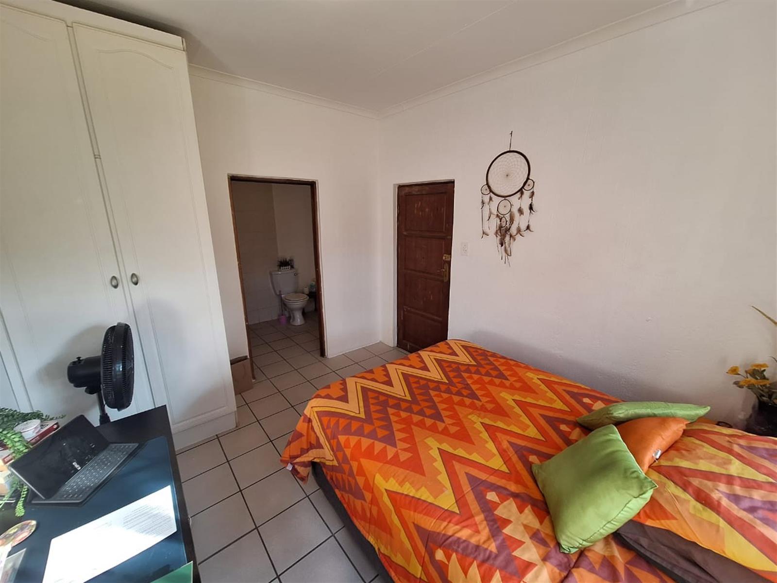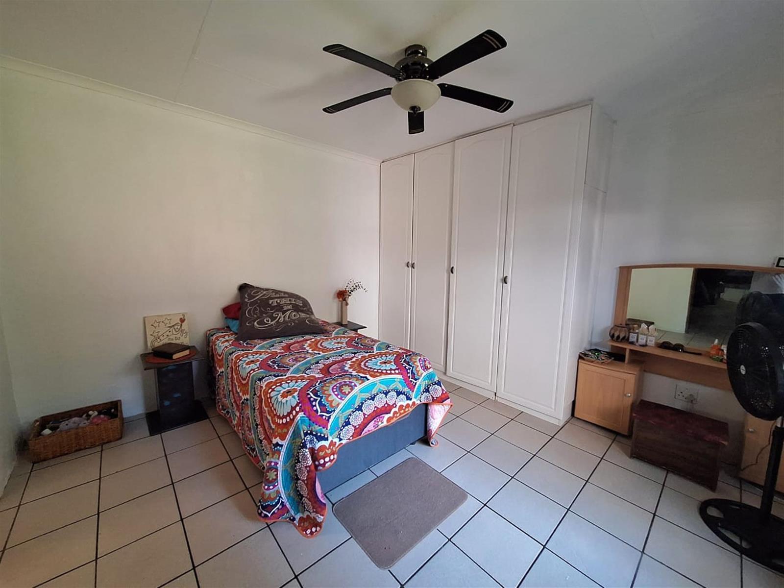 The main bedroom is a serene escape, complete with large windows overlooking the lush, well-kept garden. It features an en-suite bathroom with a bath, toilet, and basin, as well as built-in cupboards and additional space for a washing machine.