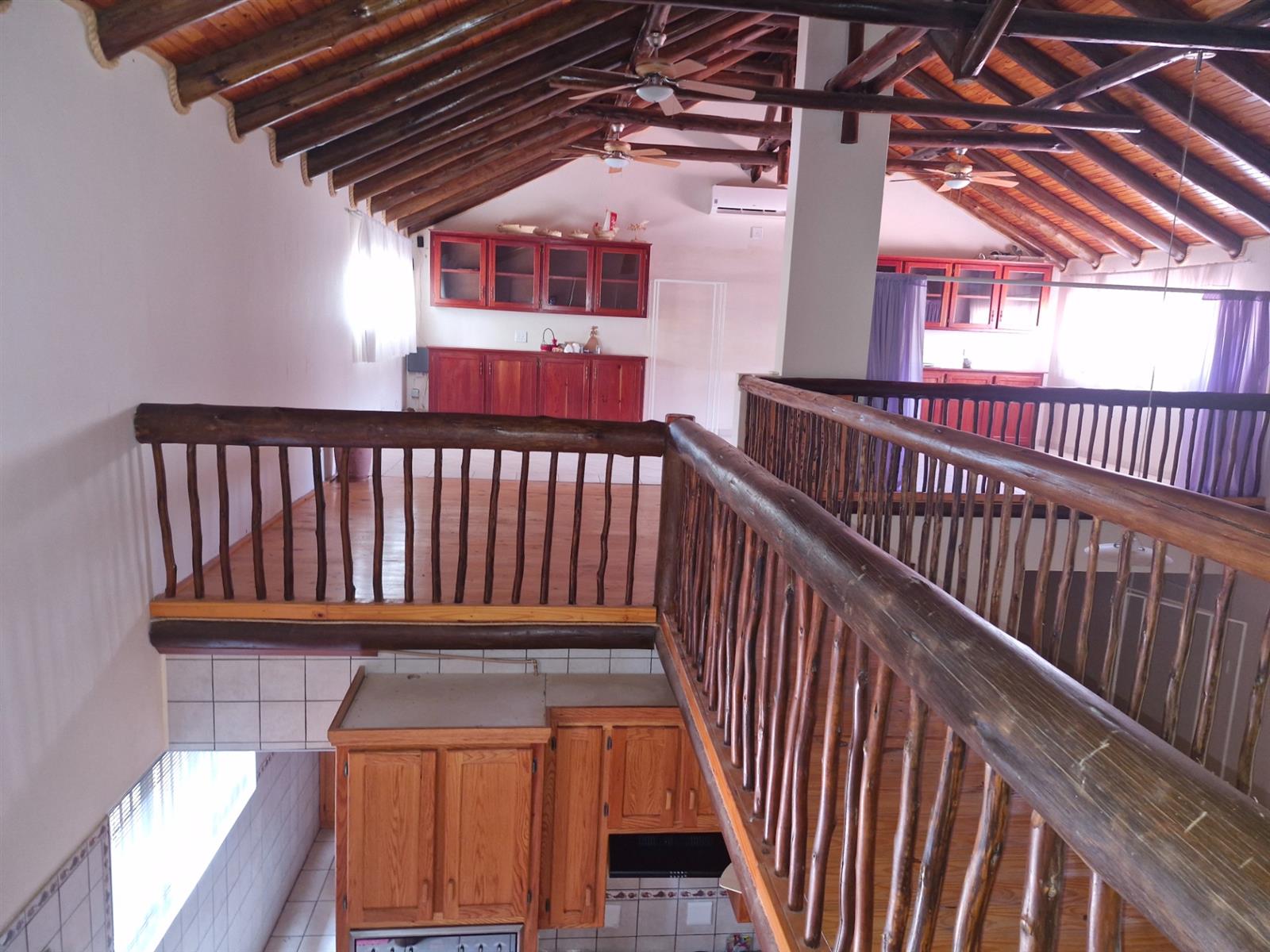The double-volume ceilings with exposed beams enhance the sense of space and light, creating a warm and inviting ambience.