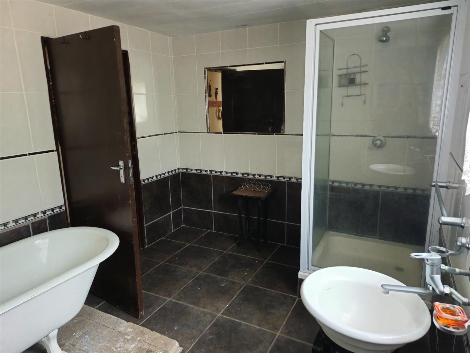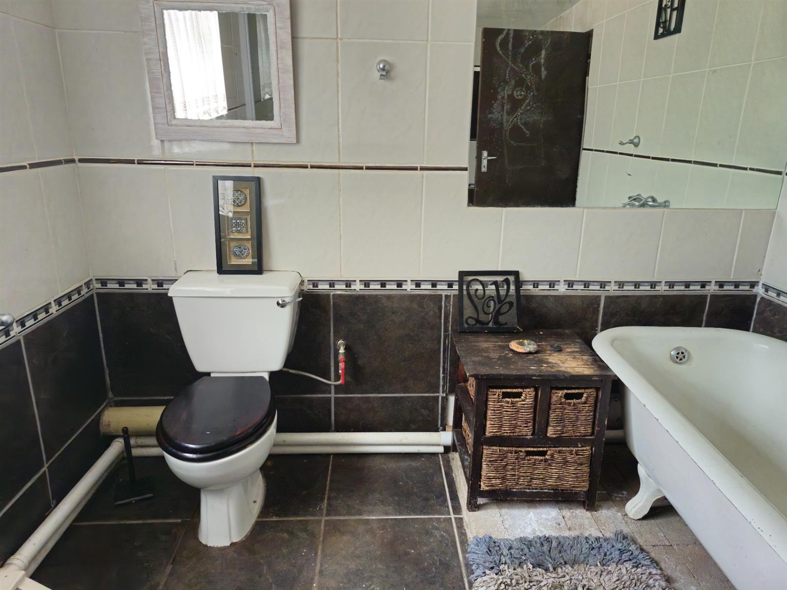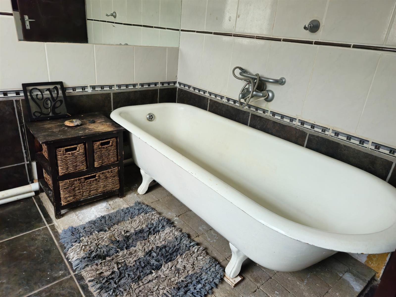 There are two bathrooms. The downstairs bathroom is fully equipped with a shower, a charming Victorian-style bath, basin and toilet.