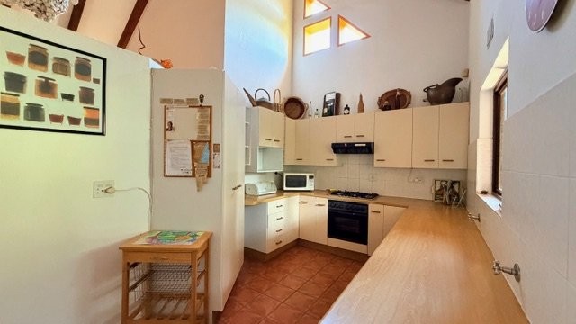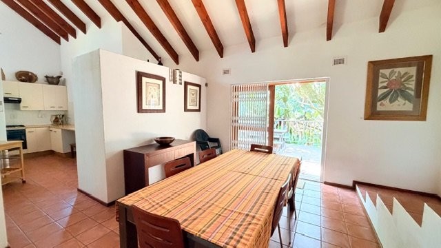 Inside, the home unfolds into warm, light-filled living areas designed for relaxed everyday living and effortless entertaining. The kitchen opens onto an enclosed courtyard, offering a private and practical outdoor extension, while the dining room and spacious lounge flow seamlessly together. Vaulted ceilings with exposed wooden beams enhance the sense of space and character, complemented by terracotta tiled floors and bold yet tasteful colour accents. Large windows and sliding doors invite natural light throughout, creating an airy, welcoming atmosphere. The main bedroom is a peaceful retreat, complete with a walk-in cupboard, en-suite bathroom and direct access to a private patio.