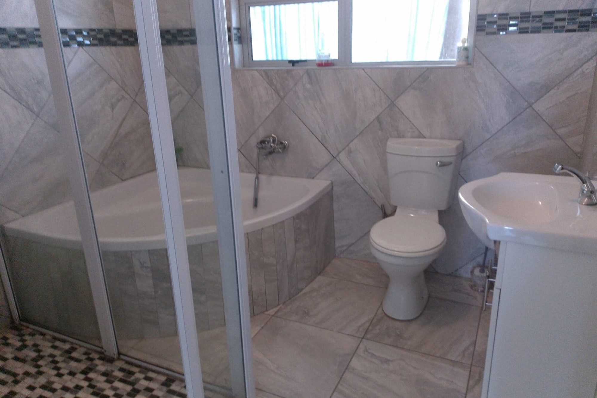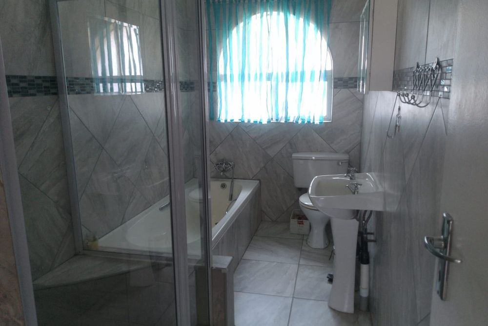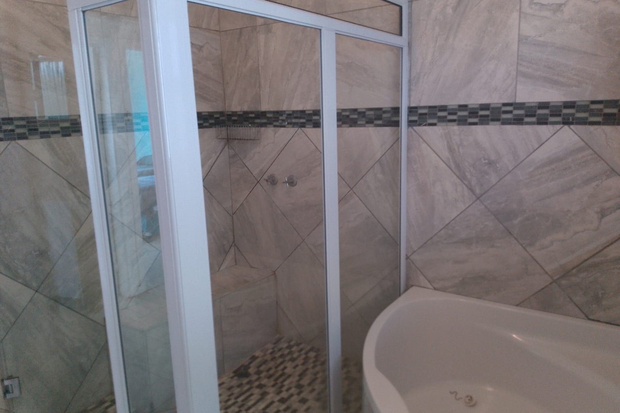 The home features one spacious full bathroom and four standard bedrooms, each equipped with built-in wardrobes. The master bedroom is a highlight, with its generous space allowing for a cosy seating area, a large window that floods the room with natural light, and an en-suite full bathroom. The en-suite boasts a combination of a bathtub and a glass-enclosed shower, a pedestal sink, and a toilet, all set against stylish grey marble-like tiles with a decorative border.