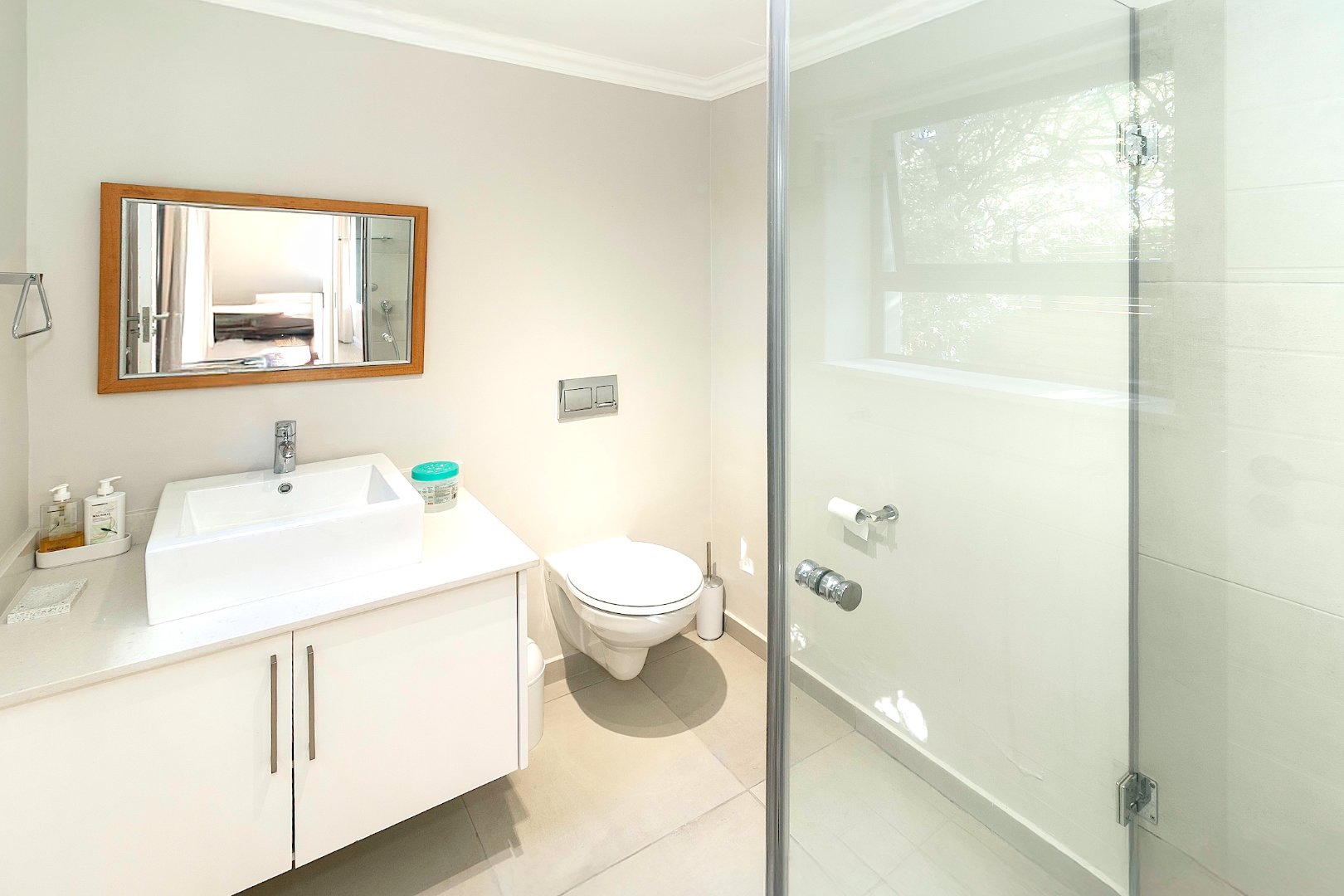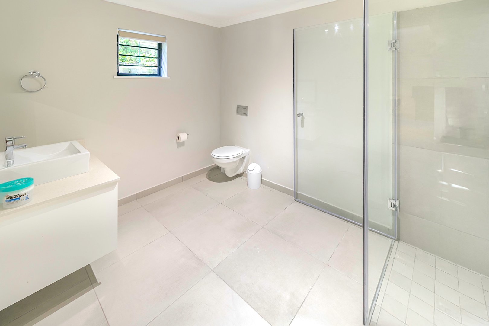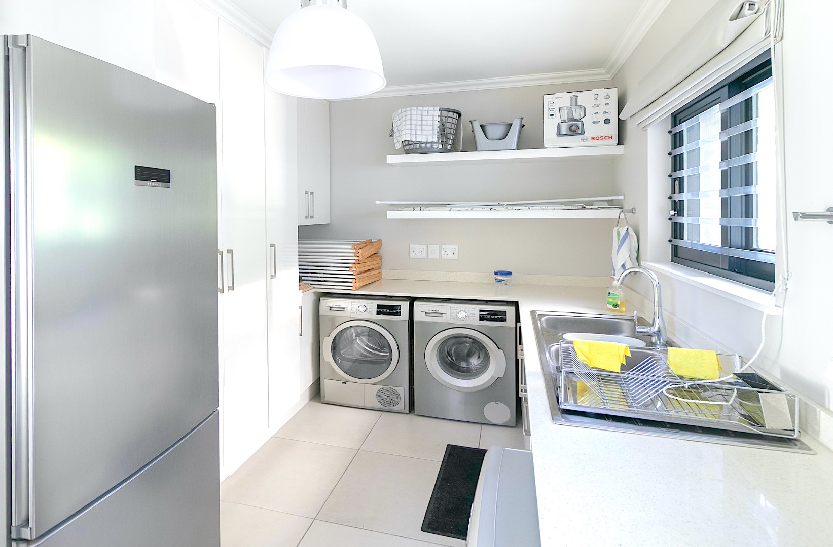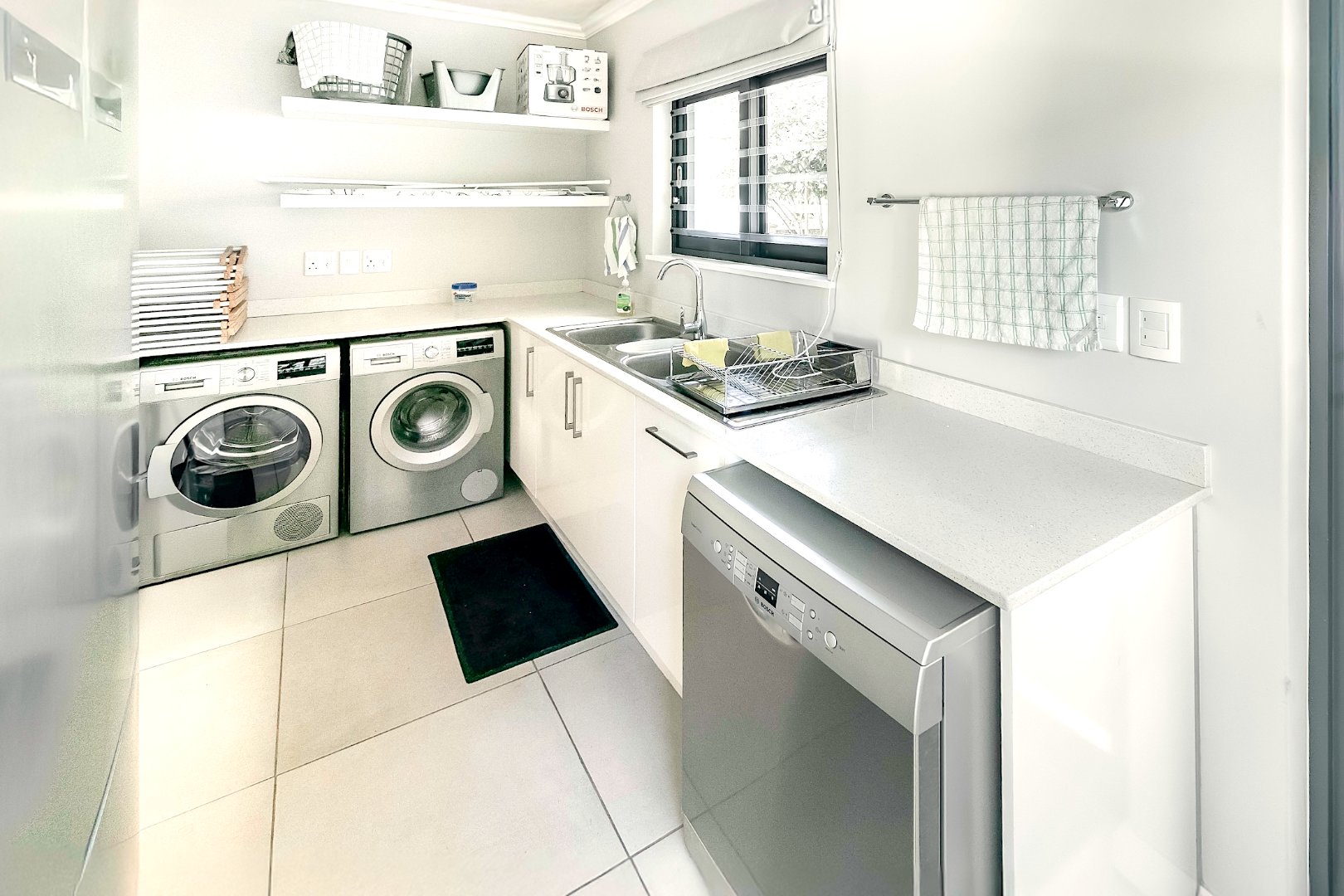 At the heart of the home is a sleek, modern kitchen, equipped with premium appliances, streamlined cabinetry, and a generous scullery. Whether you’re preparing a gourmet meal or enjoying a casual breakfast, this space is both functional and stylish.