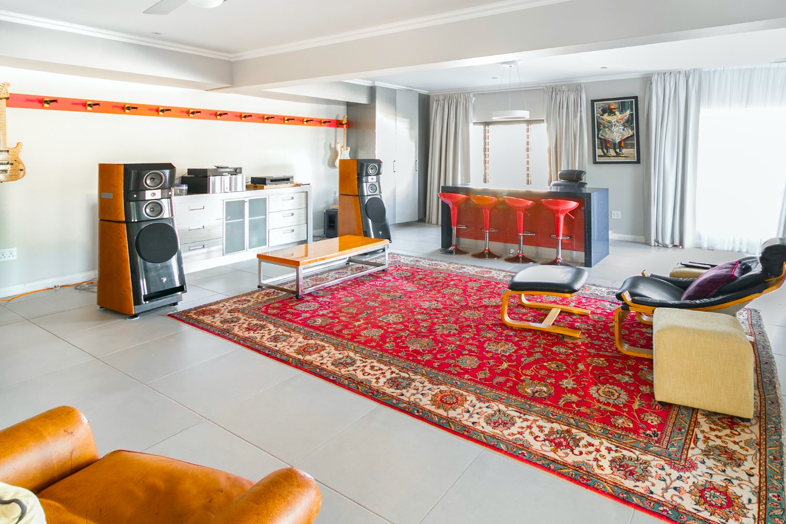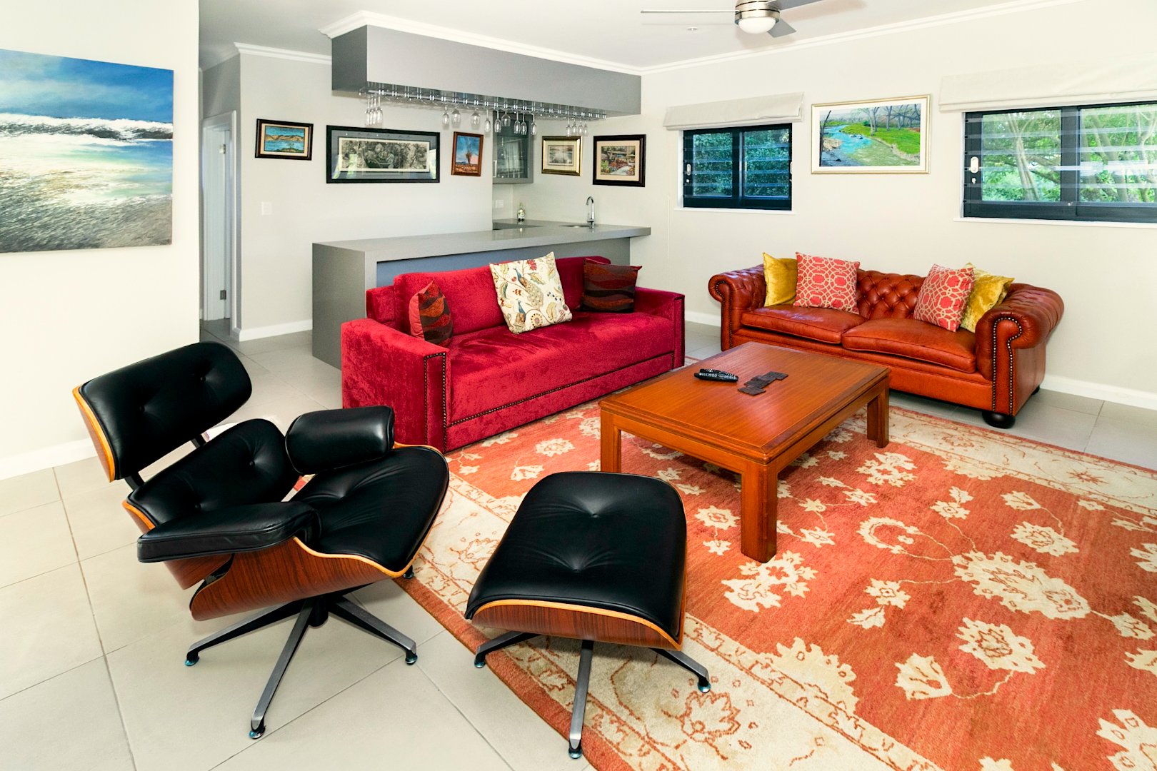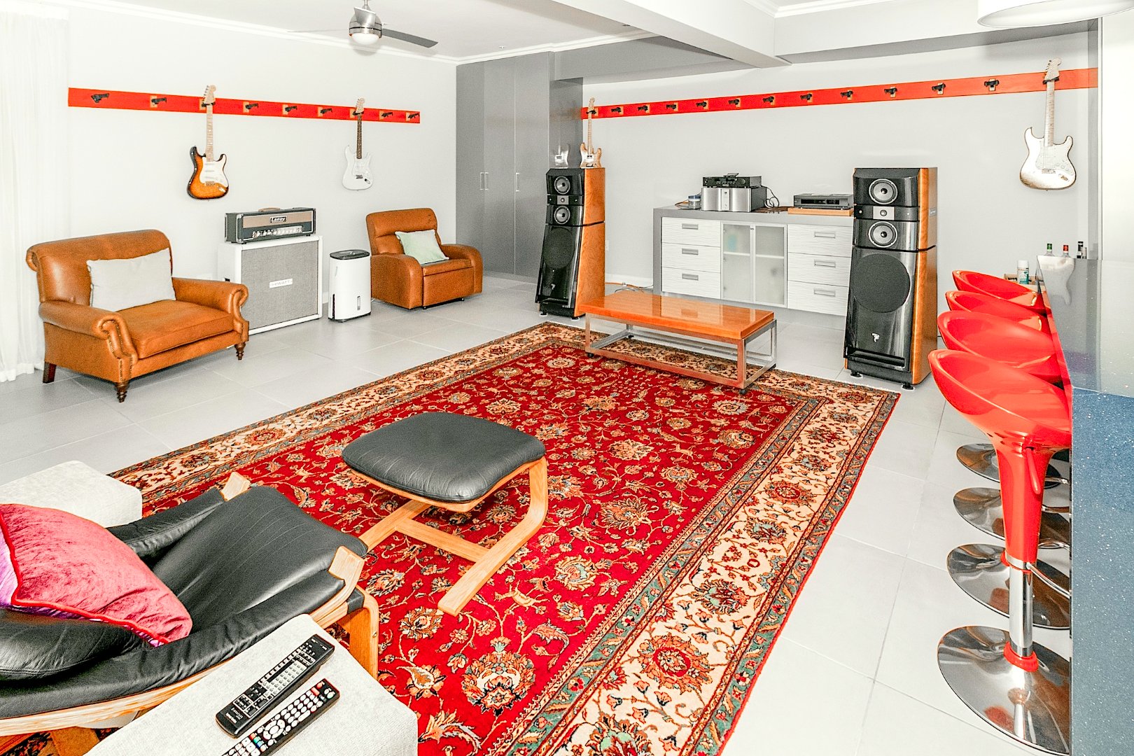 To the right, the TV lounge offers a more relaxed setting with a built-in pub — ideal for entertaining guests during sports events or movie nights. From here, sliding doors open into an enclosed music / games room, overlooking the lagoon as well.