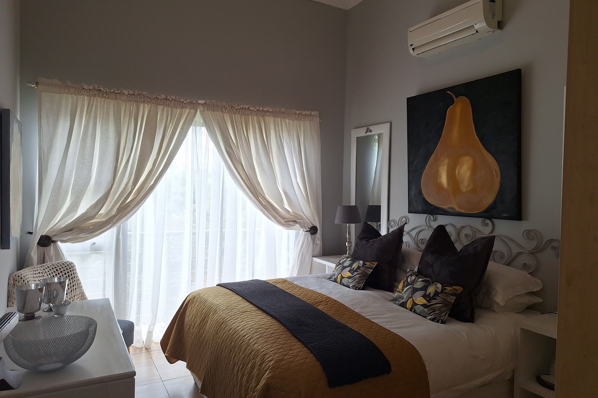 The living space extends through sliding doors to an enclosed patio with a built-in braai, ideal for hosting gatherings year-round. Step outside to enjoy the sparkling swimming pool, set amid a lush, landscaped garden that provides privacy and tranquility.