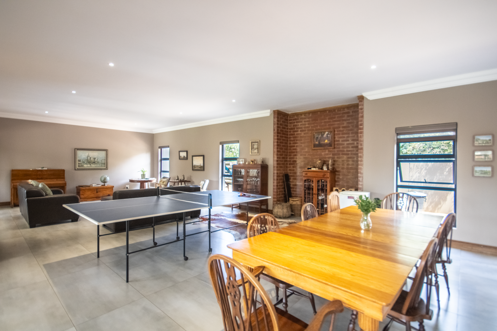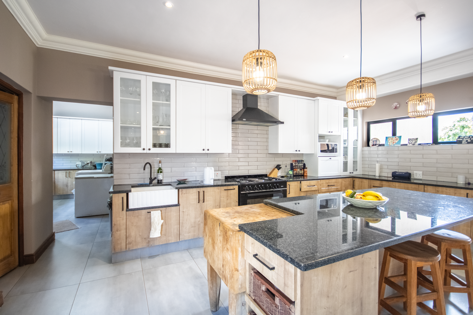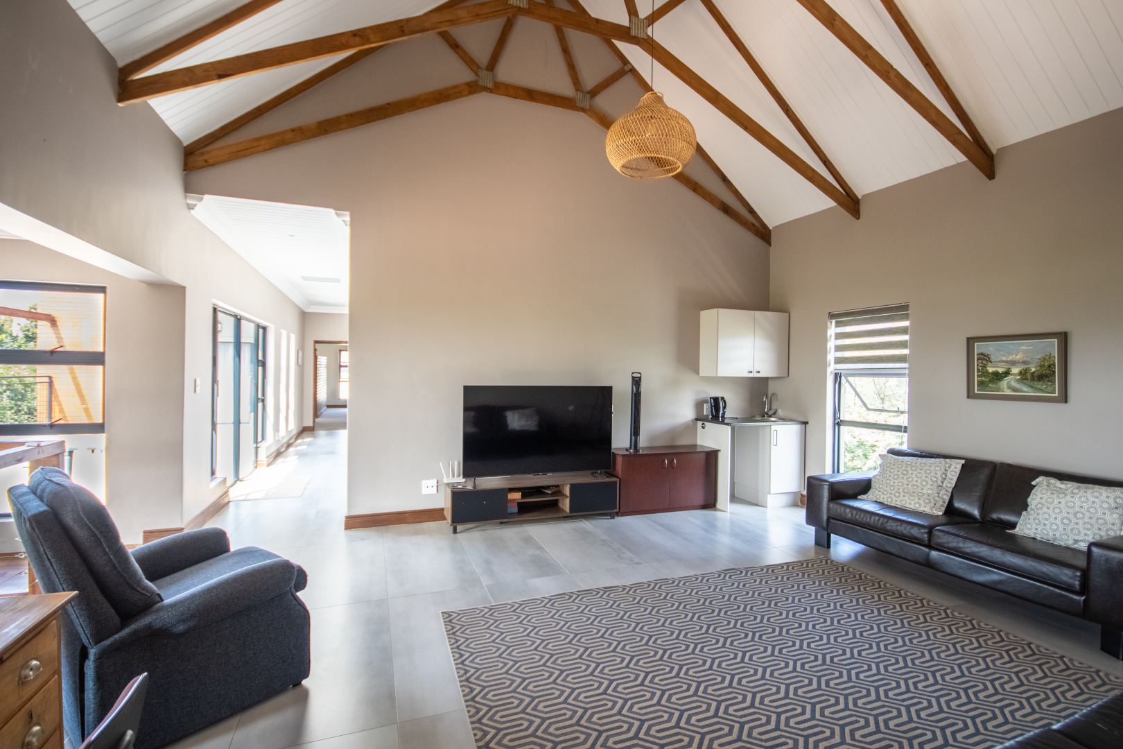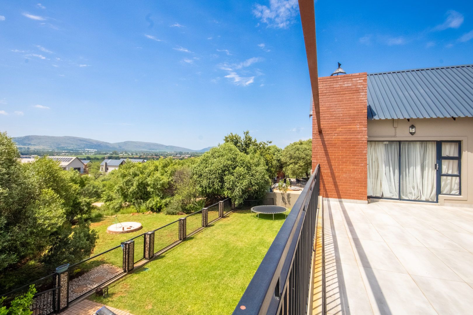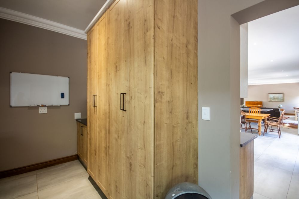 Upstairs, the home continues to impress. To one side, a private bedroom sits quietly in its own wing, ideal for guests or as a secluded hideaway. A pajama lounge at the heart of the upper level offers the family a cozy space to gather and relax. Two generously sized bedrooms share a bathroom and are thoughtfully positioned near a large balcony that boasts breathtaking sunset views over the bushveld. The main bedroom is the ultimate retreat, complete with a luxurious dressing room and a spacious en-suite bathroom where black bohemian tiles create a striking yet inviting atmosphere.