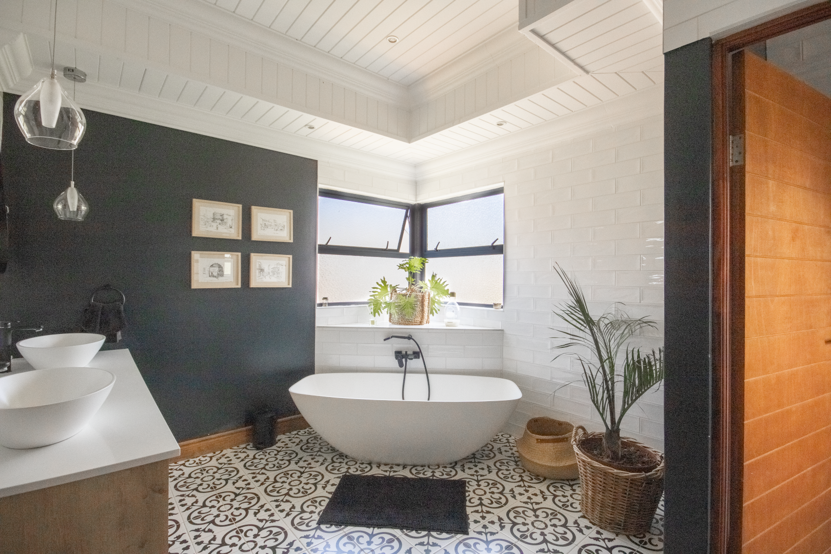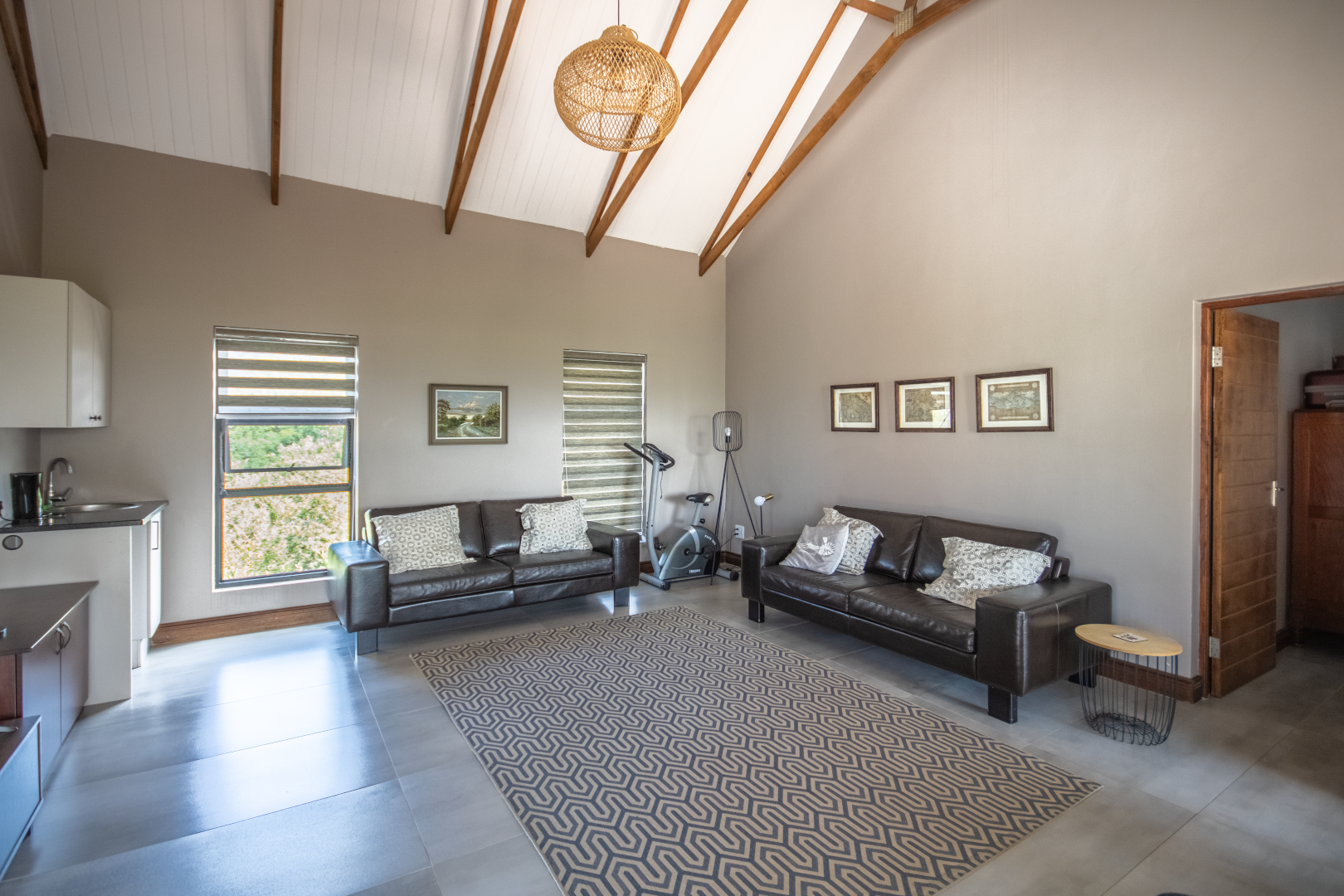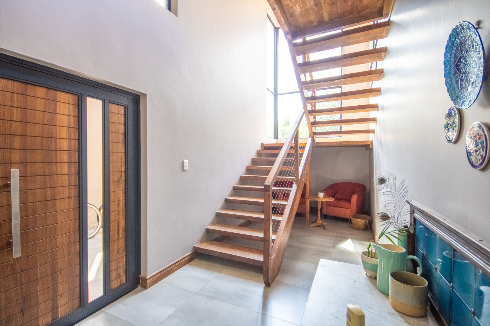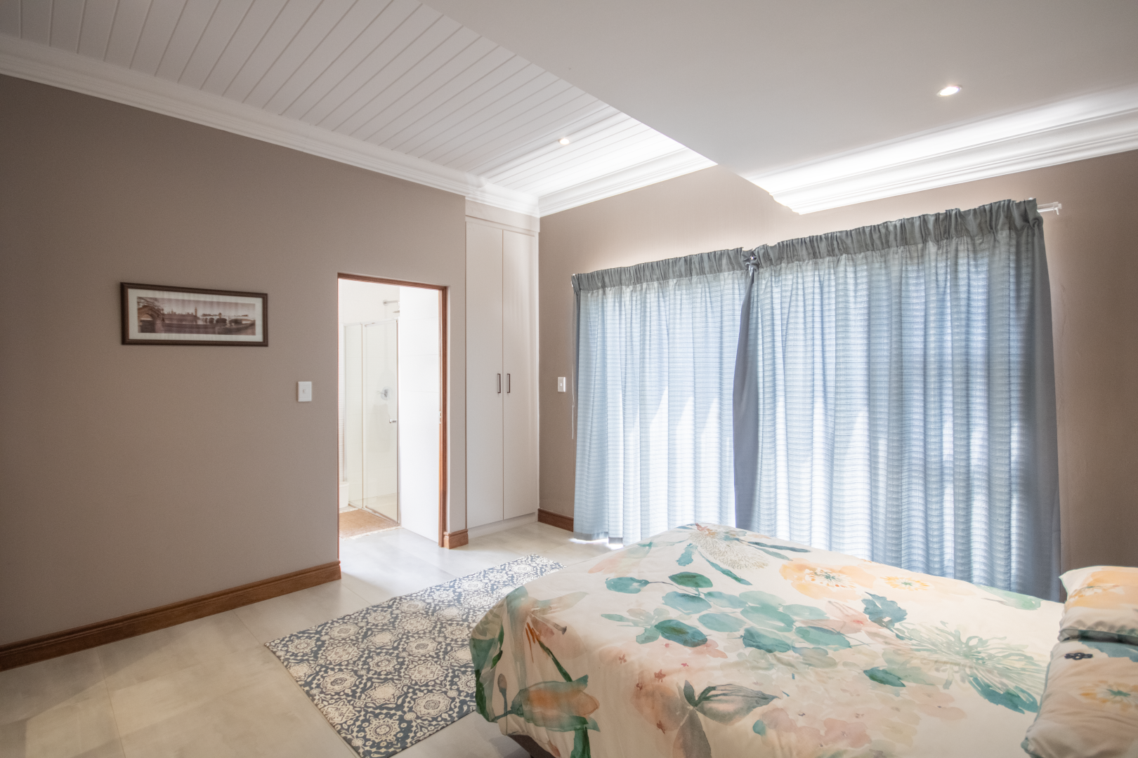 Upstairs, the home continues to impress. To one side, a private bedroom sits quietly in its own wing, ideal for guests or as a secluded hideaway. A pajama lounge at the heart of the upper level offers the family a cozy space to gather and relax. Two generously sized bedrooms share a bathroom and are thoughtfully positioned near a large balcony that boasts breathtaking sunset views over the bushveld. The main bedroom is the ultimate retreat, complete with a luxurious dressing room and a spacious en-suite bathroom where black bohemian tiles create a striking yet inviting atmosphere.