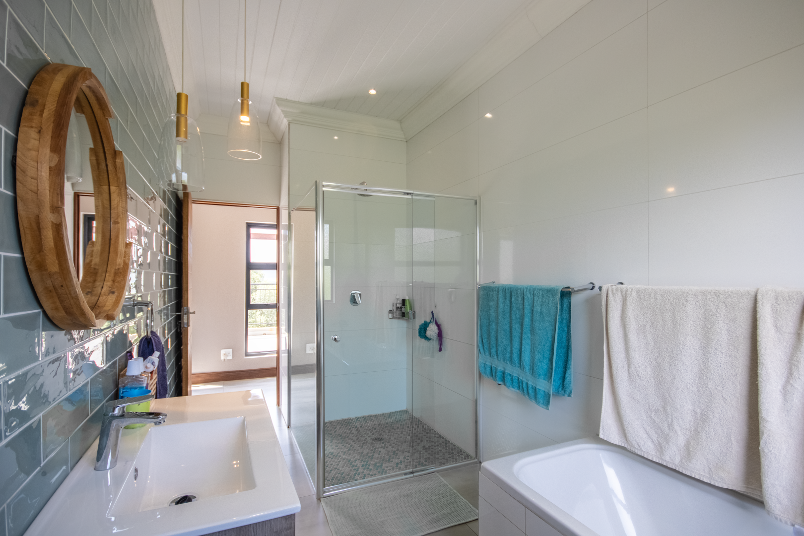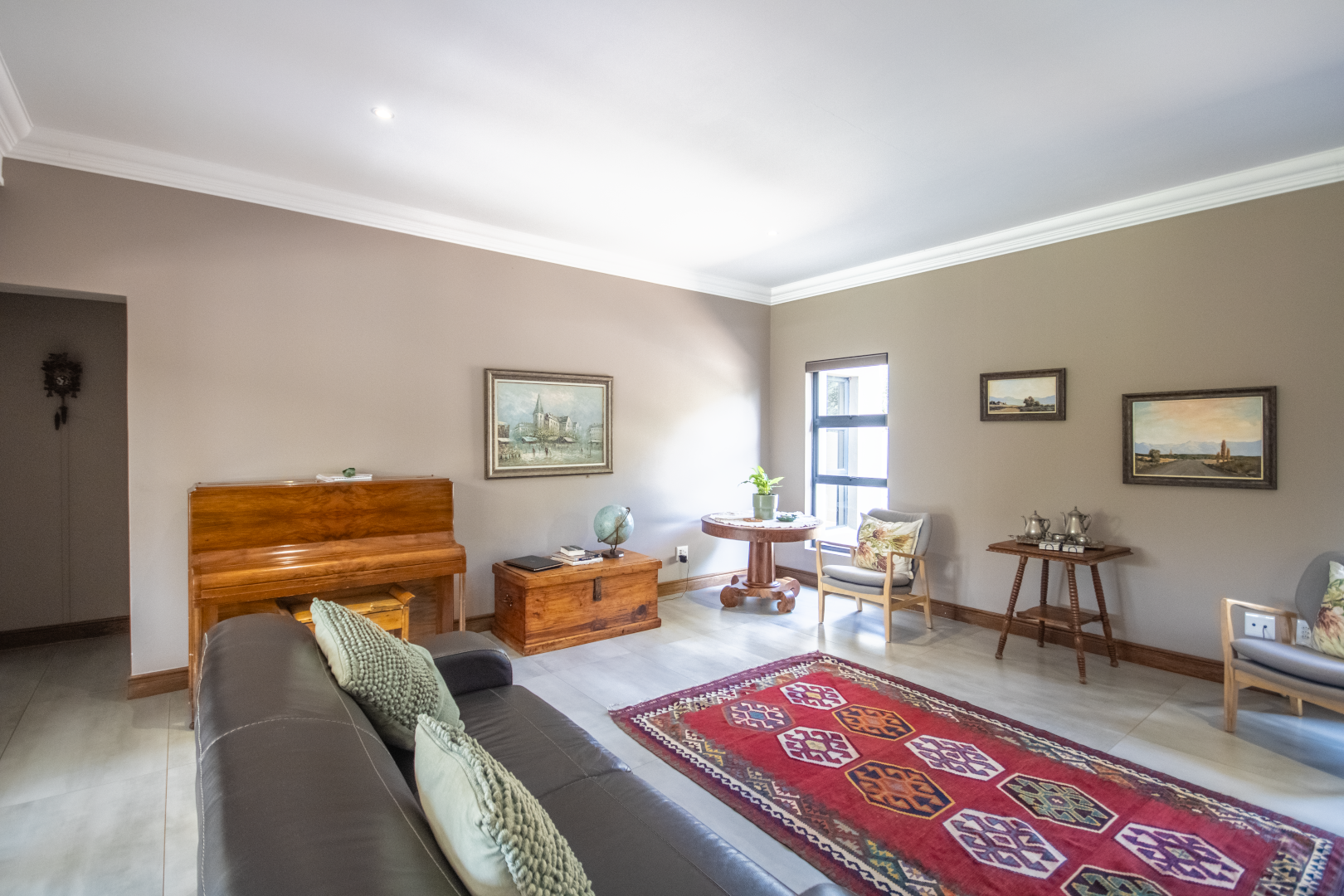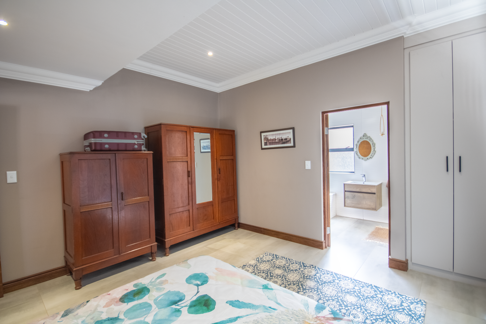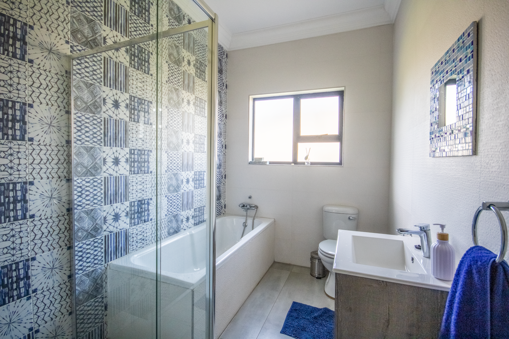 Upstairs, the home continues to impress. To one side, a private bedroom sits quietly in its own wing, ideal for guests or as a secluded hideaway. A pajama lounge at the heart of the upper level offers the family a cozy space to gather and relax. Two generously sized bedrooms share a bathroom and are thoughtfully positioned near a large balcony that boasts breathtaking sunset views over the bushveld. The main bedroom is the ultimate retreat, complete with a luxurious dressing room and a spacious en-suite bathroom where black bohemian tiles create a striking yet inviting atmosphere.