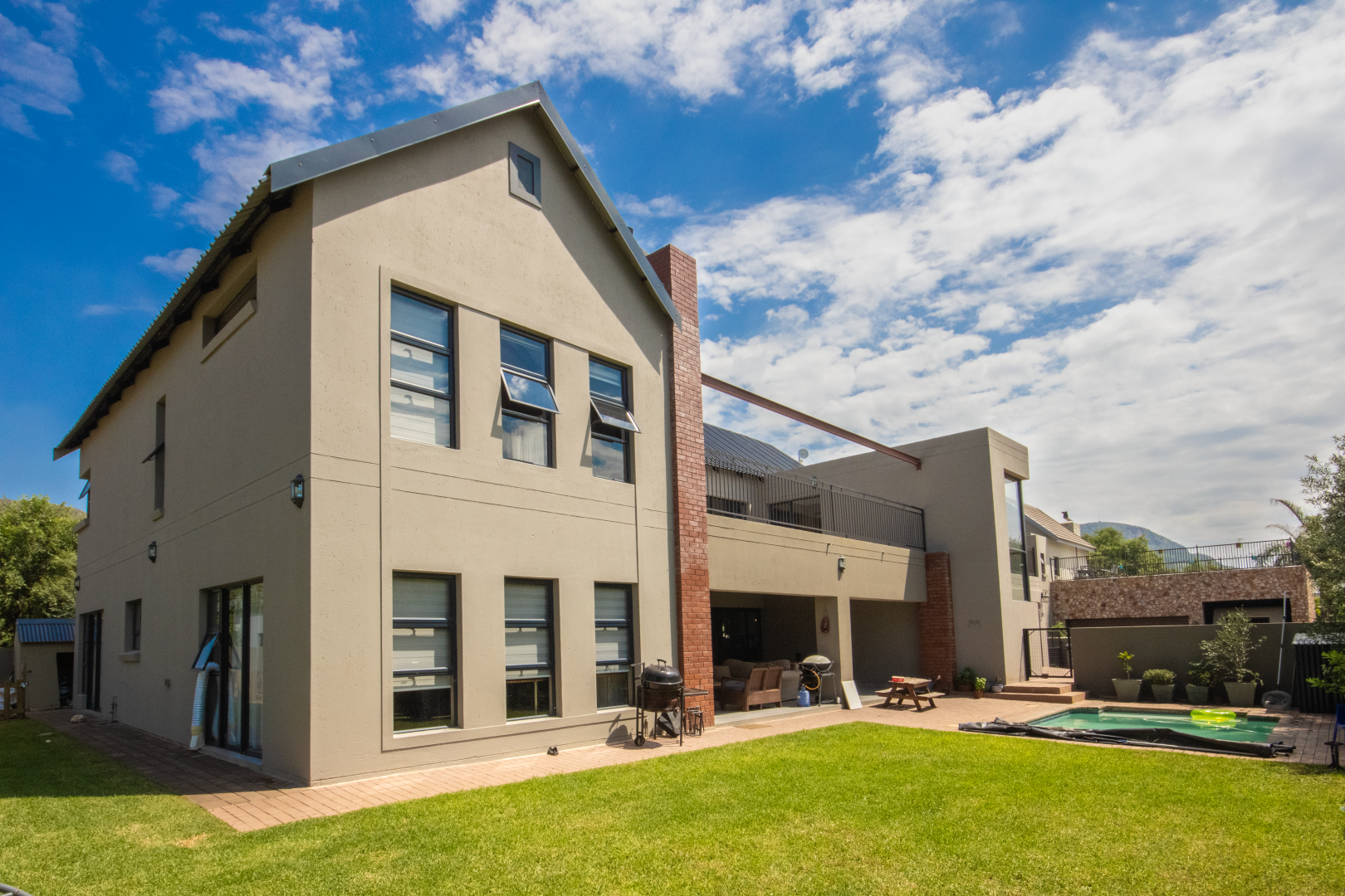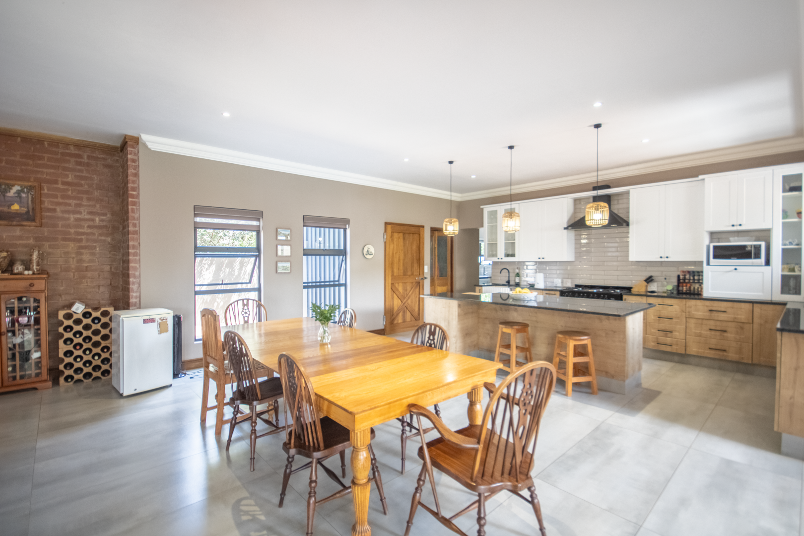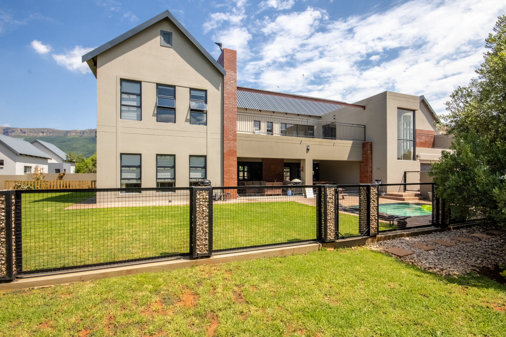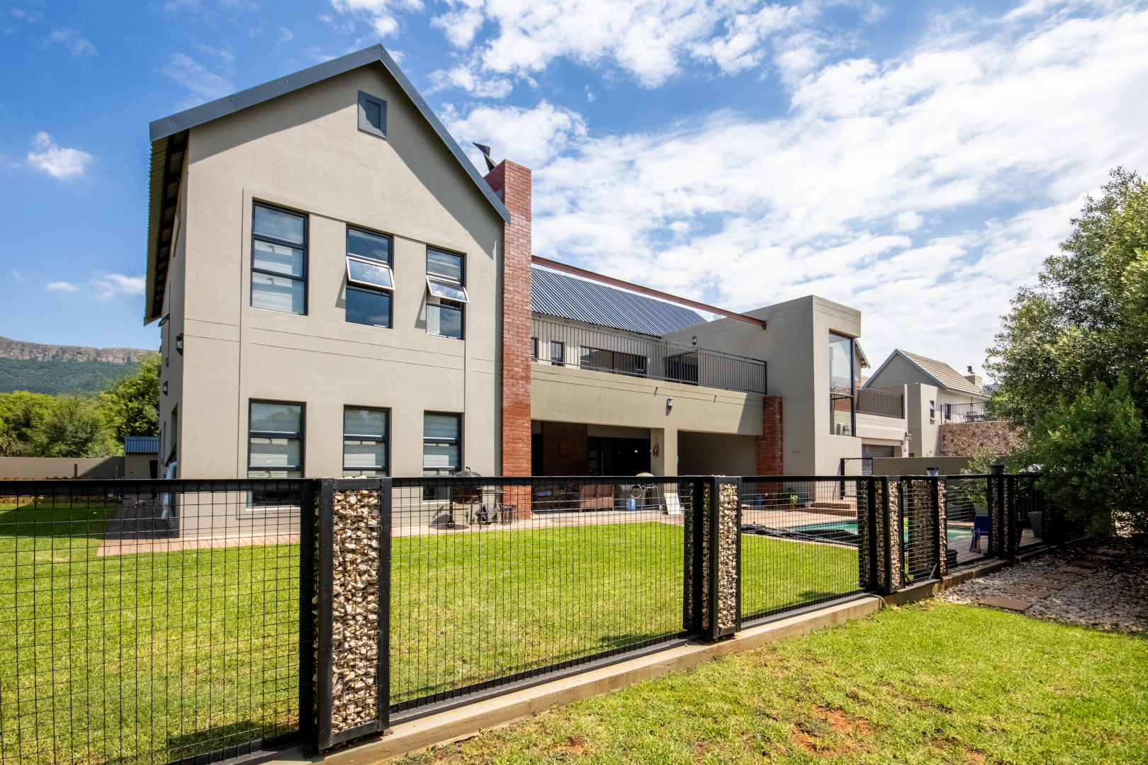 Set high on a hill in the prestigious Leloko Lifestyle Estate, this remarkable 5-bedroom home is a blend of industrial farmhouse charm and modern luxury. Designed with natural exposed brick and large glass elements, the house feels both contemporary and rustic, perfectly complementing its stunning surroundings.