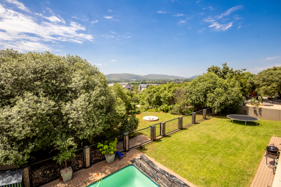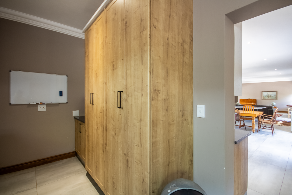 As you step inside, you're welcomed by an expansive open-plan living space where the kitchen, dining, and lounge areas flow effortlessly together. The kitchen, complete with a walk-in cool room, is both functional and stylish—a dream for anyone who loves to cook or entertain. From here, the living space extends onto a massive covered patio, a haven for entertaining or relaxing while soaking in the incredible views of the sparkling pool, lush garden, greenbelt, and Hartbeespoort Dam.