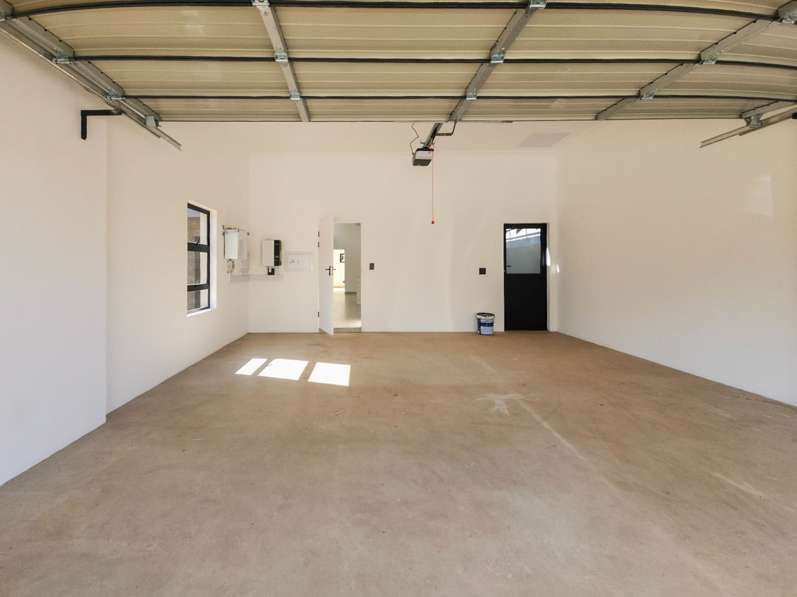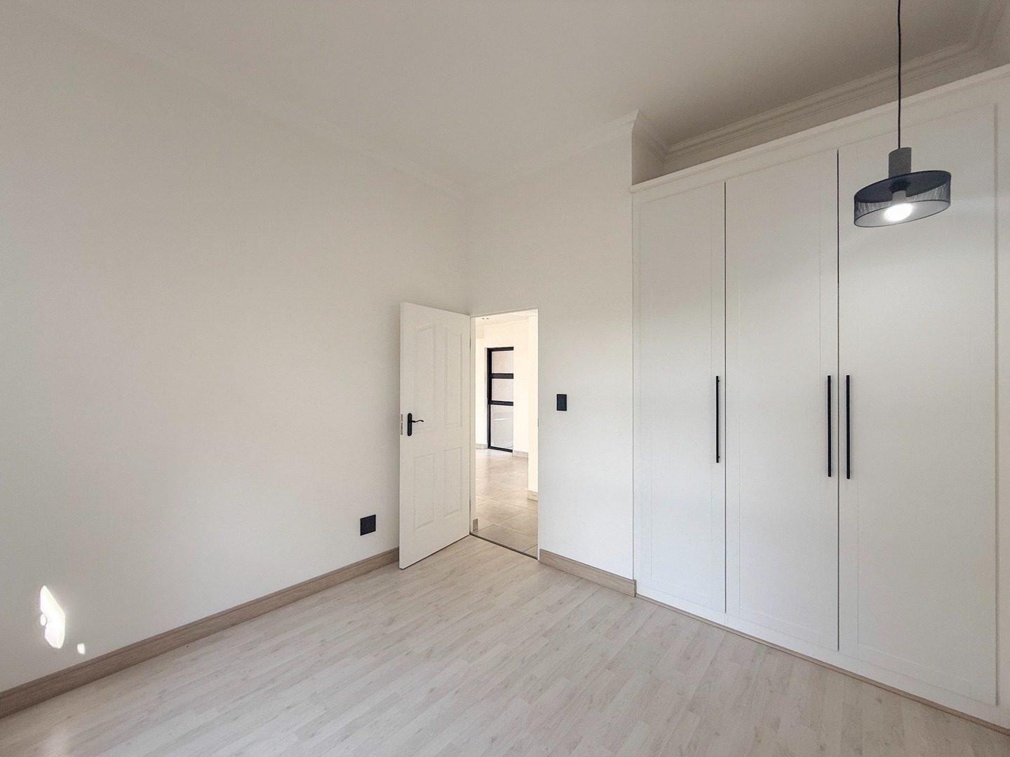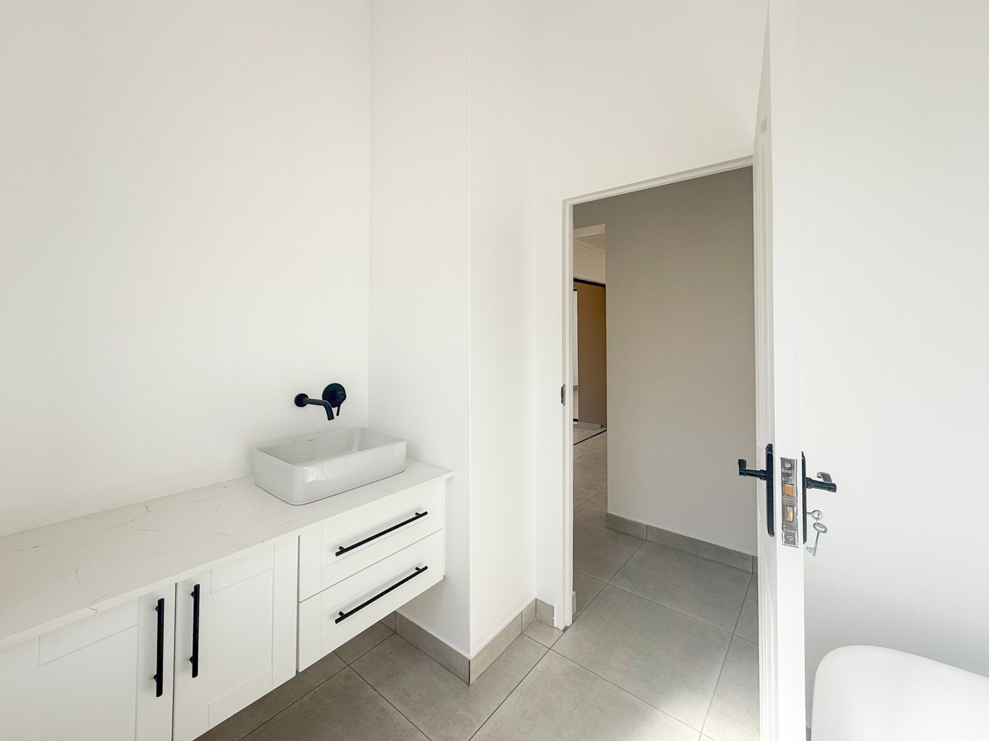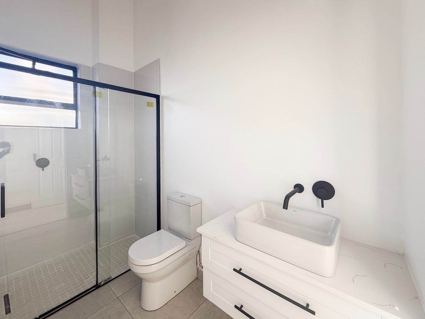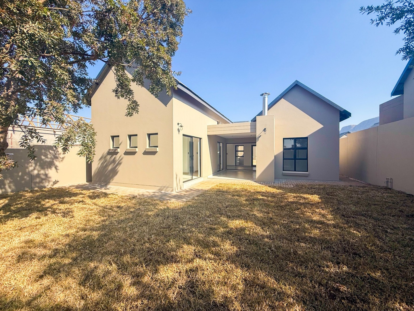 Each residence offers three well-appointed bedrooms and two sophisticated bathrooms featuring chic black-and-white finishes. The primary bedroom boasts a private en-suite bathroom, ensuring both comfort and privacy. Step outside onto the charming patio, perfect for enjoying alfresco meals while soaking in the estate’s serene ambiance. A double garage offers secure parking, while practical additions such as pre-paid water and electricity meters and a 5 kVA backup power inverter system provide peace of mind.