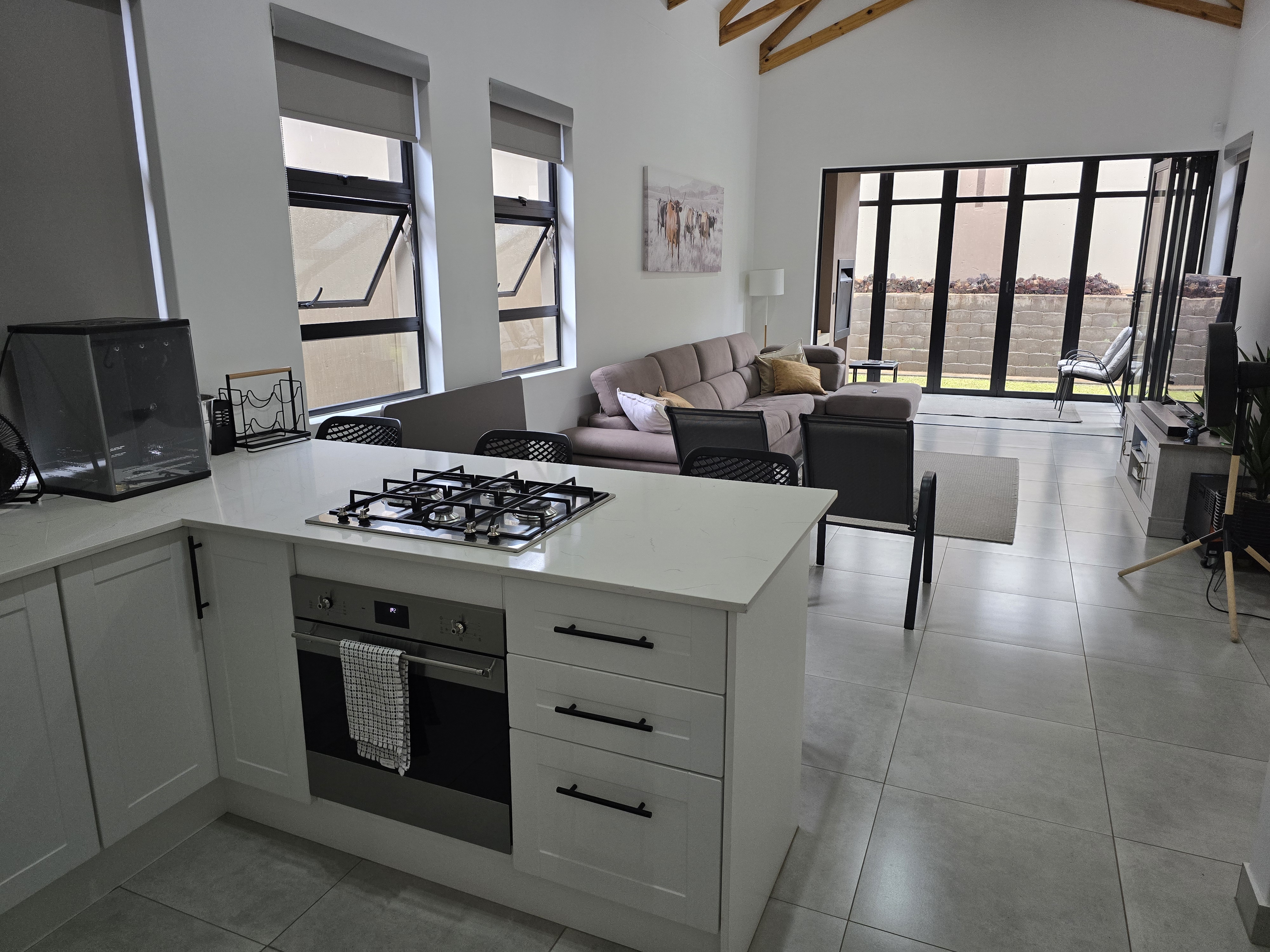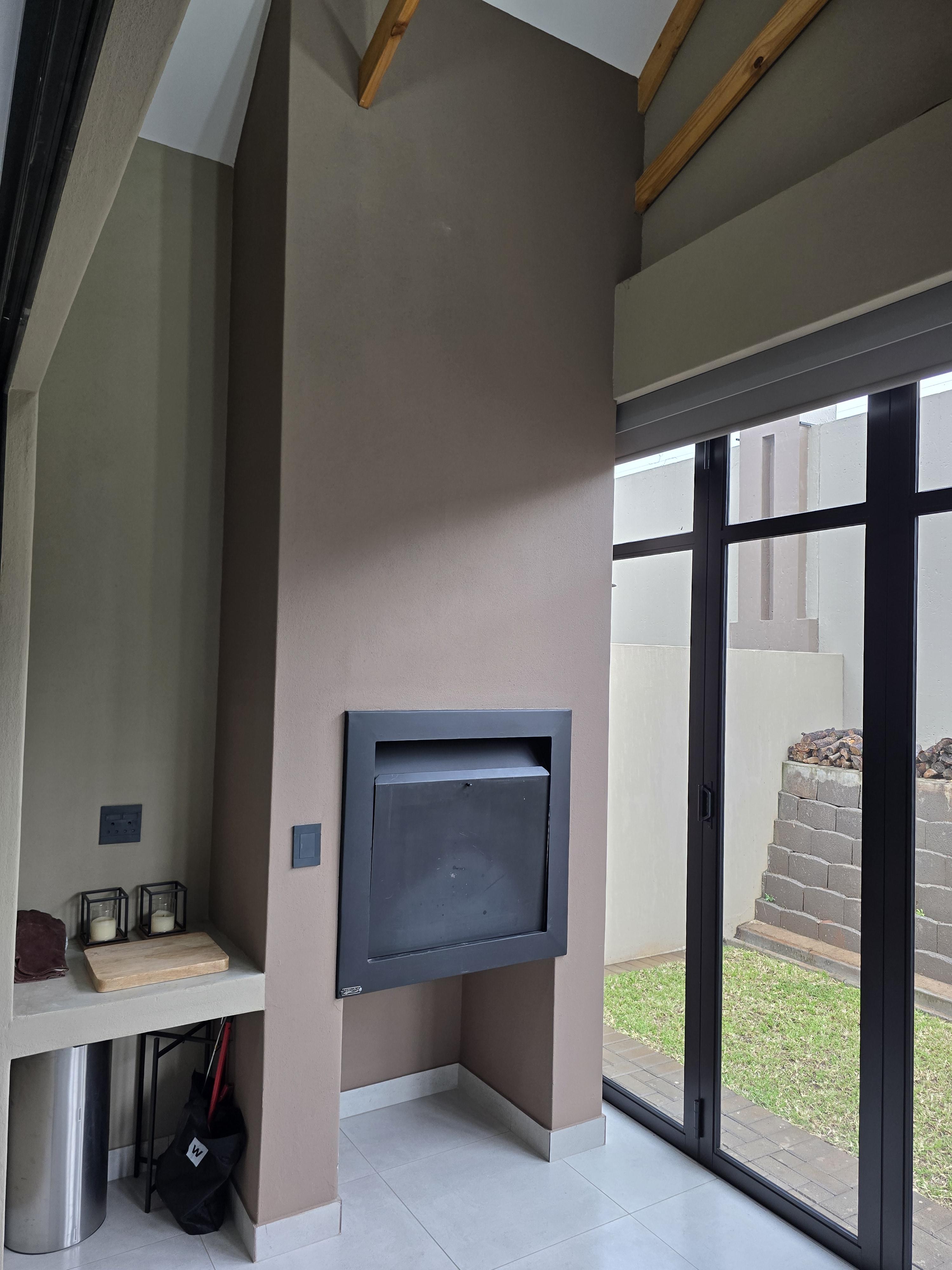 Flowing from the living space is an enclosed braai room with striking aluminium stacking doors, seamlessly connecting indoor and outdoor living.