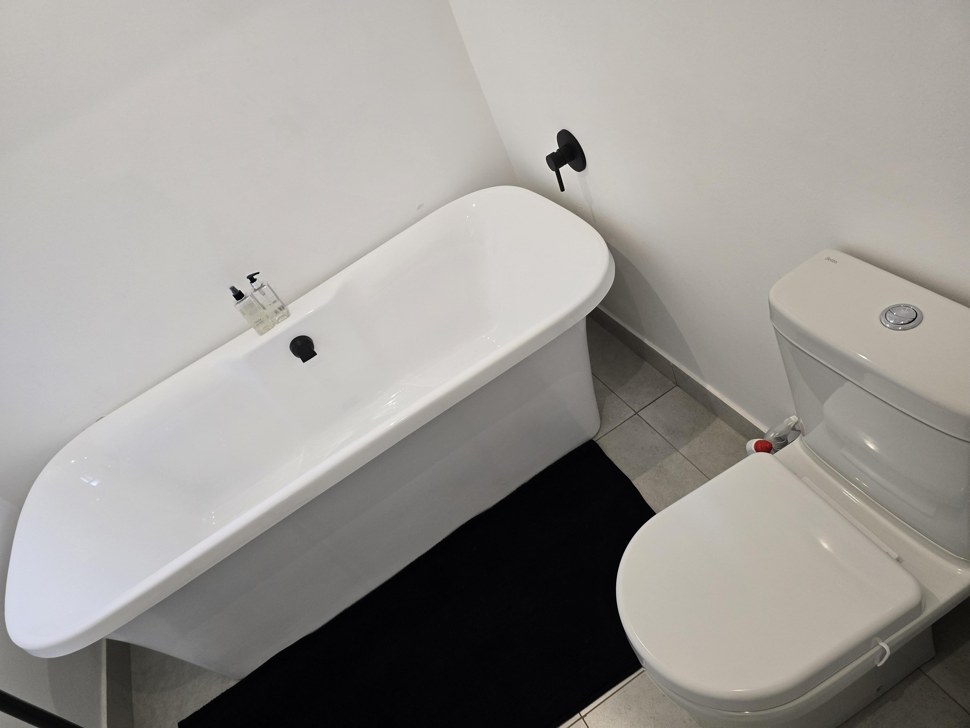 The main bedroom boasts a stylish en-suite bathroom with a spacious walk-in shower, while the guest bathroom is elegantly appointed with a freestanding bath offering a touch of indulgence.