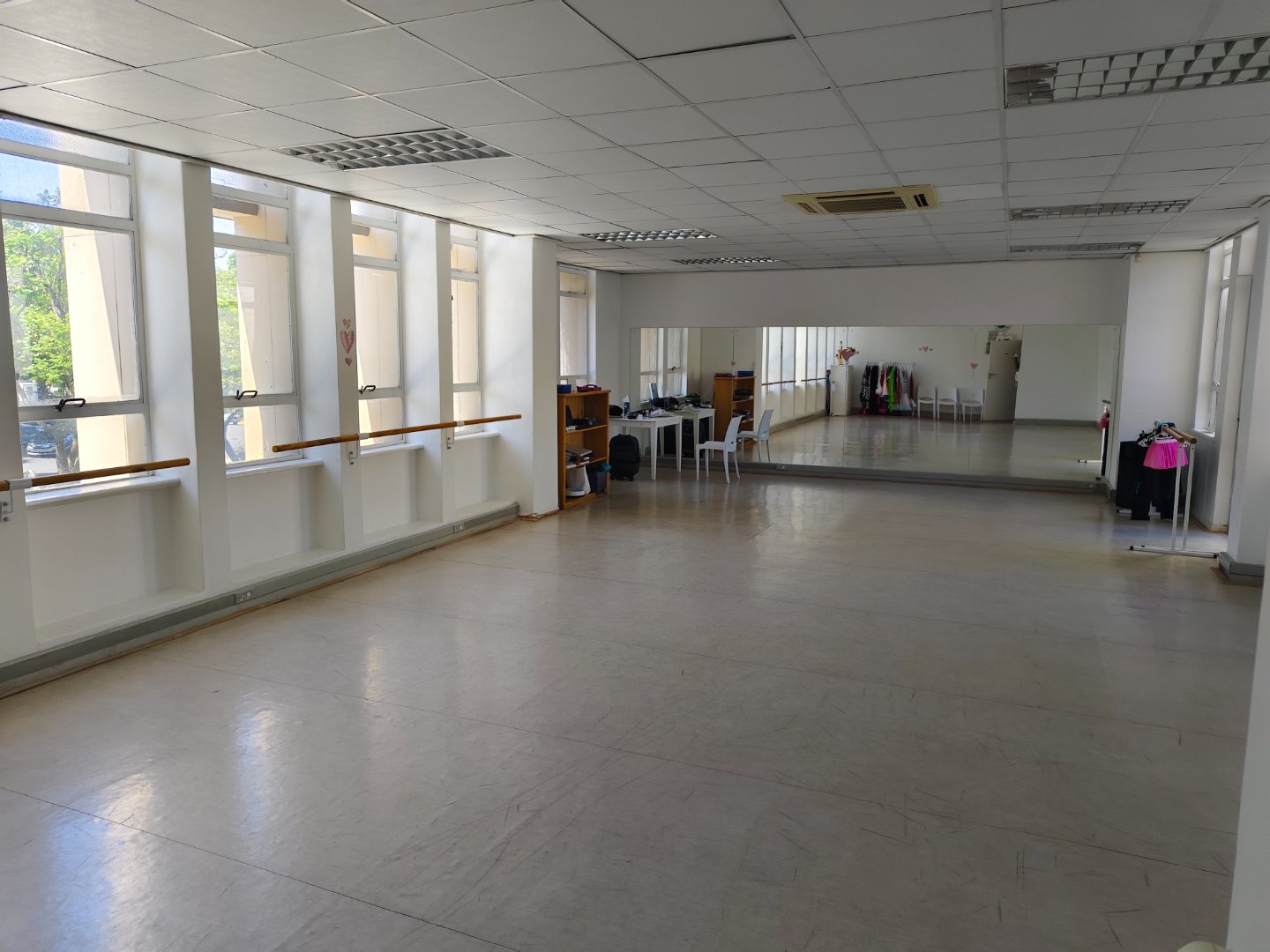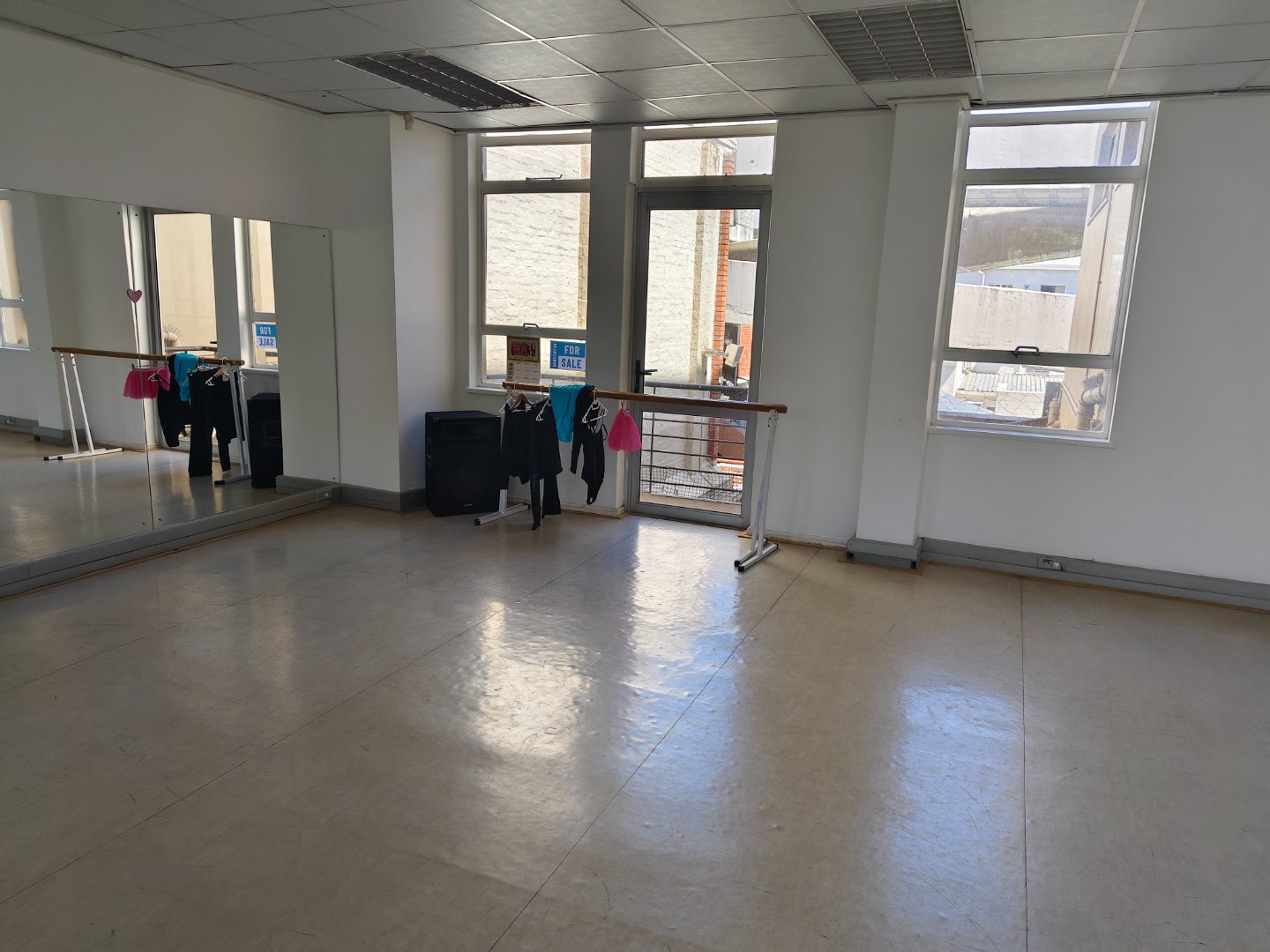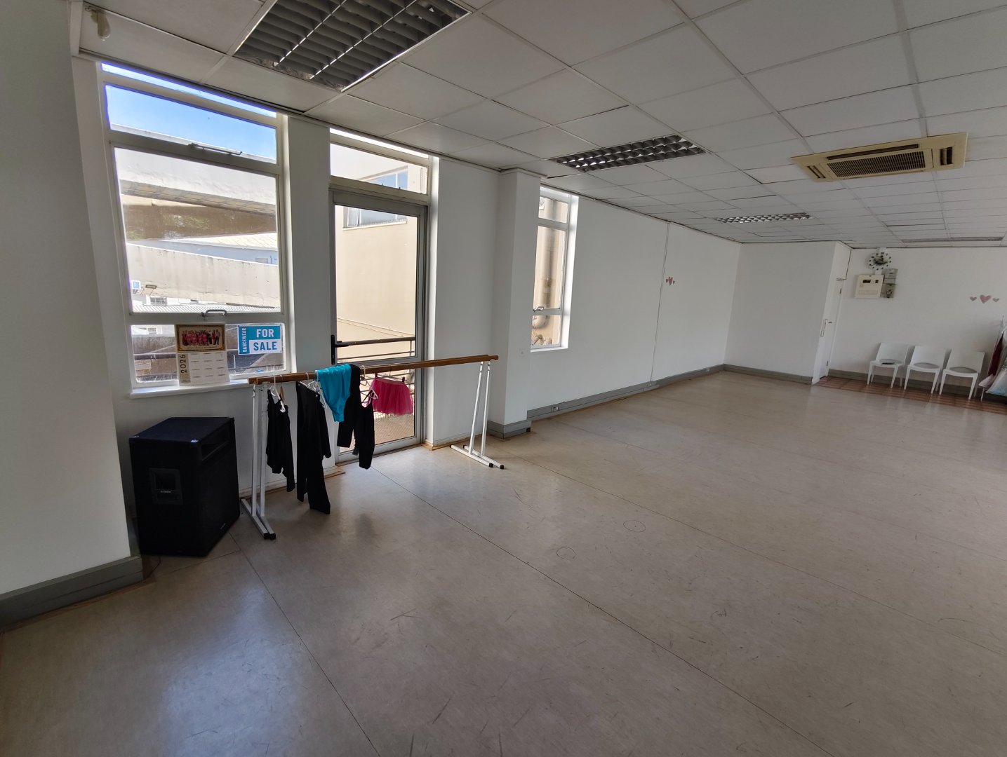 The current space with it's high ceilings is 93 sqm, there is a storage facility and under roof secured parking that comes with the purchase consideration. Currently the space is being used as a dance academy, but the mixed use zoning allows for any type of professional business services. There is sufficient natural light, pre paid electricity and three phase power for the aircon system.