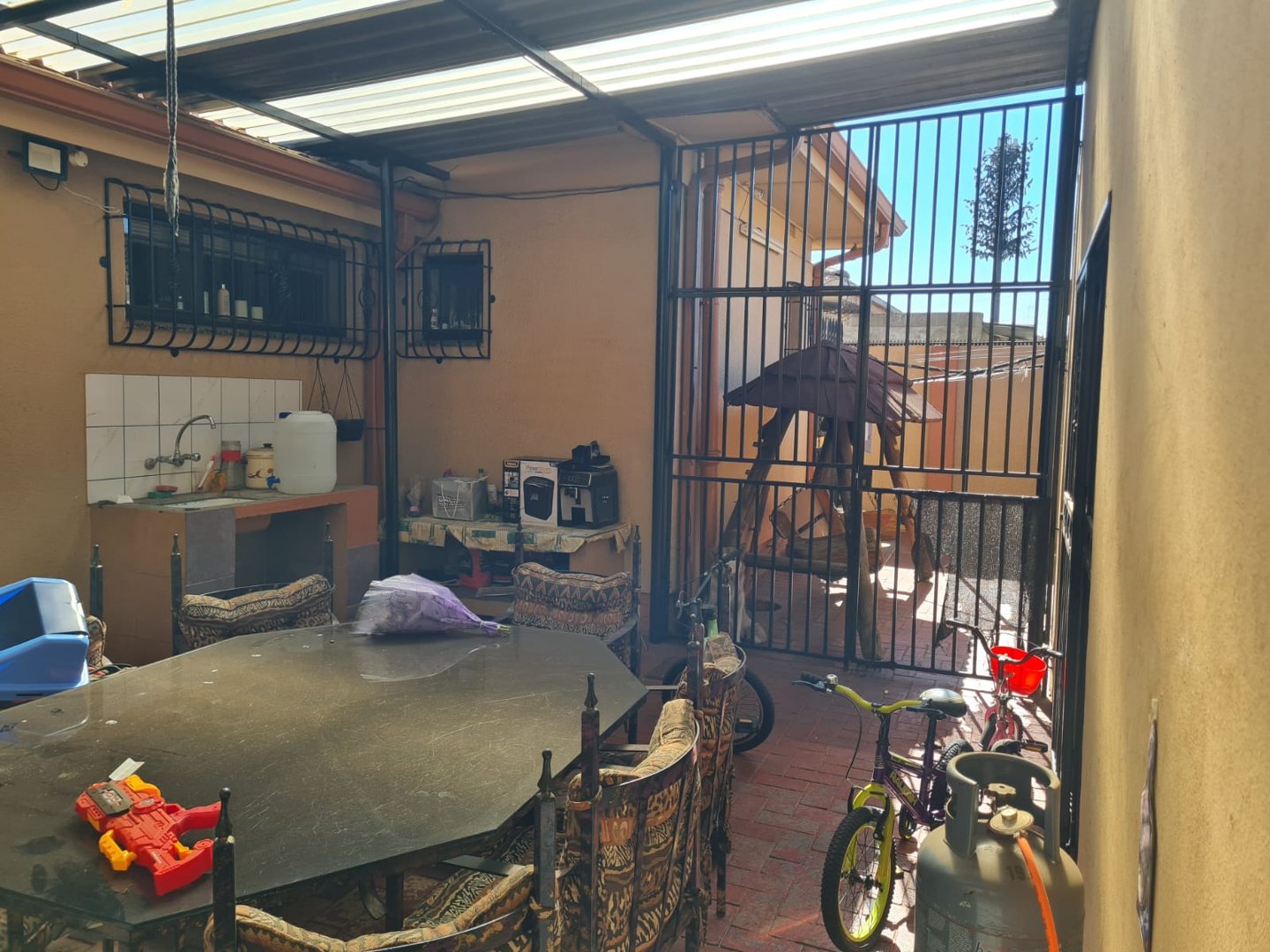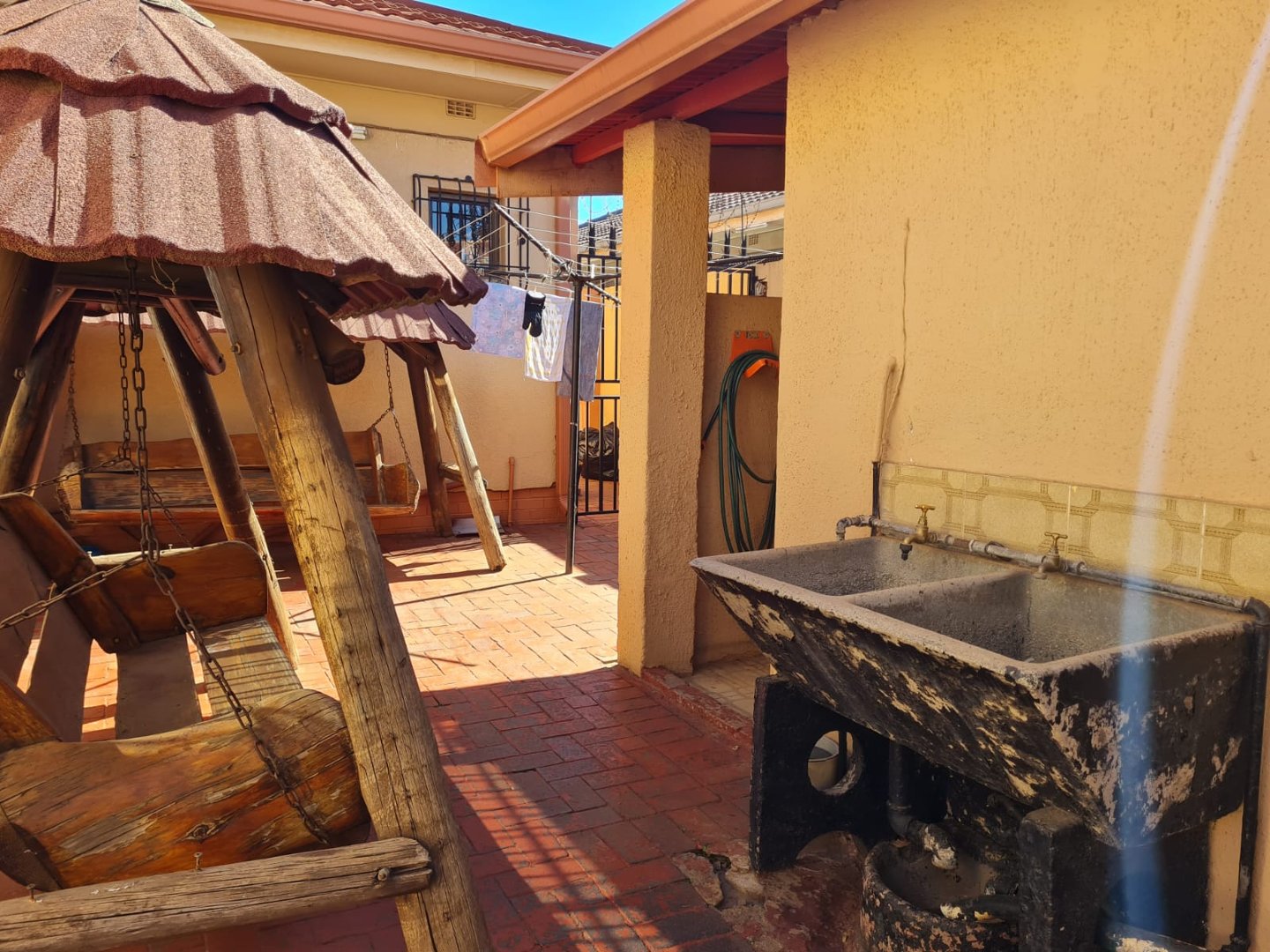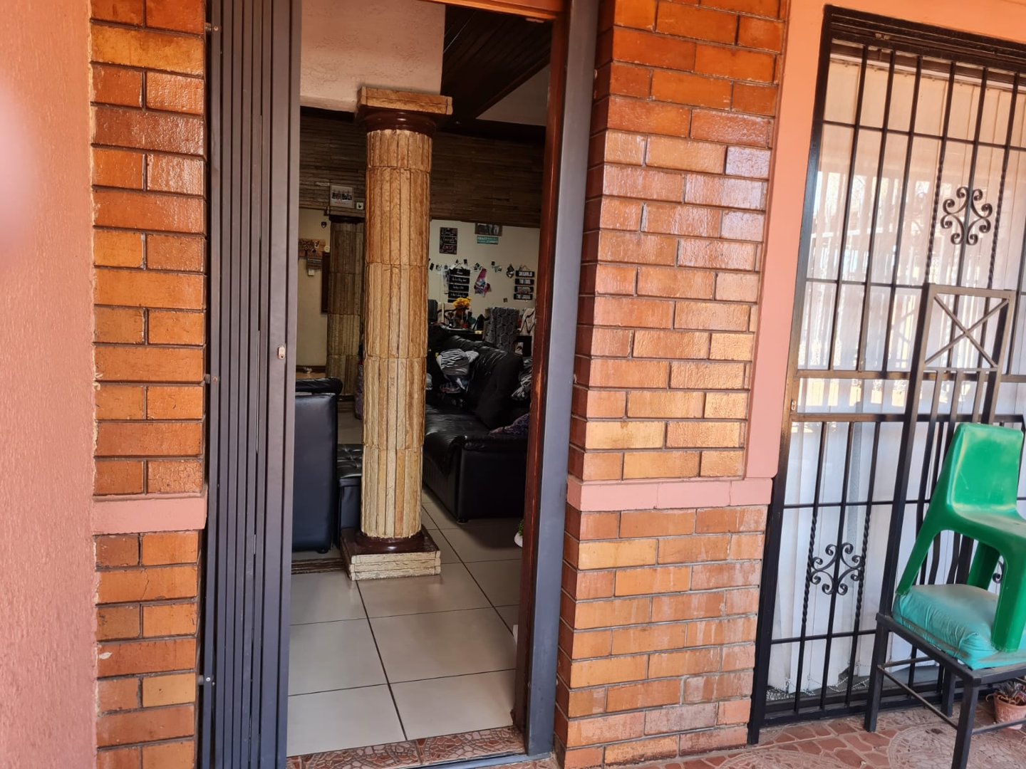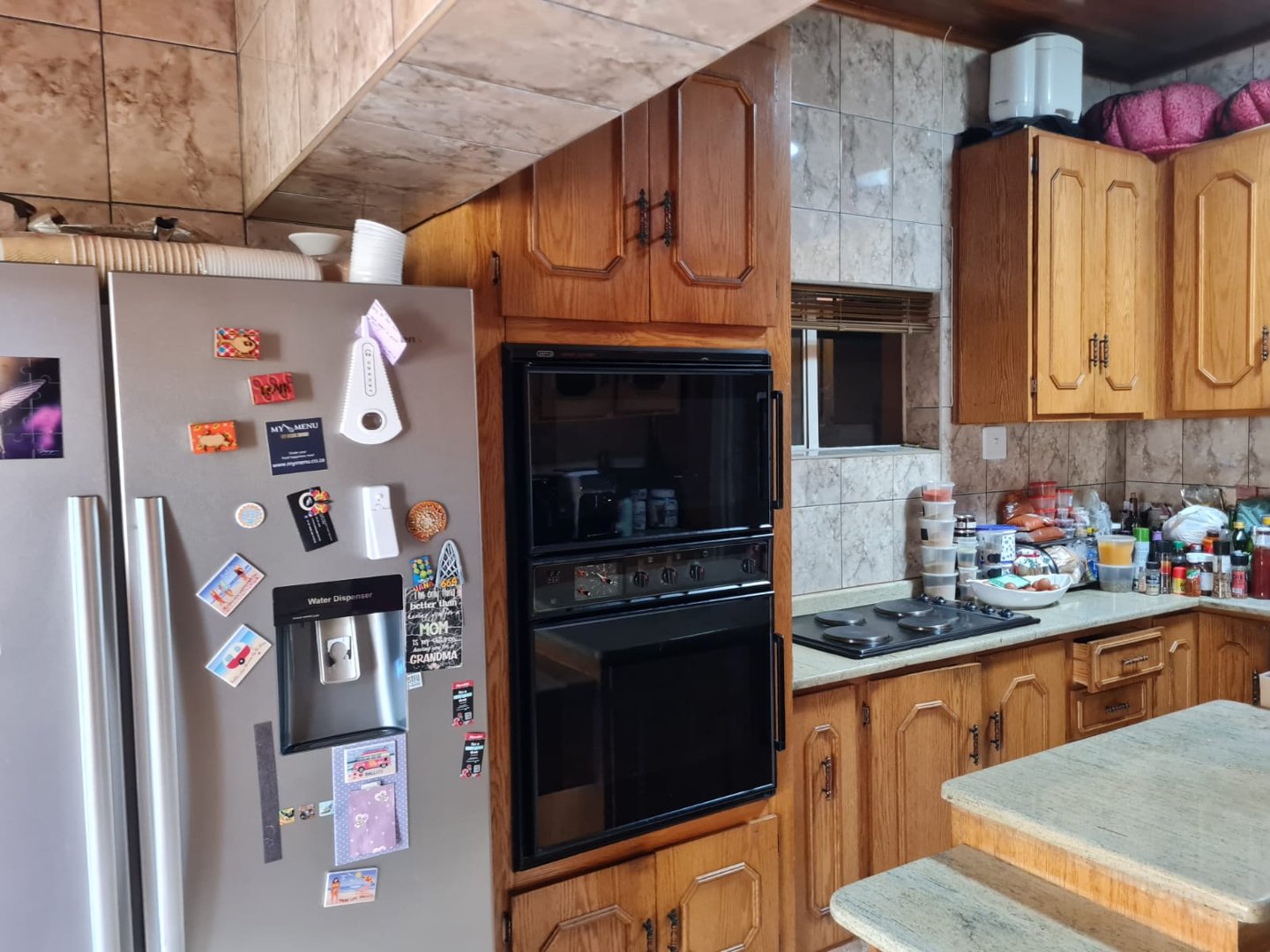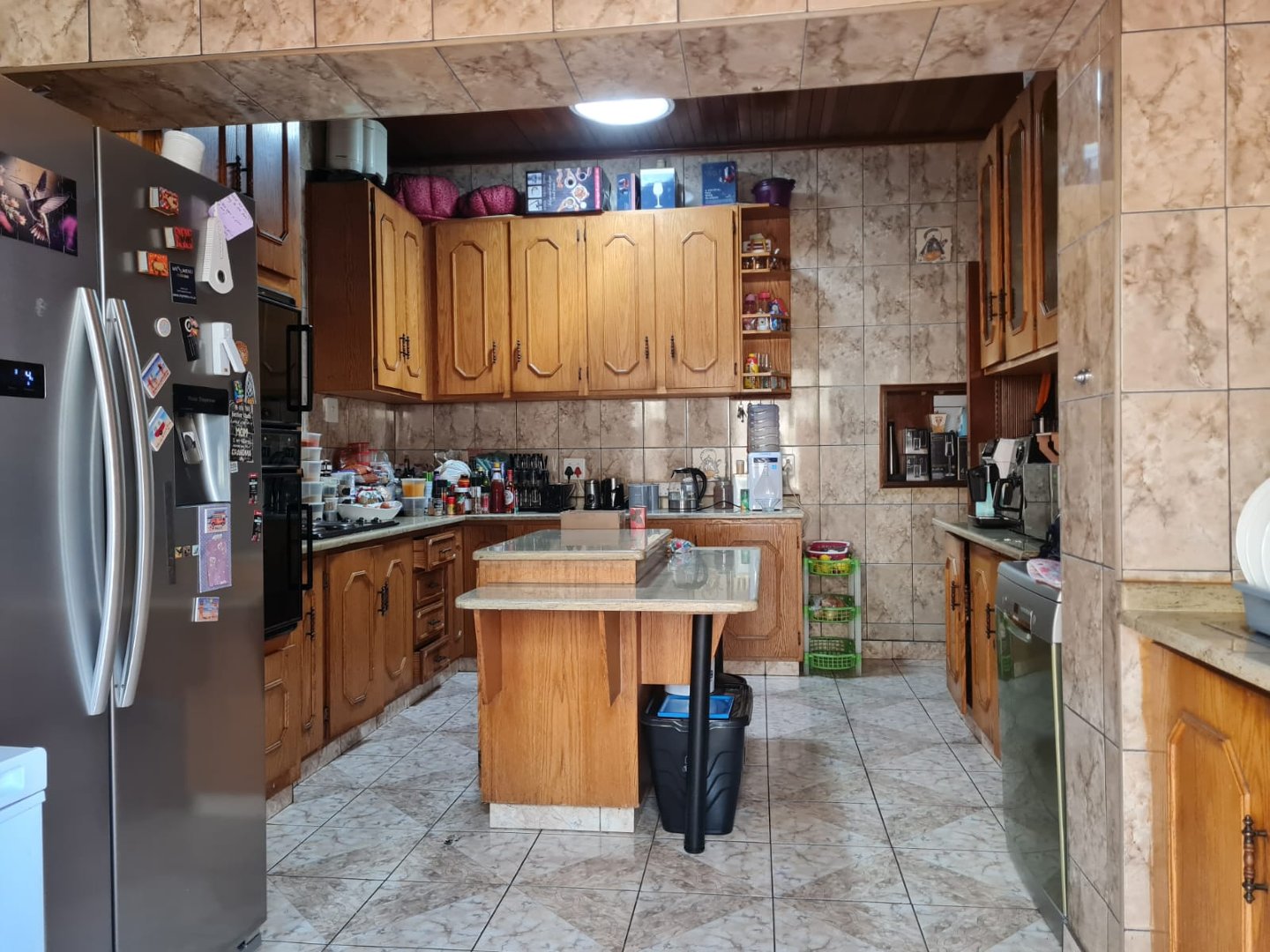 This home caters for a mid-sized family with enough space for everyone. The entrance has a lovely feeling and leads to a very spacious lounge and dining area with knotty pine ceilings and tiled surfaces with pillars which in turn leads to the kitchen and then backyard.