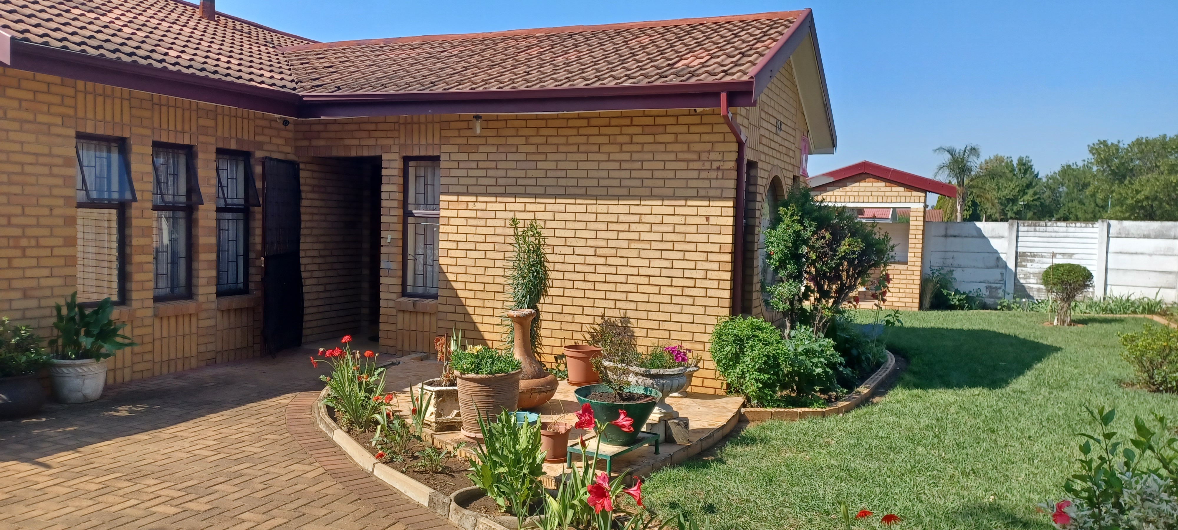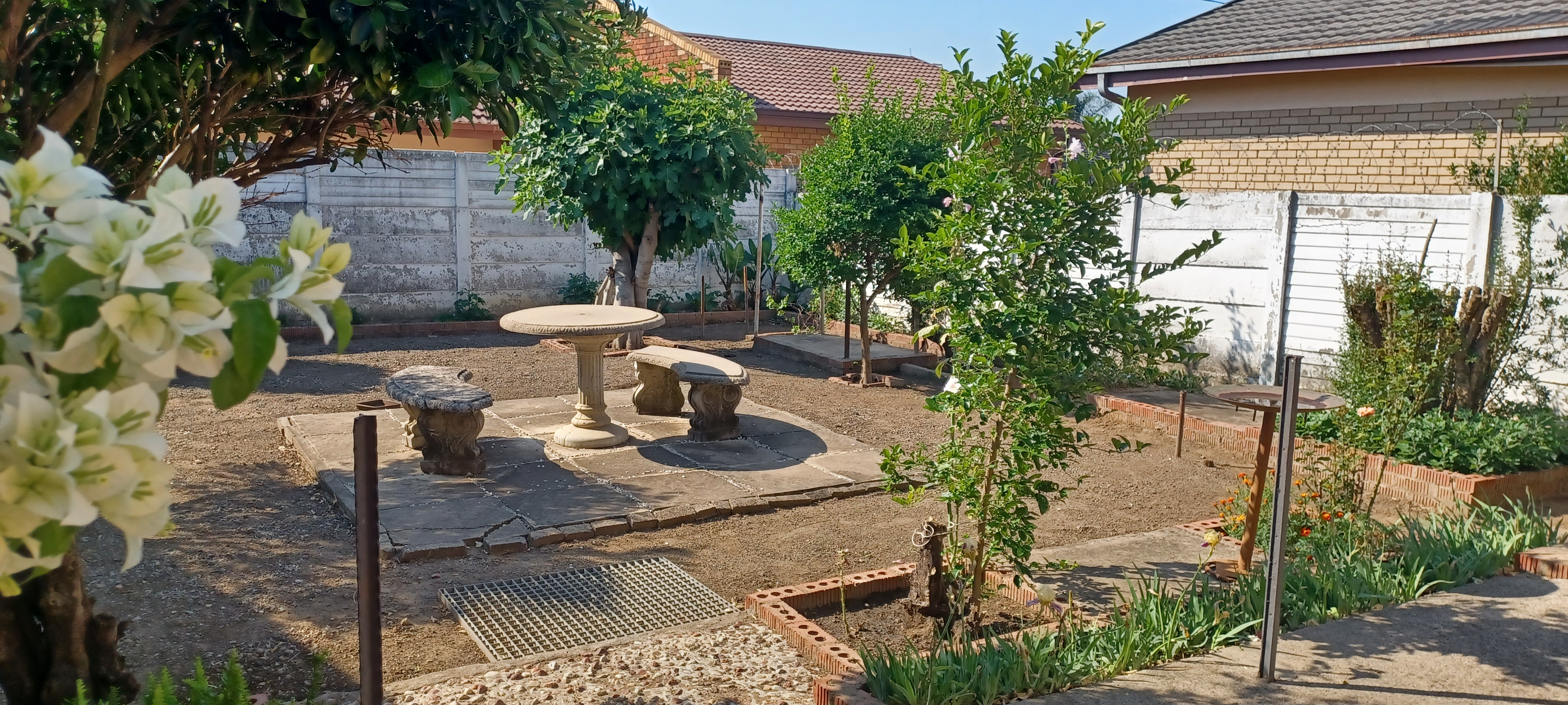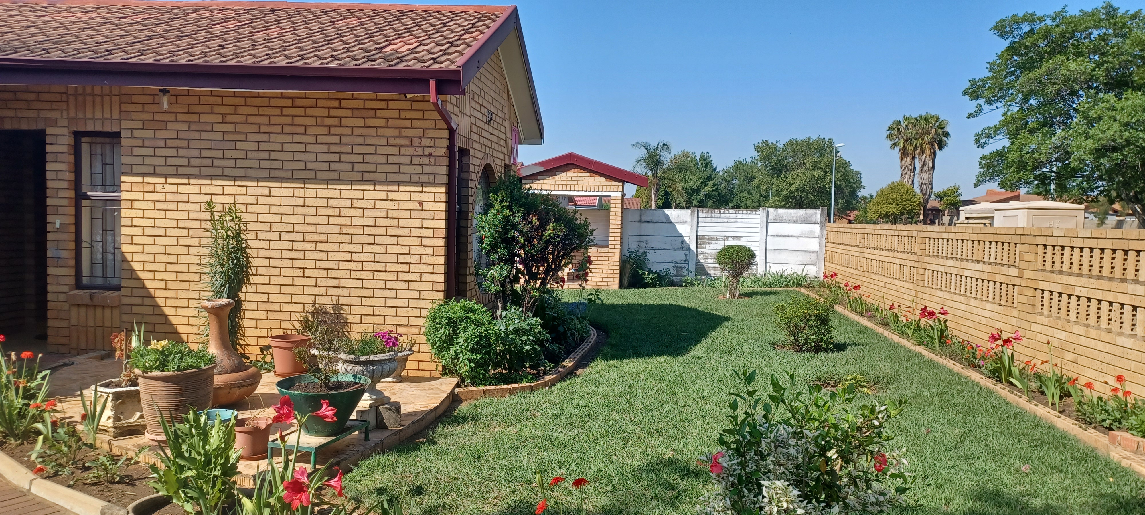 The whole property is walled and burglarproofed. Step outside to discover a lush green lawn, flower garden, herb garden as well as lot of fruit trees that surround the brick house, that needs. minimum upkeep. The Granny Flat has two bedrooms, Lounge, Kitchenette and bathroom with 2 toilets (one separate). Outside is low maintenance.