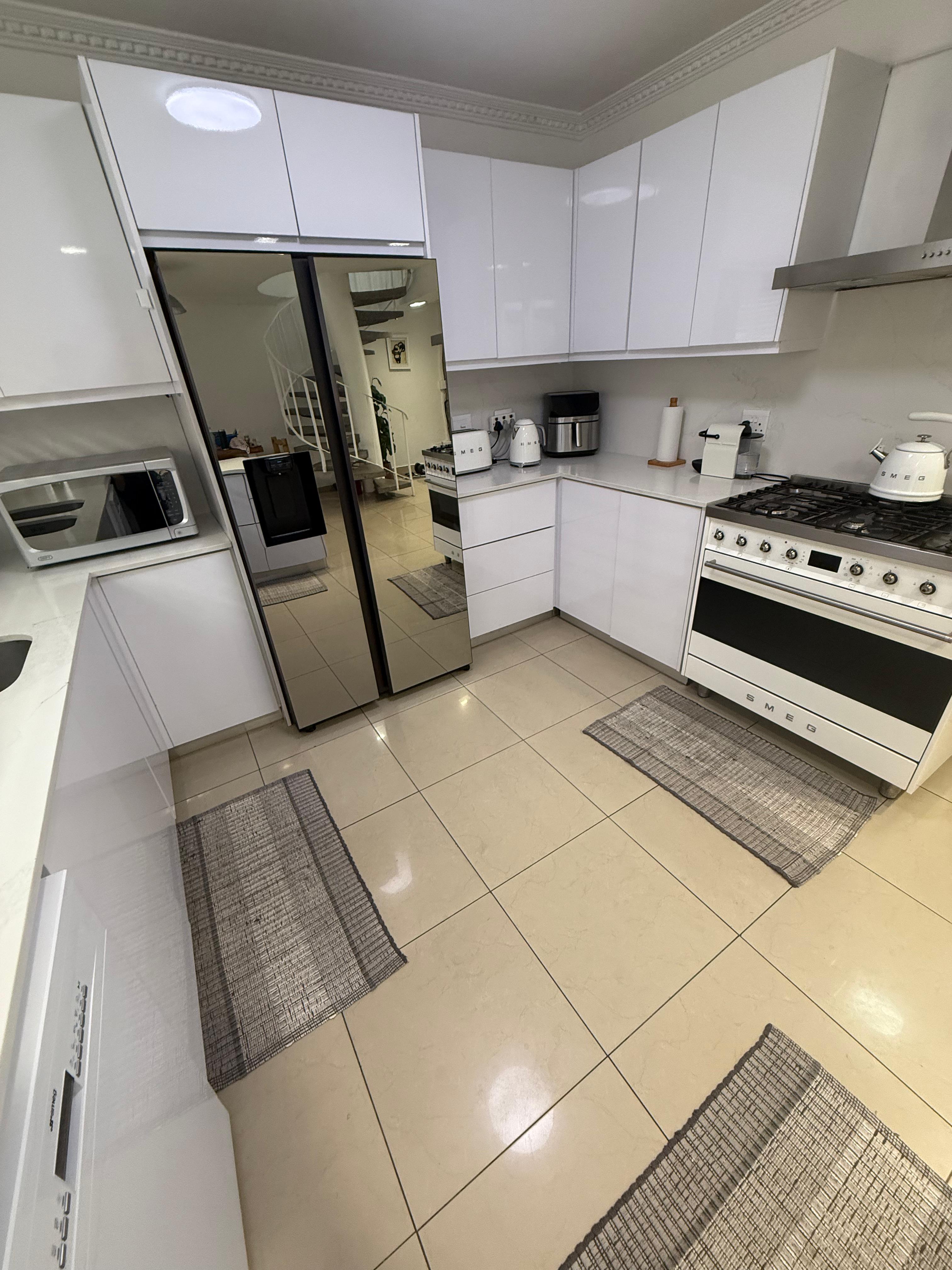 This spacious family home is set over two floors. Downstairs, you'll discover the main open-plan living area. At the heart of this space is the fitted kitchen, which flows seamlessly into the lounge and dining area. The kitchen, though small, is well-equipped with a gas hob, electric oven, laminated cupboards, breakfast nook, and granite countertops, with space for one appliance.