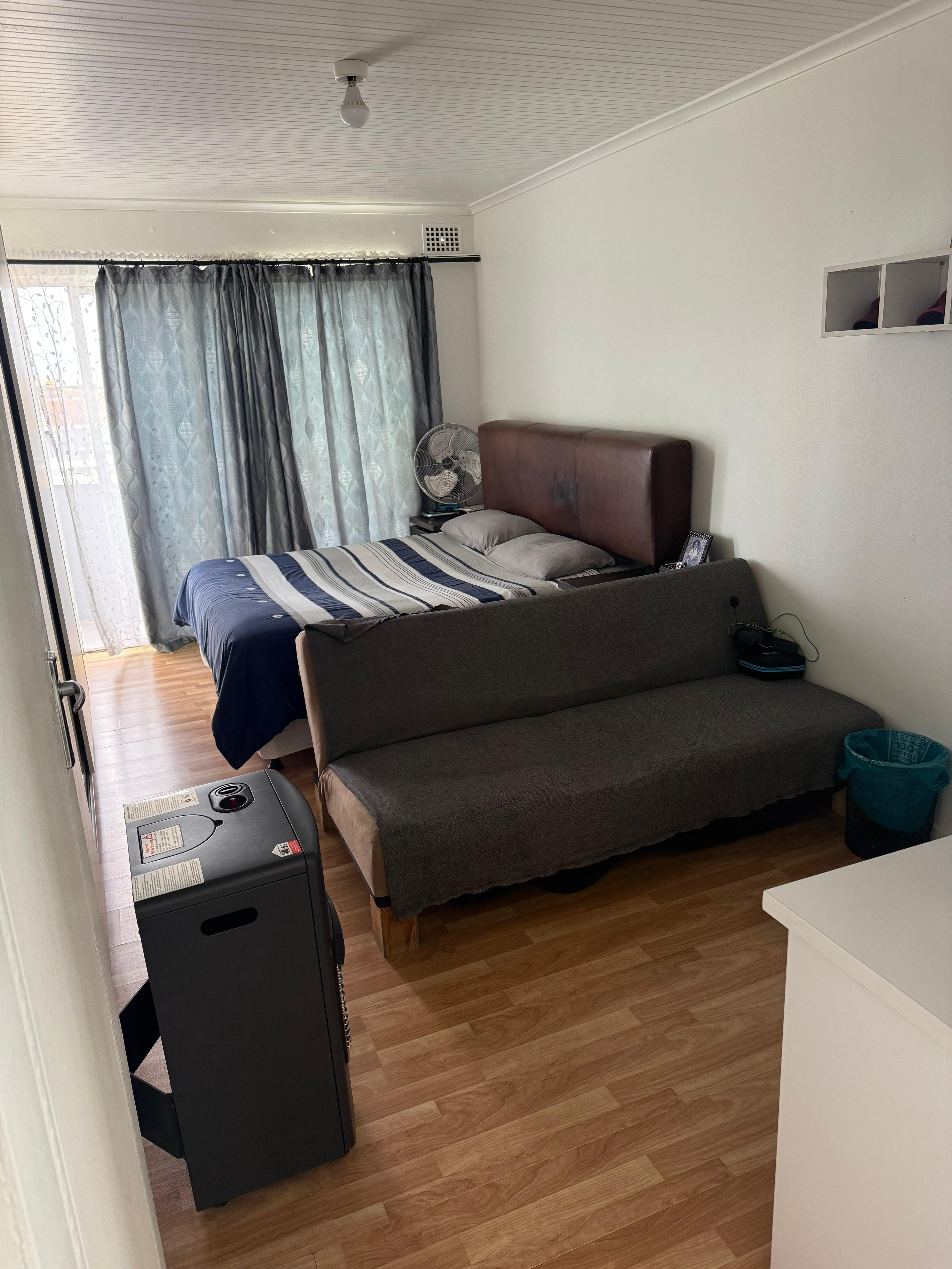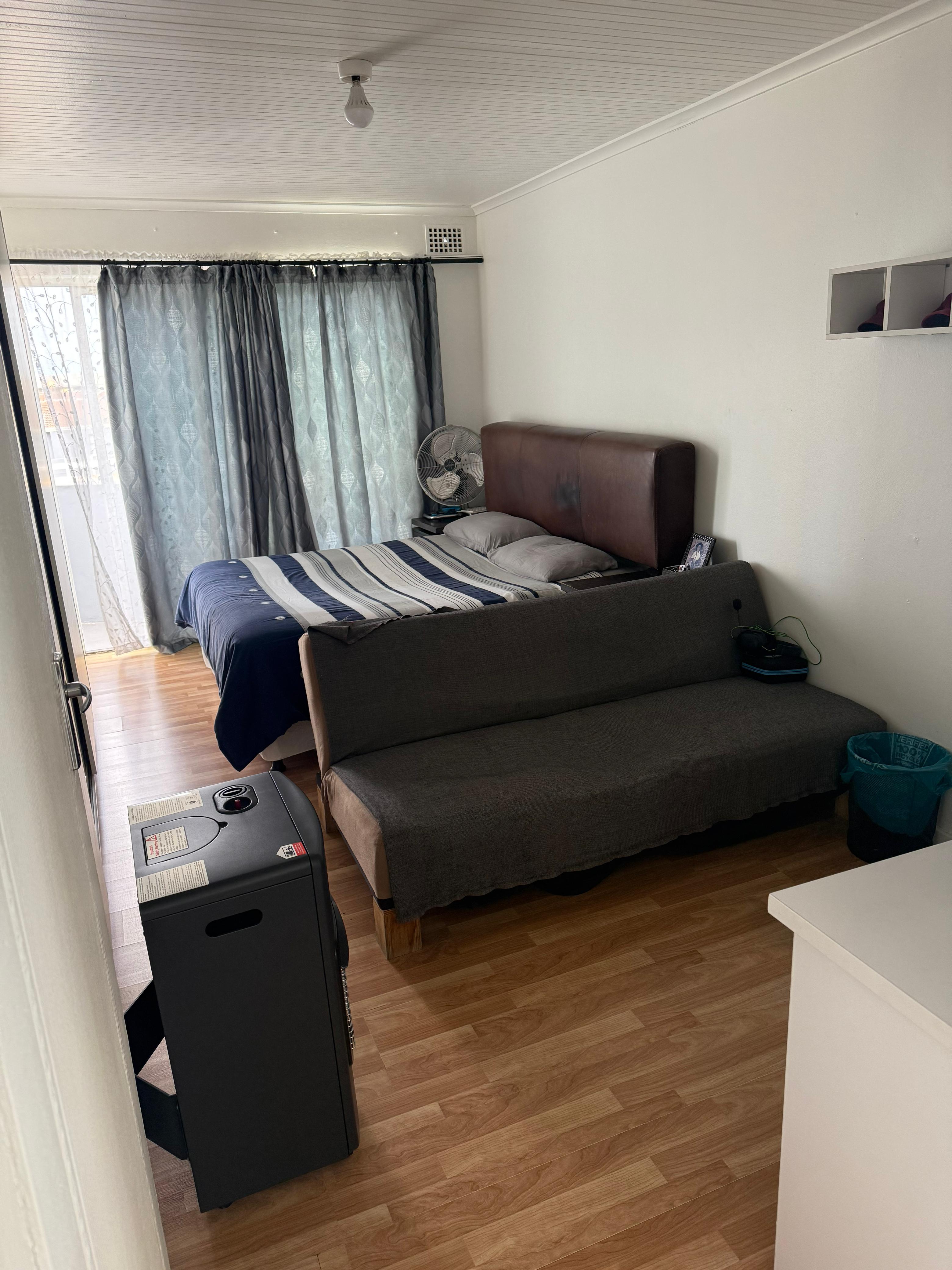 Step outside and enjoy the private garden with its water feature and low-maintenance artificial lawn. There is a courtyard and a dedicated braai area for outdoor enjoyment. The property's security features include a fully-enclosed yard, walls, remote-controlled garage, burglar bars, and security gates. Additional features include fibre internet, prepaid electricity, a linen cupboard, a borehole with a pump, and a gas geyser outside. The single garage offers space for two vehicles.