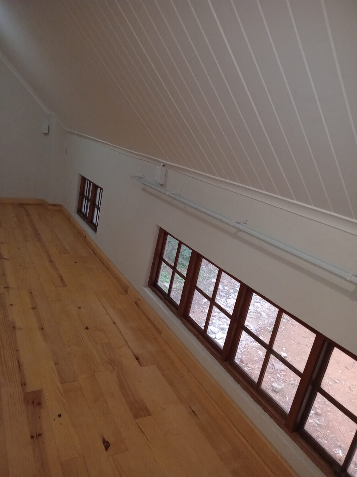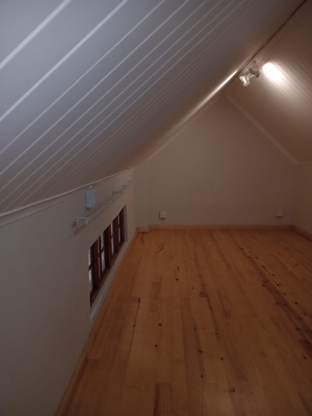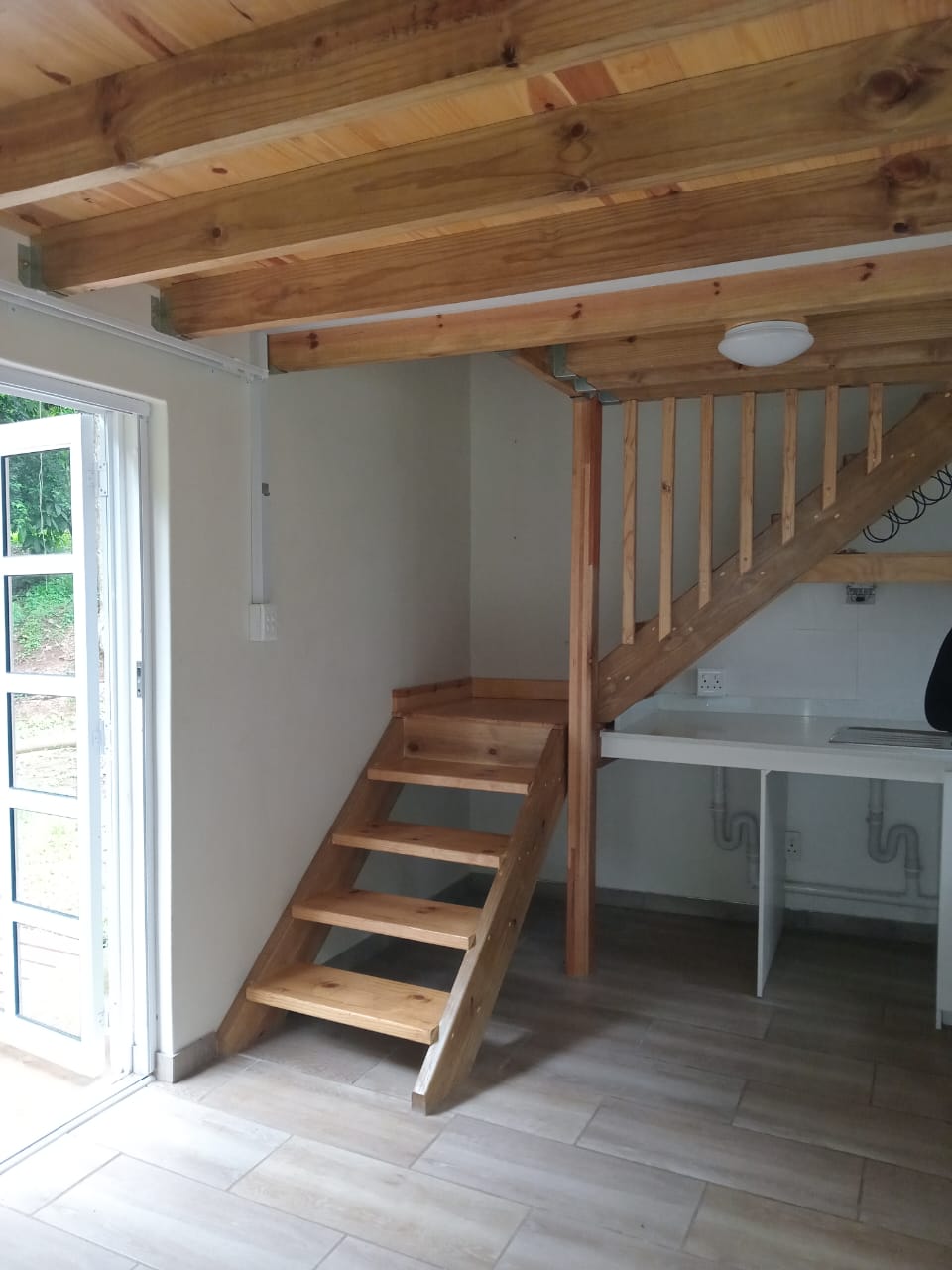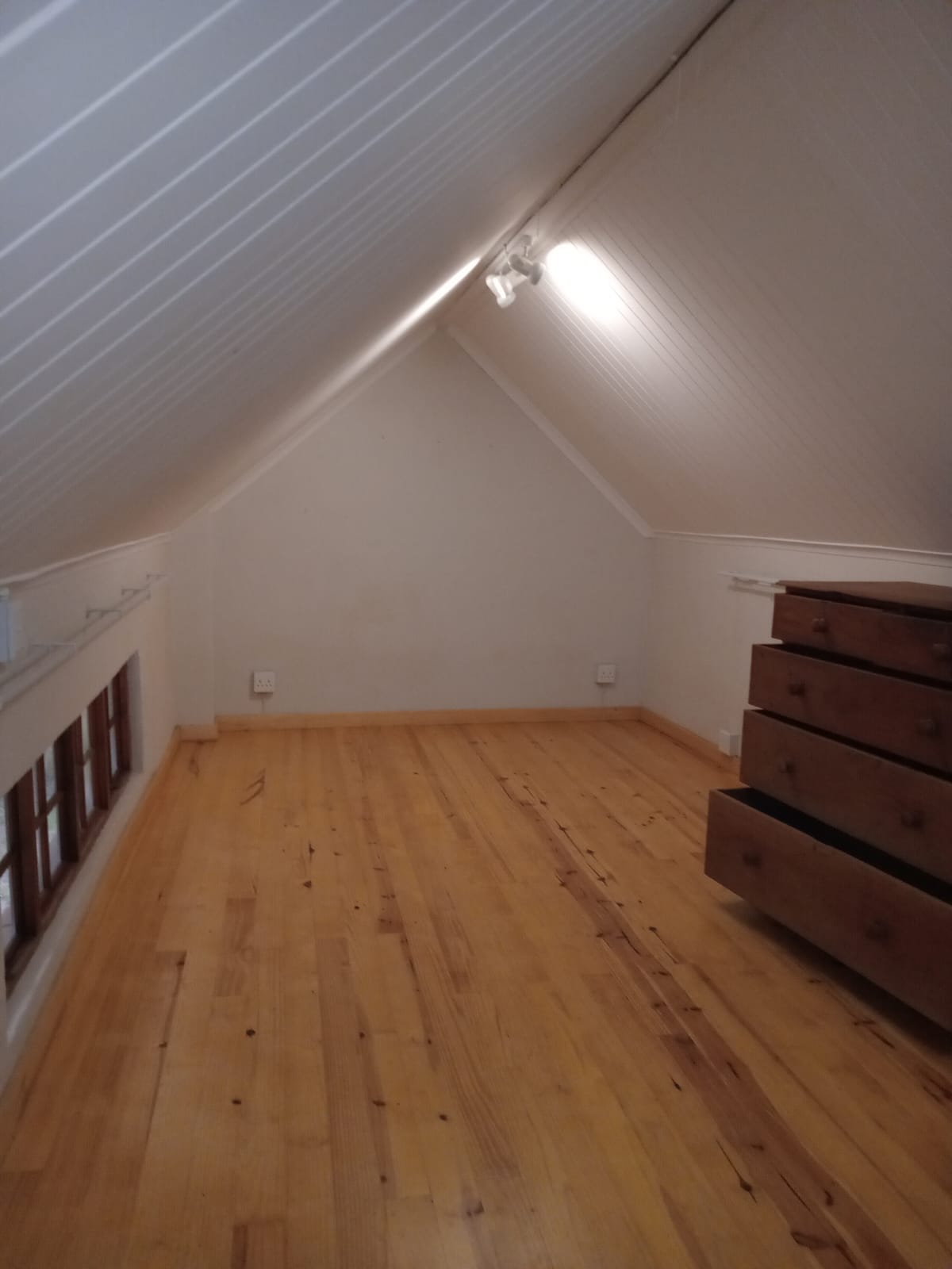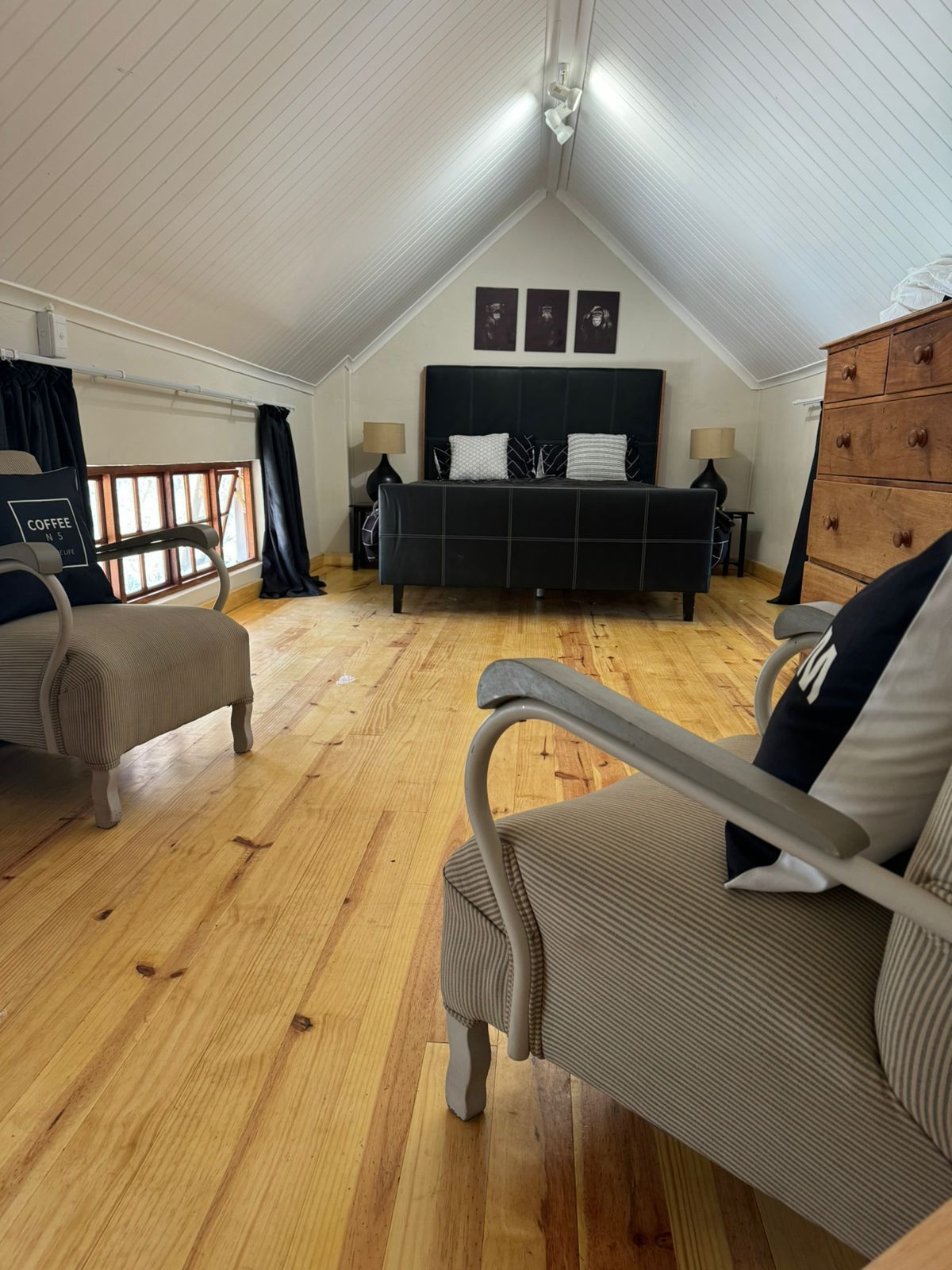 One spacious loft bedroom. Open plan living area, kitchen and bathroom downstairs.