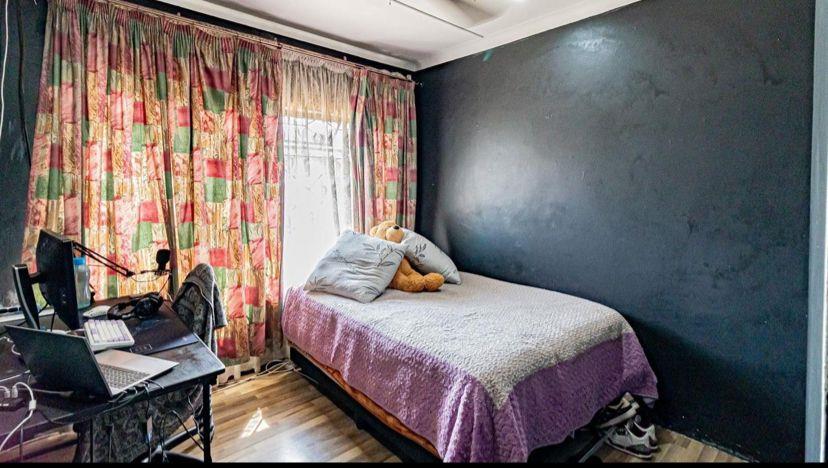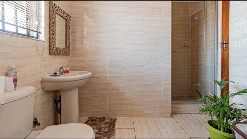 The home boasts three sunny bedrooms, each featuring laminated floors and built-in cupboards. The master bedroom includes an en-suite bathroom, while the second bathroom is equipped with a shower, bath, and toilet. The sizeable kitchen is a delight for any home cook, providing ample storage and space for all your appliances, perfect for preparing family meals.