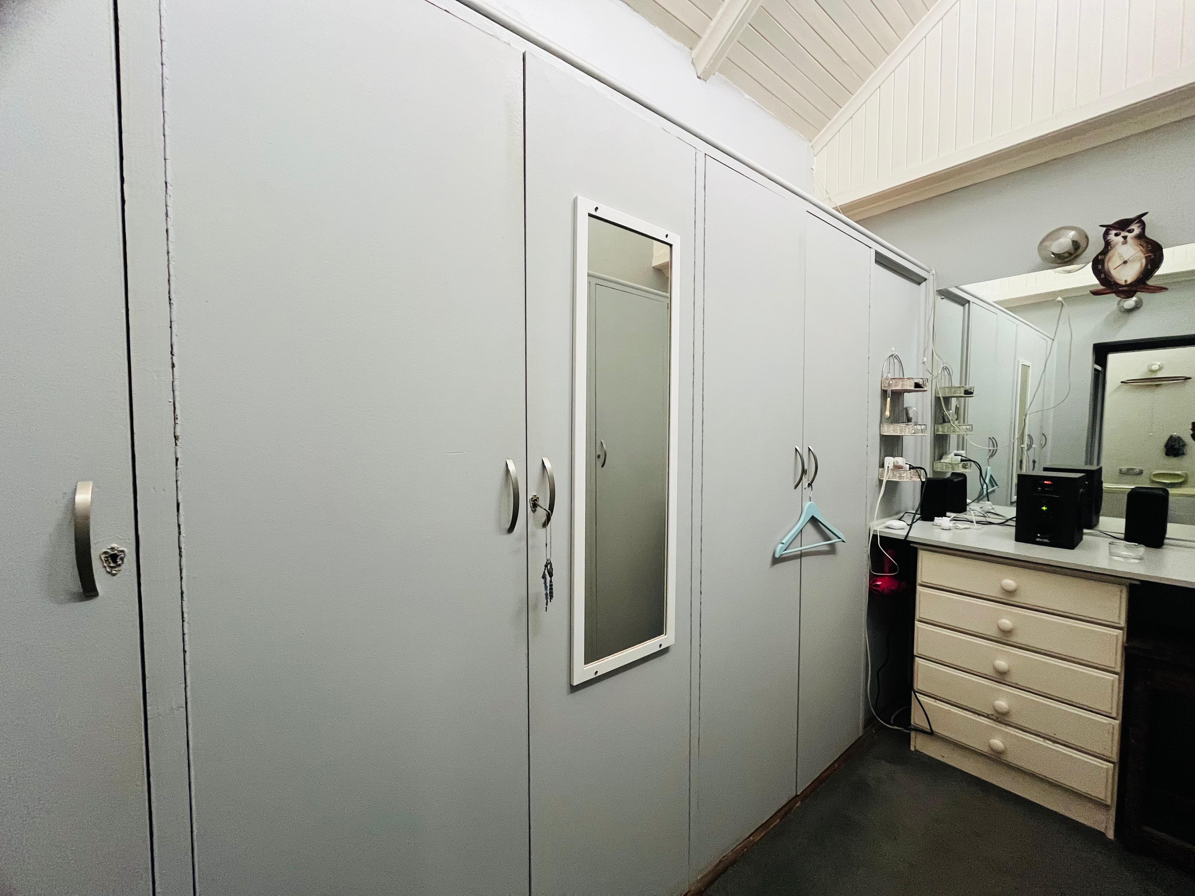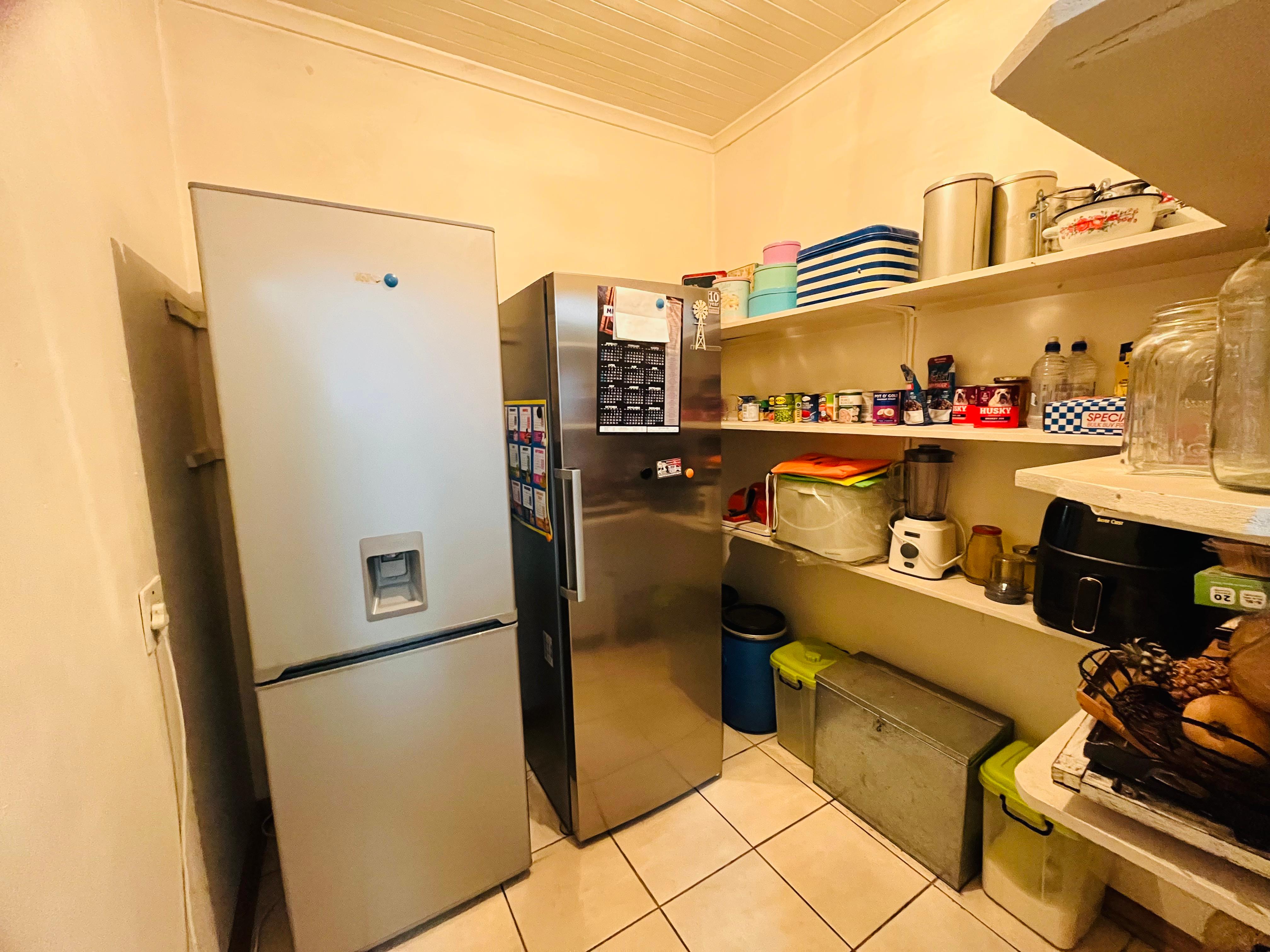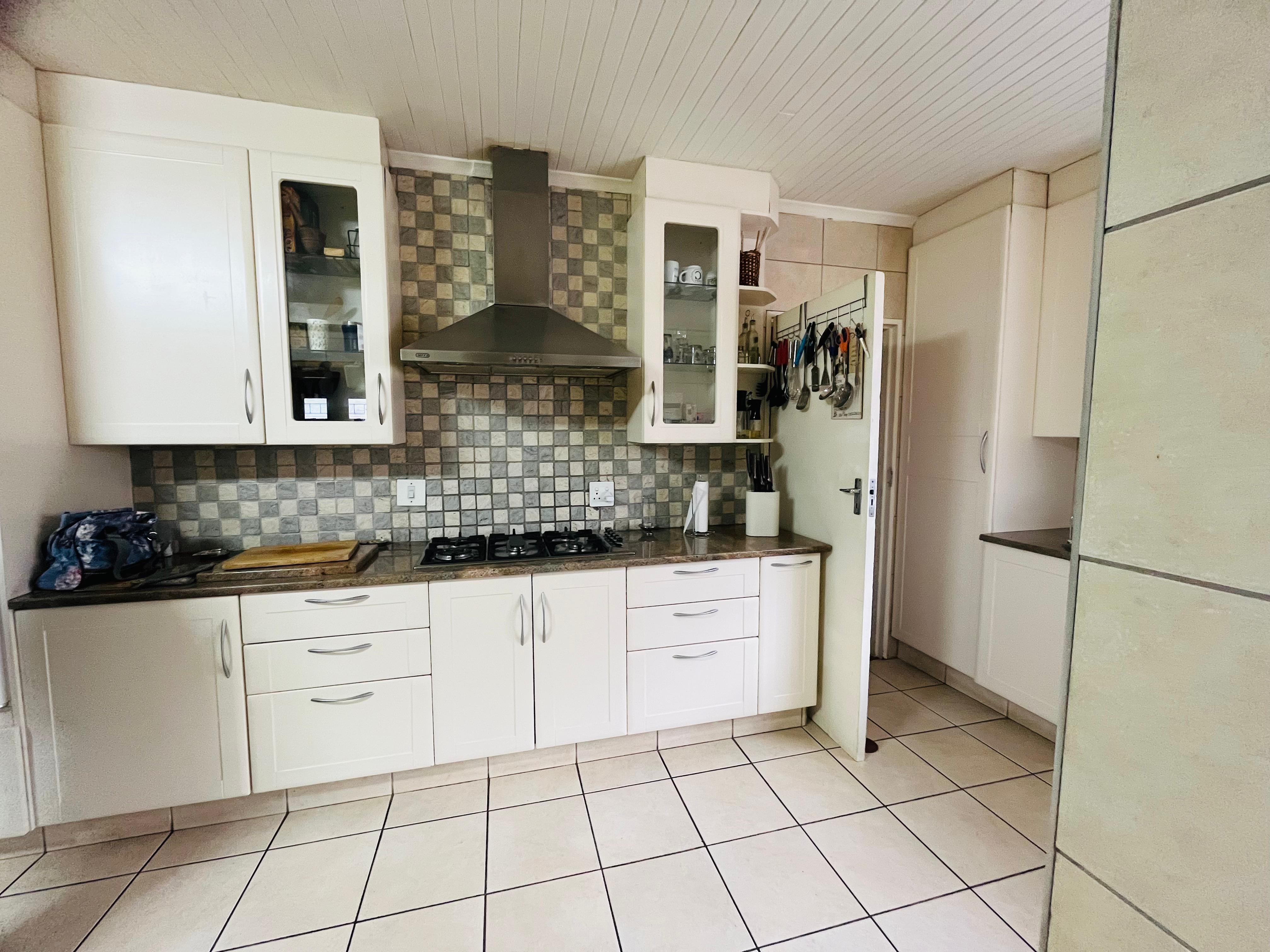 The kitchen is a home chef’s dream, offering ample cupboard space, gas hob, eye-level electric oven, a walk-in pantry, and a separate scullery for easy organization.