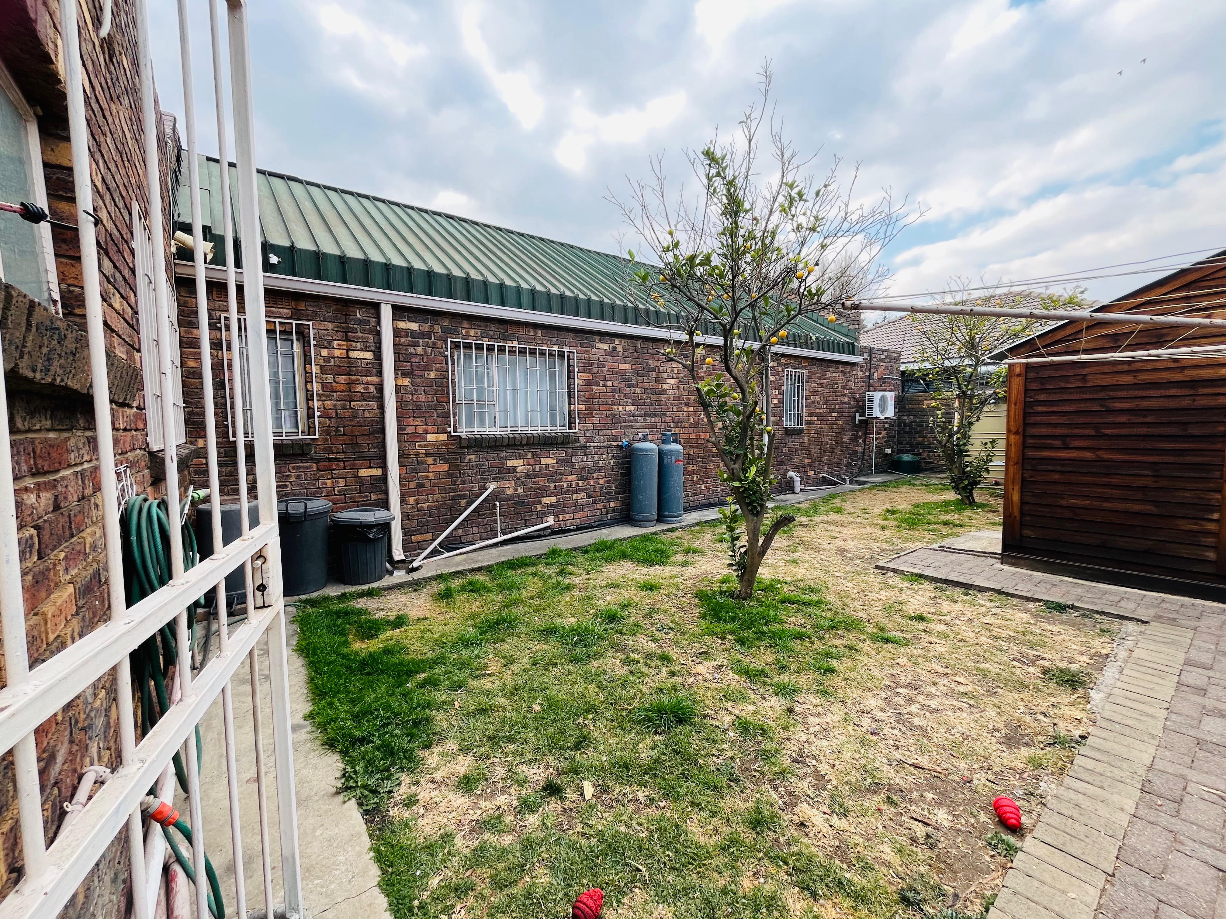 The outdoor area is a true highlight, featuring a landscaped garden, a sparkling pool, lapa with built-in braai, two Wendy houses, and an outside bathroom. A JoJo tank and borehole provide reliable water supply.