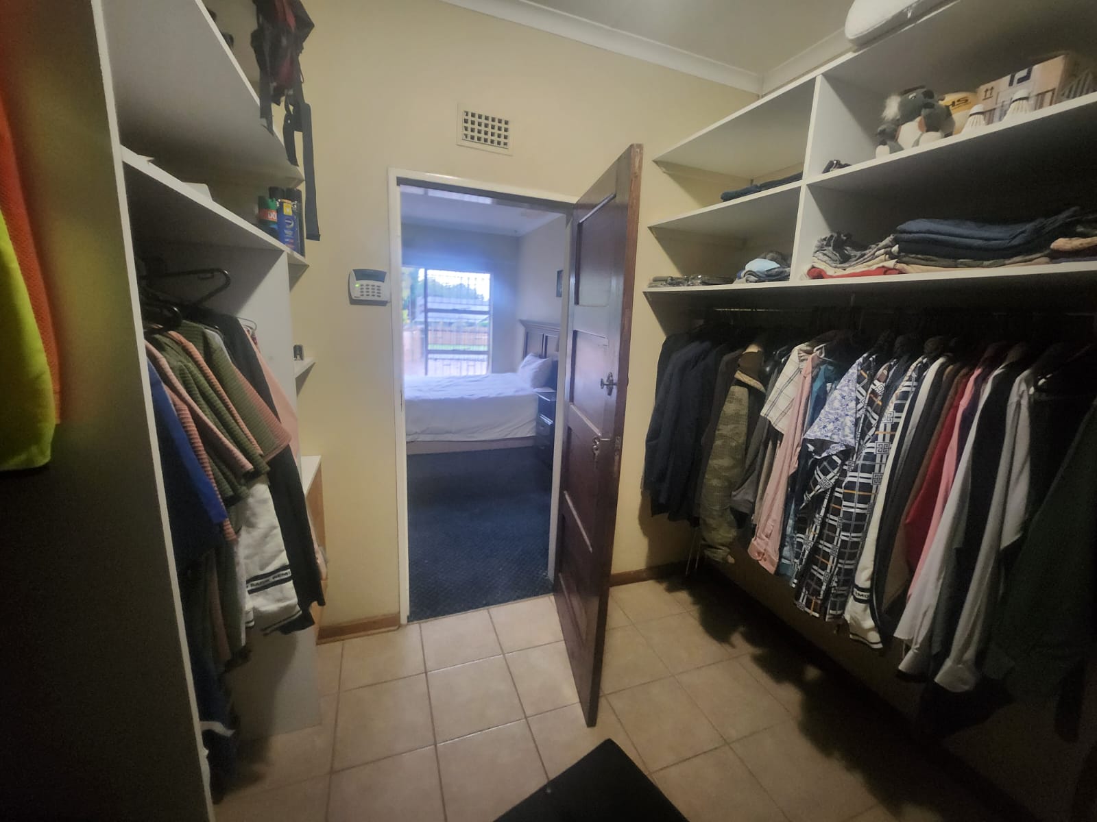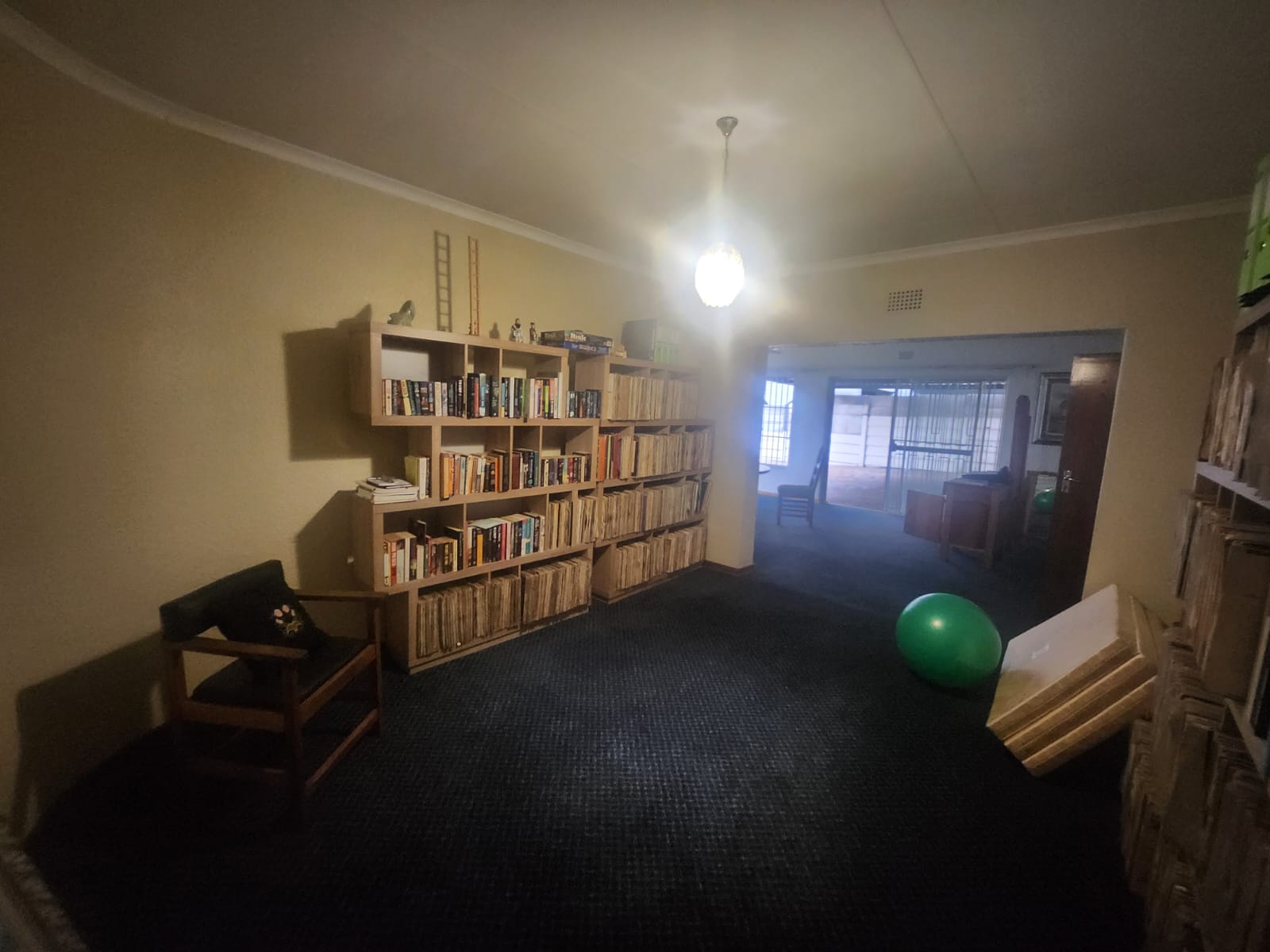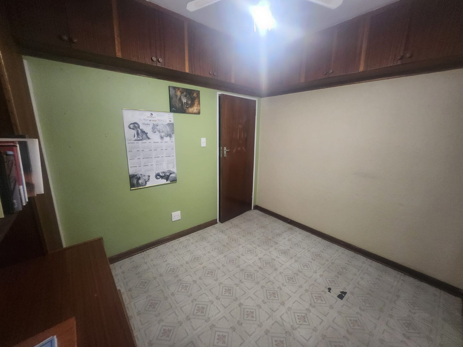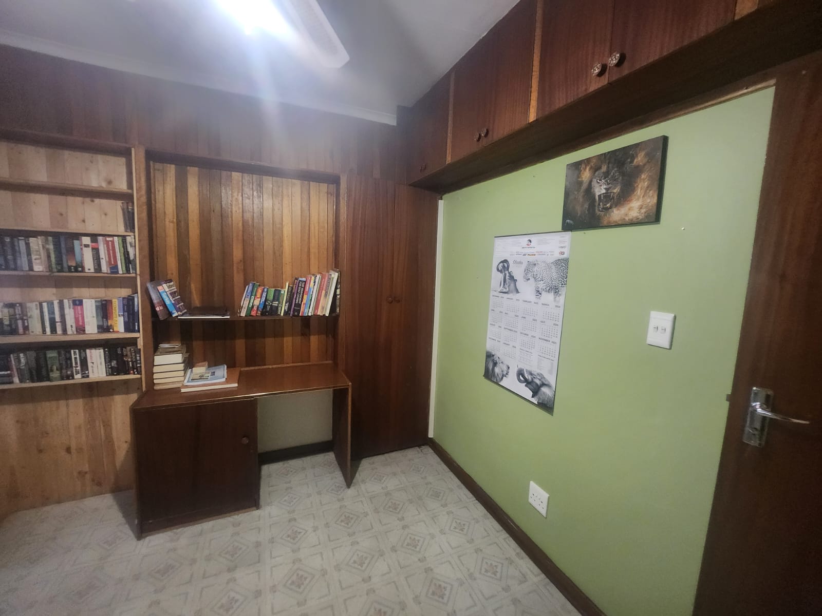 The home features three spacious bedrooms, each with built-in cupboards, plus a dedicated office/study fitted with bookshelves and additional storage.