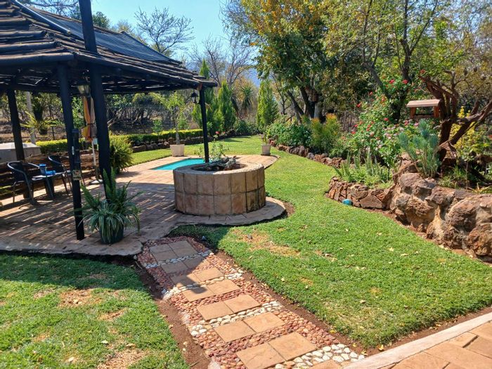 Country manor near Bela Bela with sweeping views, expansive indigenous gardens and a 24‑variety fruit orchard, strong borehole and irrigation — three-bedroom, two-bath home with three garages.
