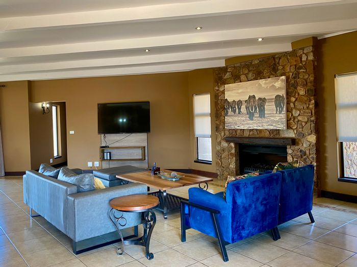 Entertainer's retreat on Zebula’s Golden Mile with sweeping Waterberg and golf-course views, massive entertainment area with built-in bar and double covered patios; four bedrooms and four bathrooms.