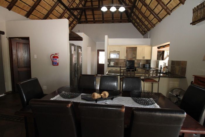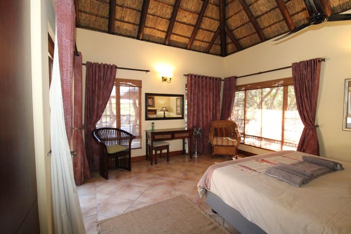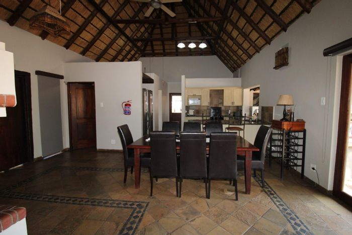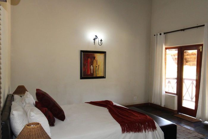 Bushveld entertainer's retreat at Zebula Golf Estate, under two hours from Pretoria; enjoys a pool with built-in braai and boma, upstairs balcony views, and four en-suite bedrooms.