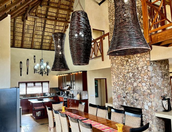 Bushveld entertainer's retreat at Zebula Golf Estate, under two hours from Pretoria; enjoys a pool with built-in braai and boma, upstairs balcony views, and four en-suite bedrooms.