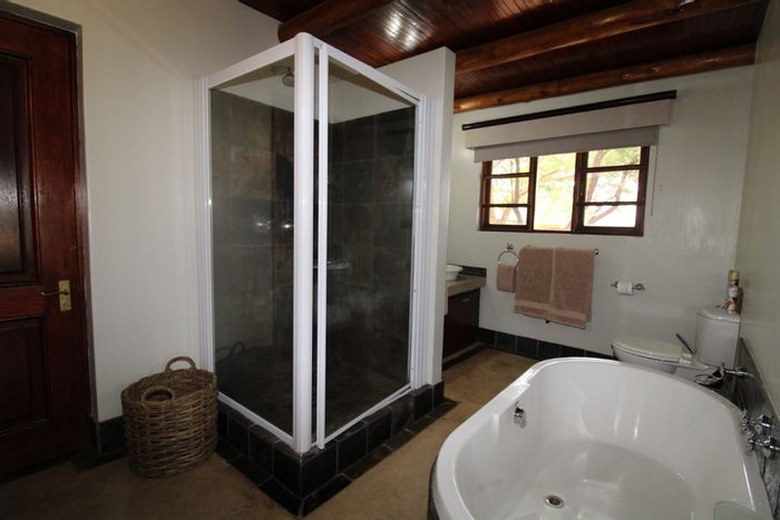 Bushveld entertainer's retreat in Zebula Golf Estate, Waterberg — relax in the jacuzzi lapa overlooking the pool and mountain vistas; four en-suite bedrooms.
