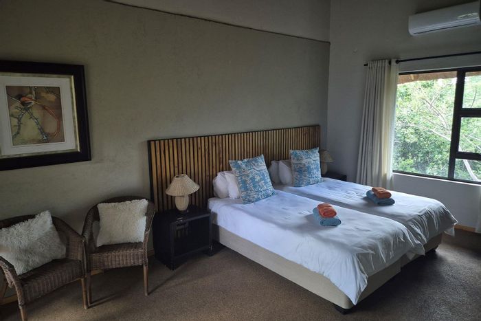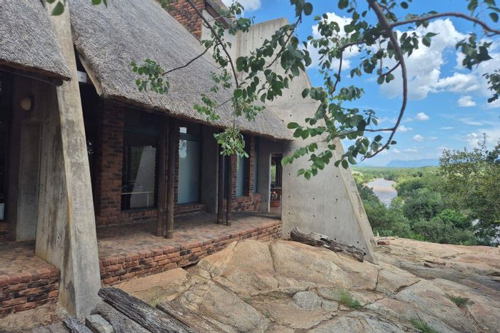 Riverside bushveld living in Umfula with frequent wildlife sightings and Olifants River views; open-plan living flows to a patio with splash pool and boma. Three en-suite bedrooms, double carport.